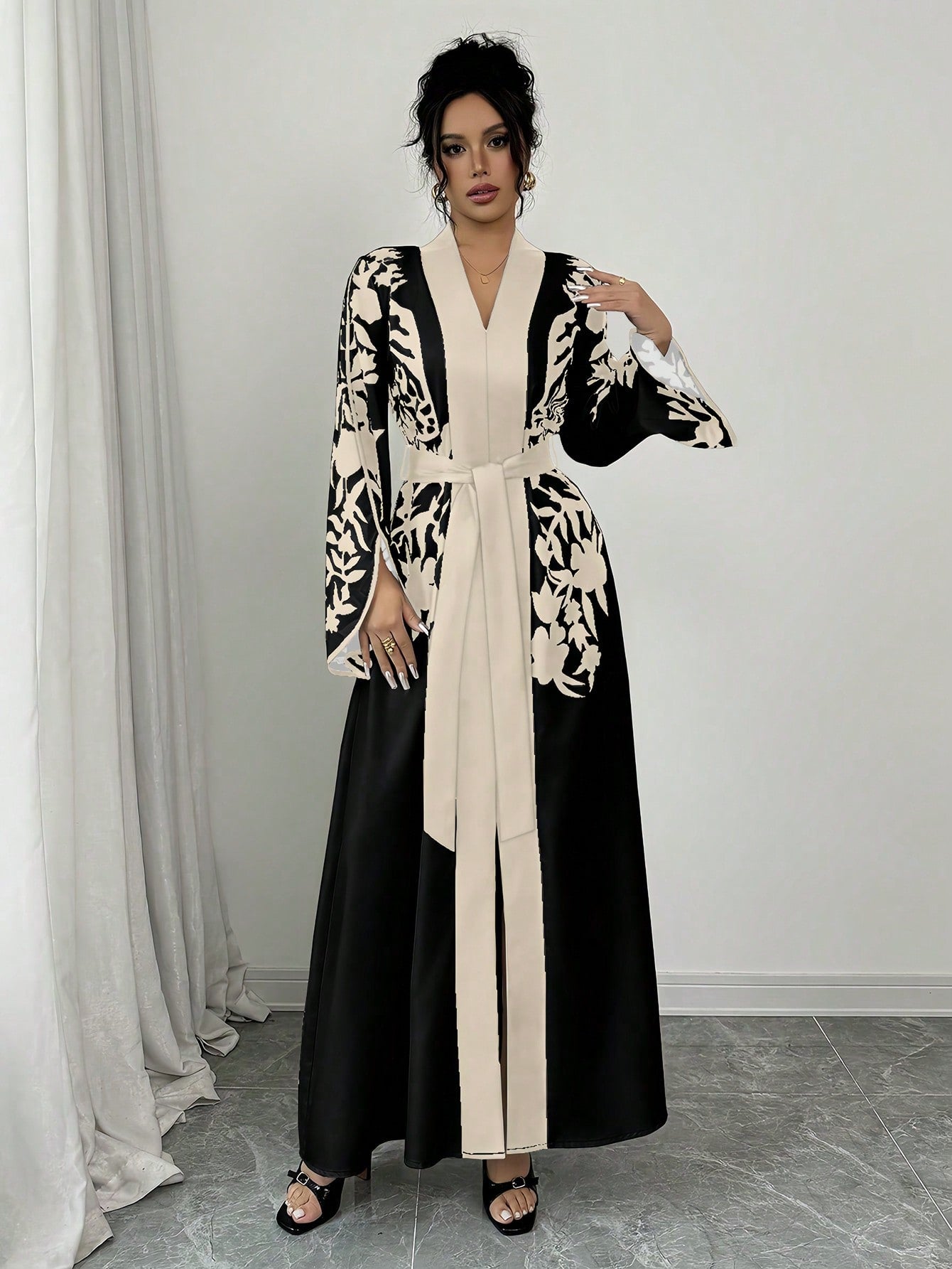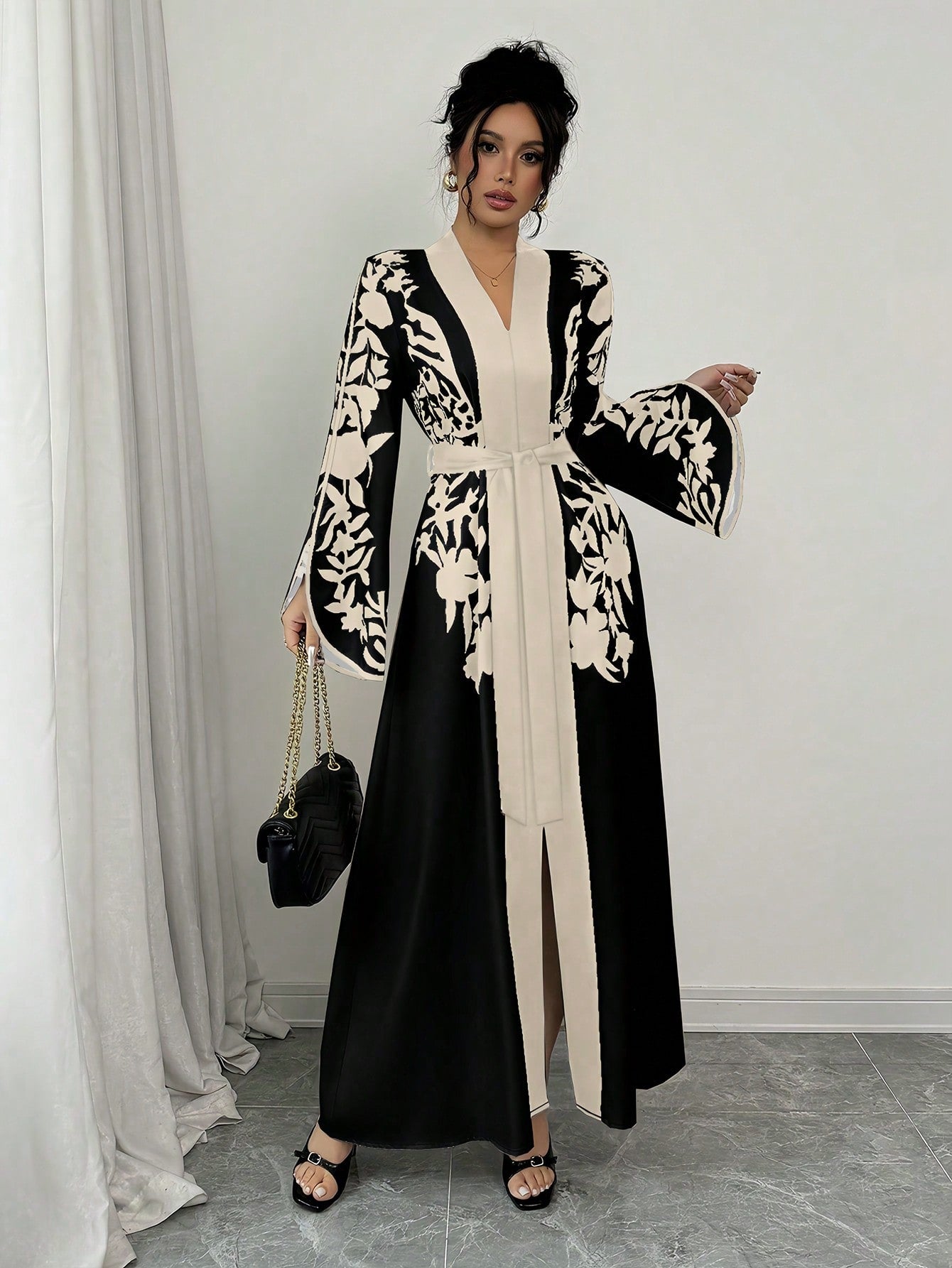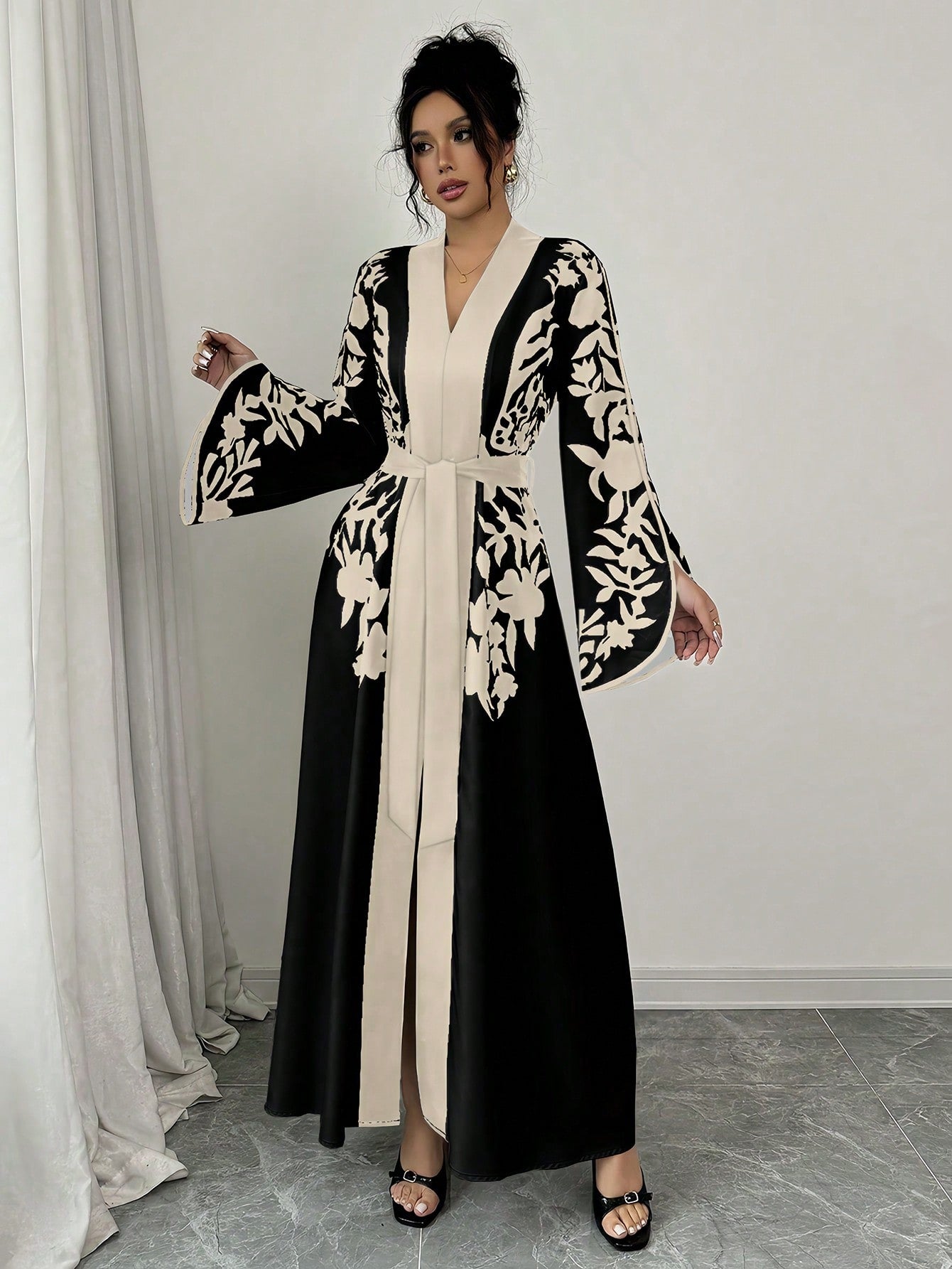فستان طويل أنيق للنساء ذو كم ناقوسي واسع مطبوع