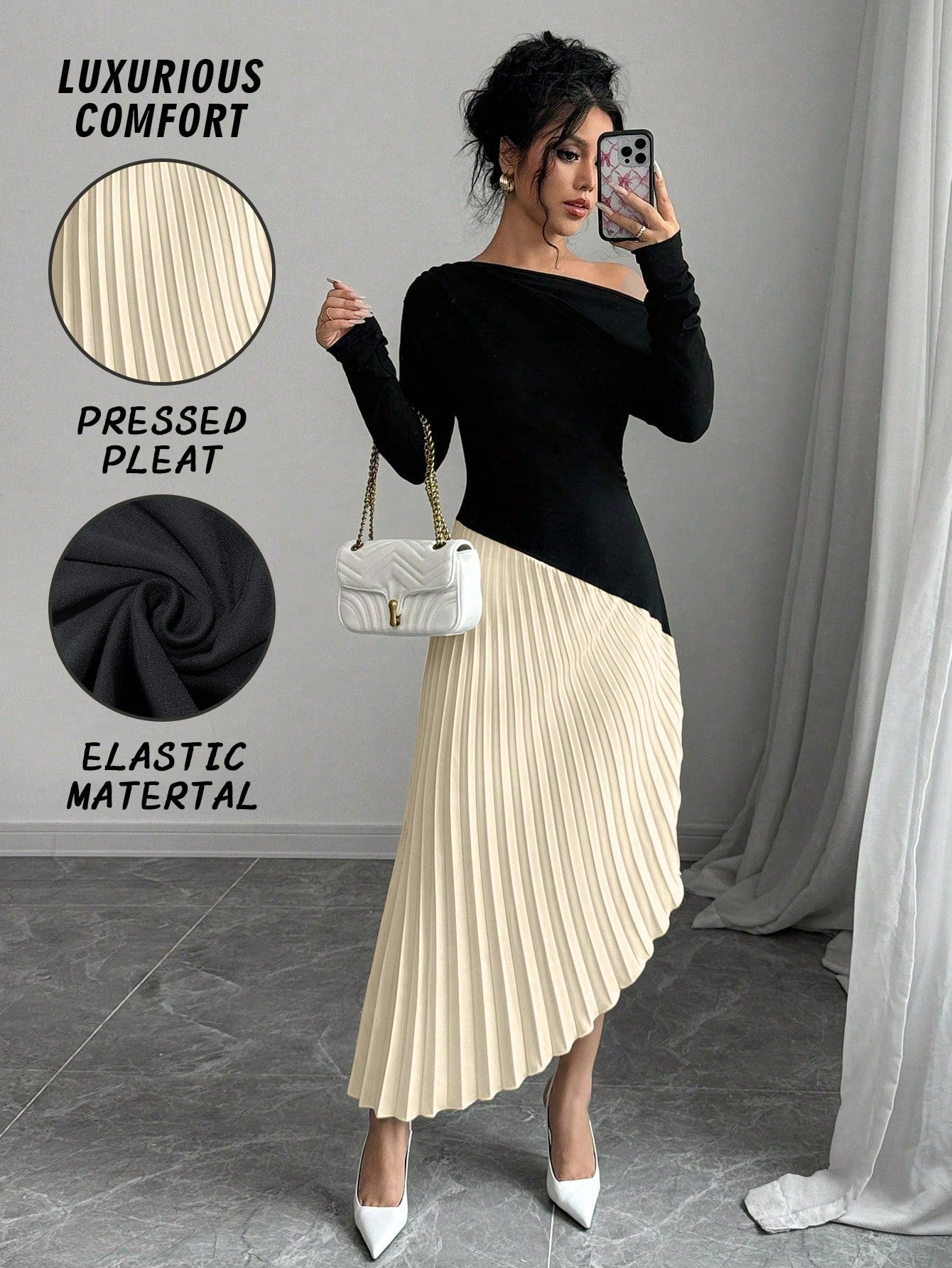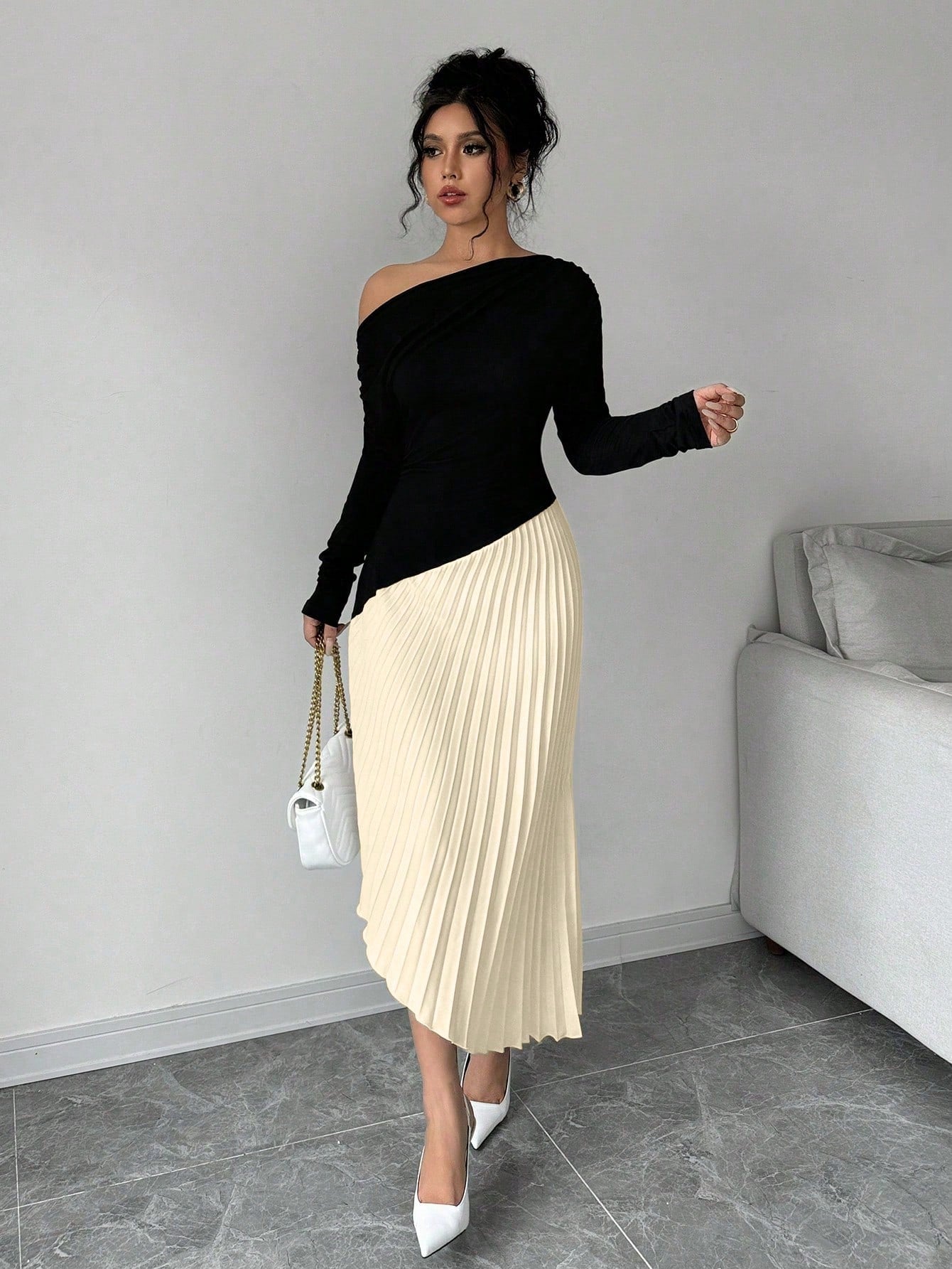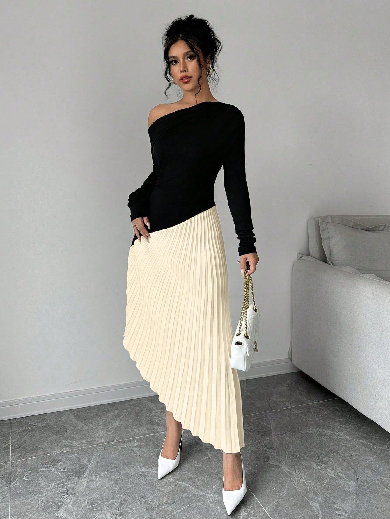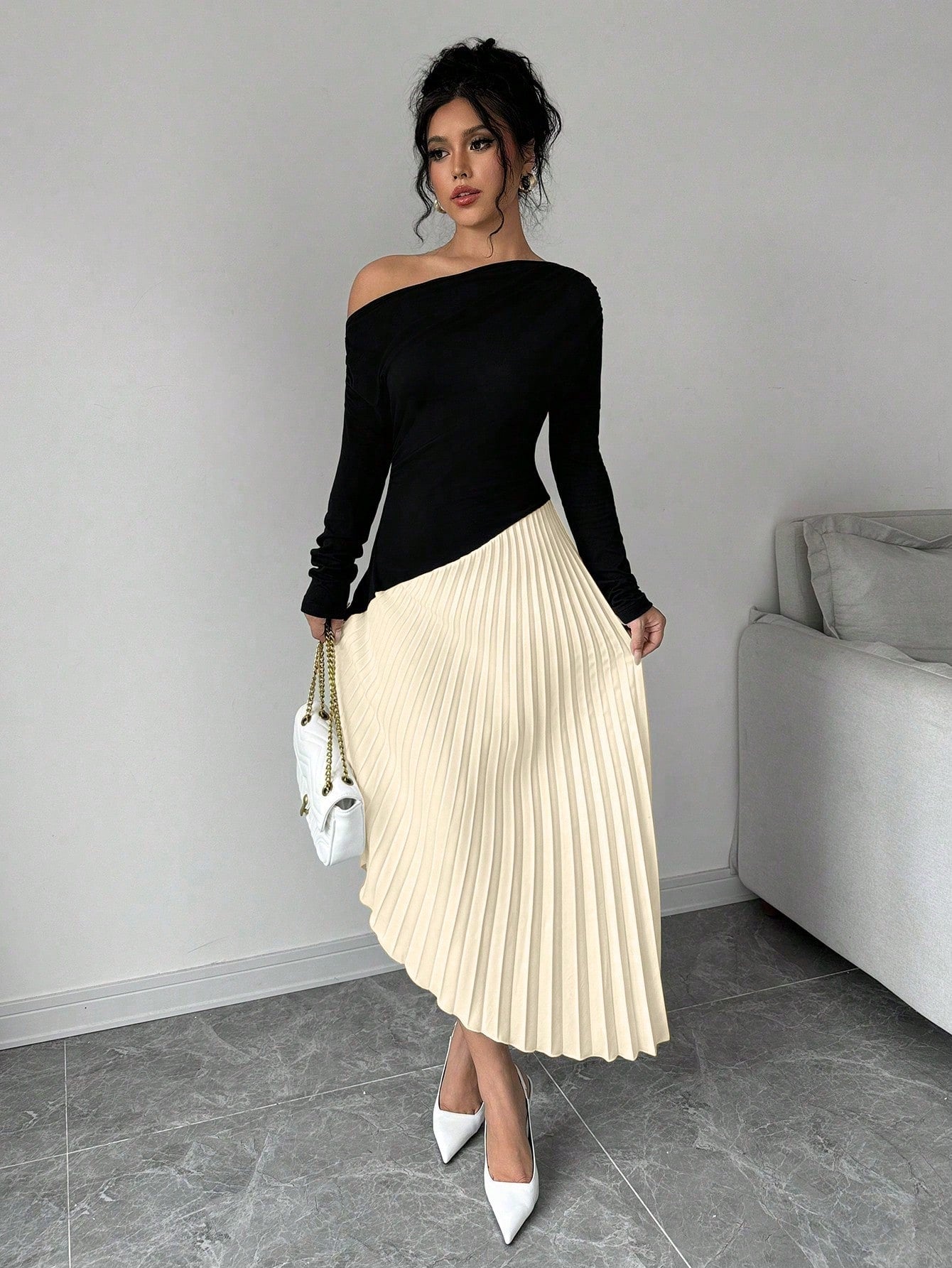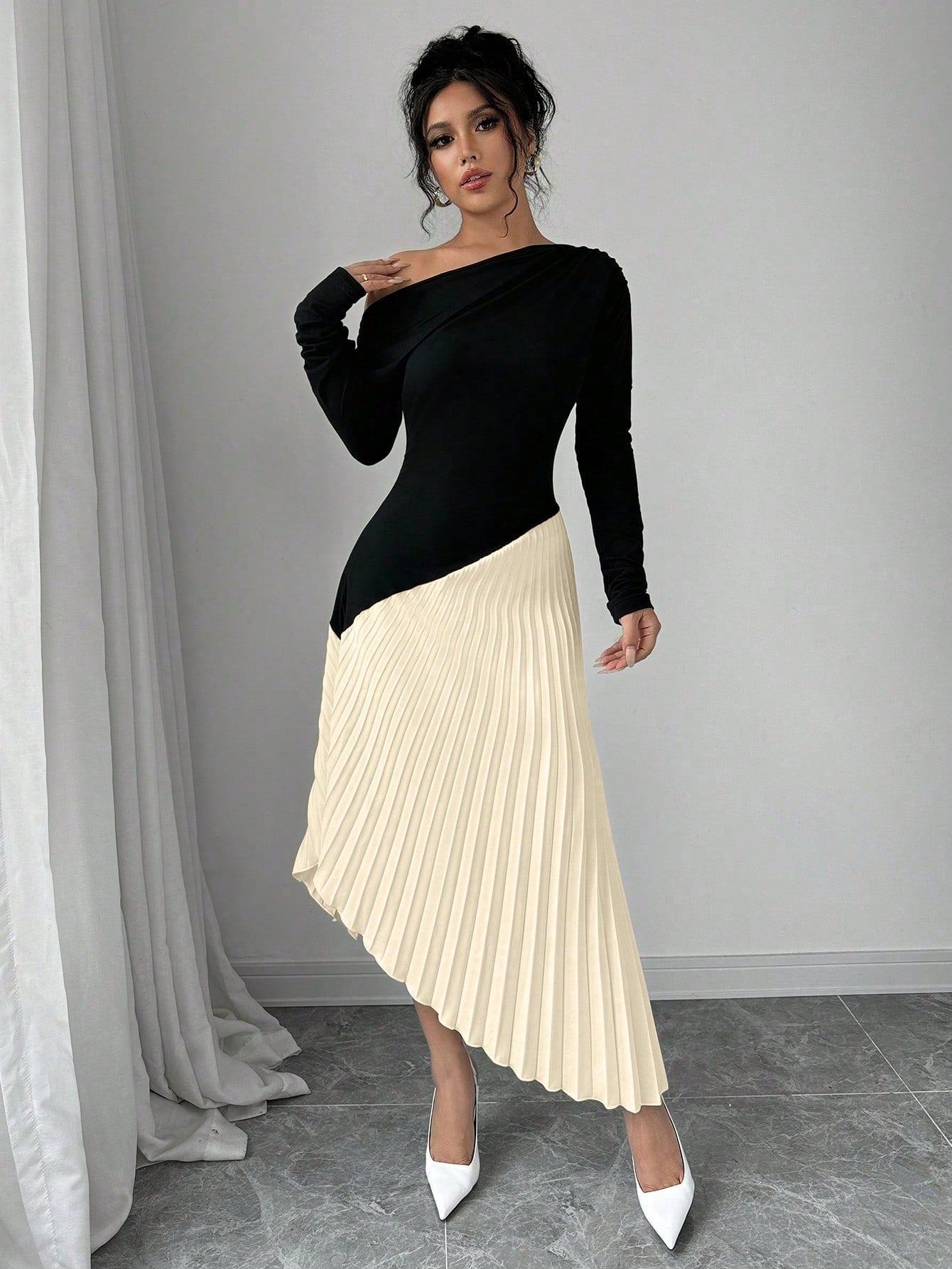 فستان طويل الأكمام مطوي كتف أنيق وبسيط غير متماثل