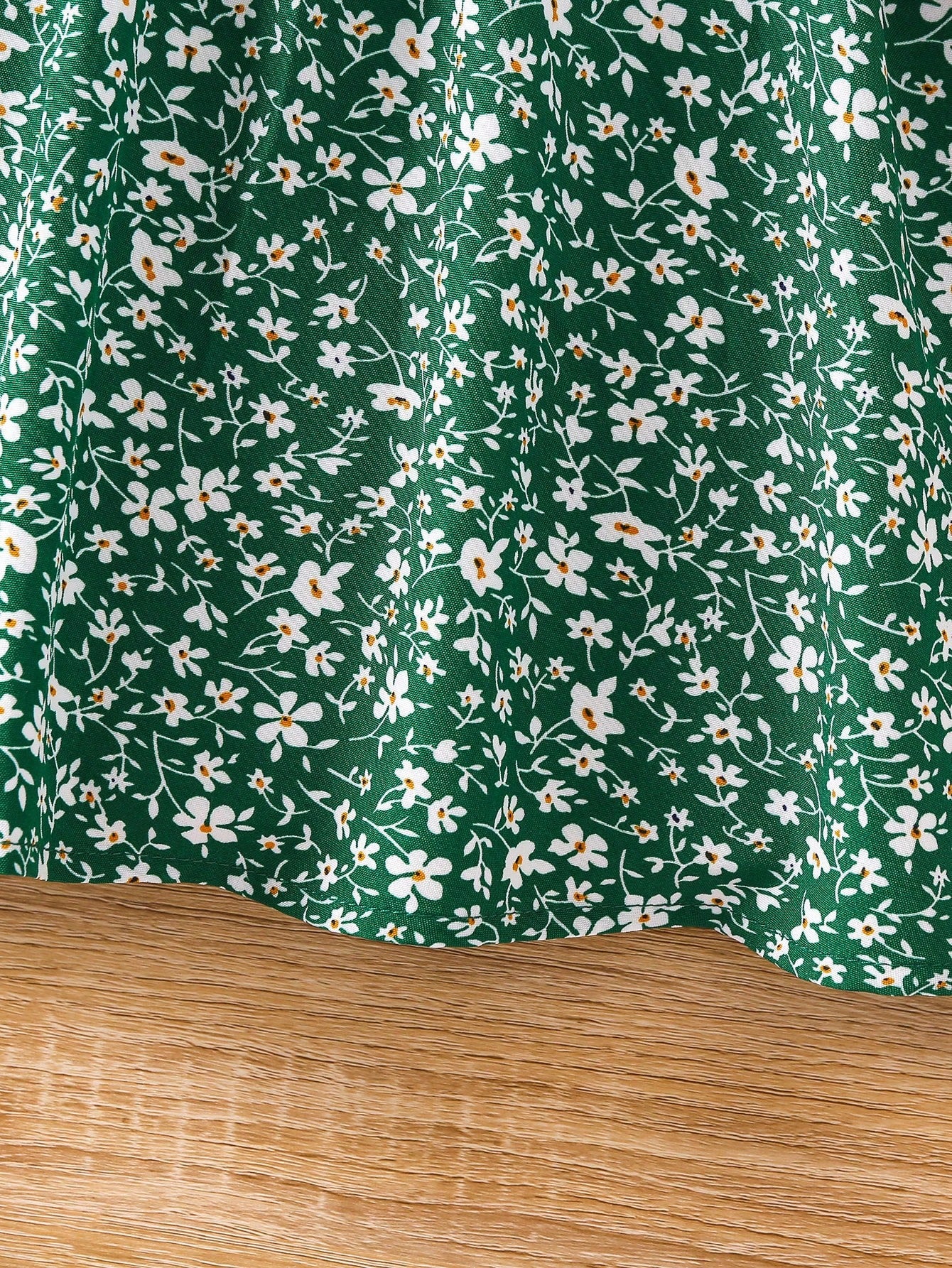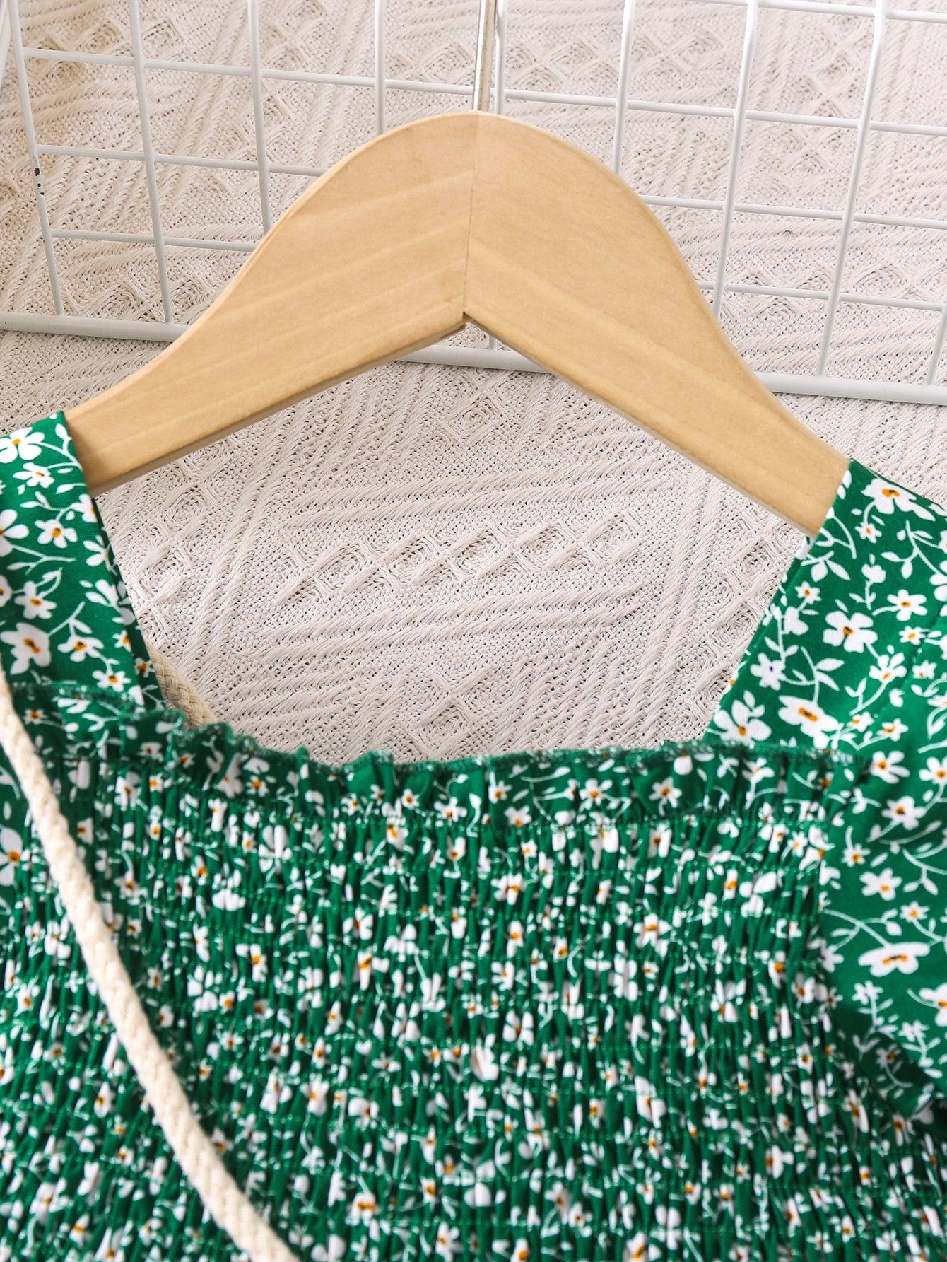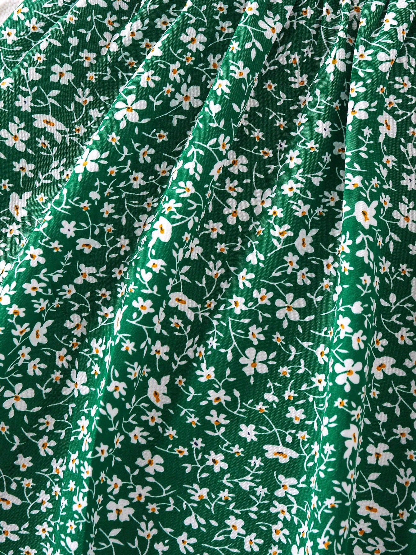 فستان فتاة شابة أخضر صغير بطبعات زهور عتيقة وأنيقة بياقة مربعة وأكمام أميرة، مثالي لقضاء عطلة الصيف