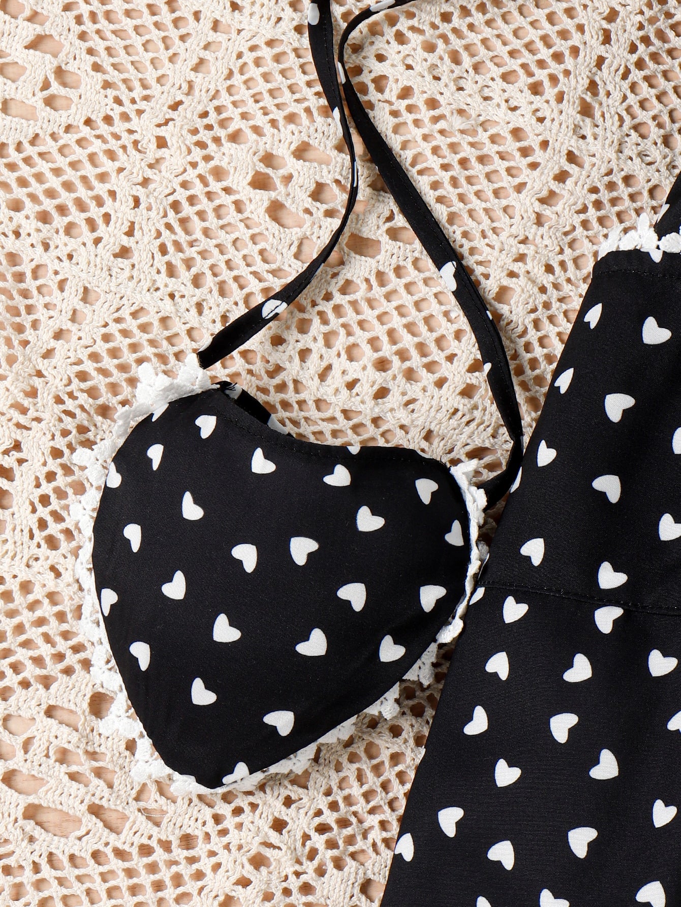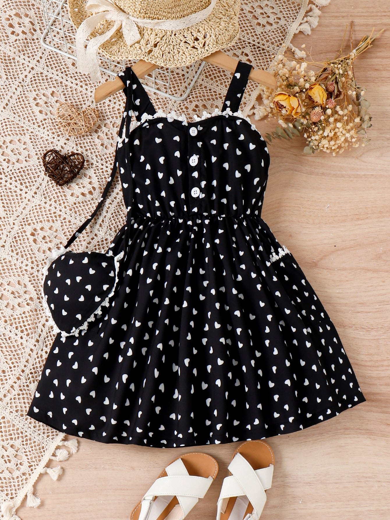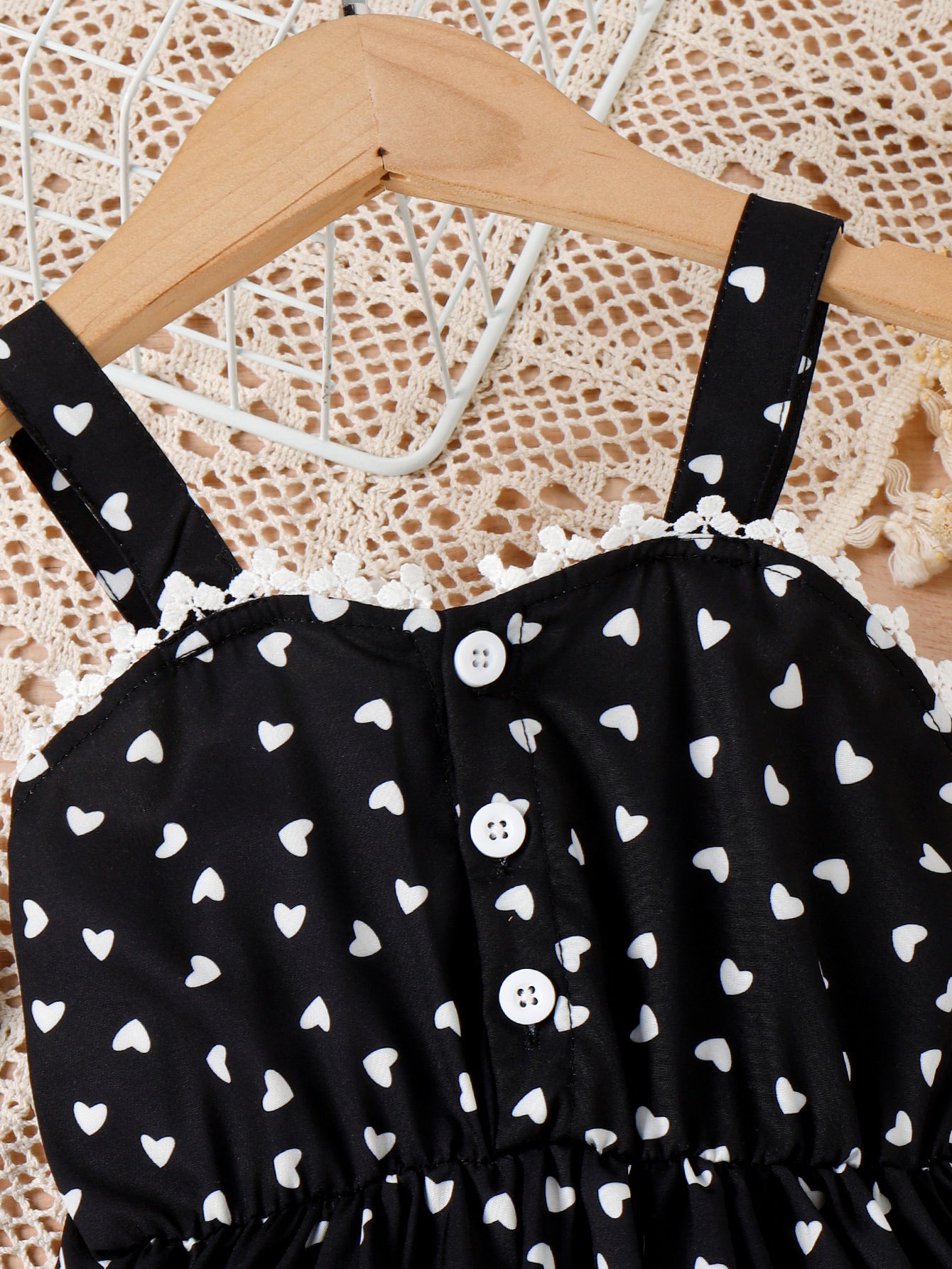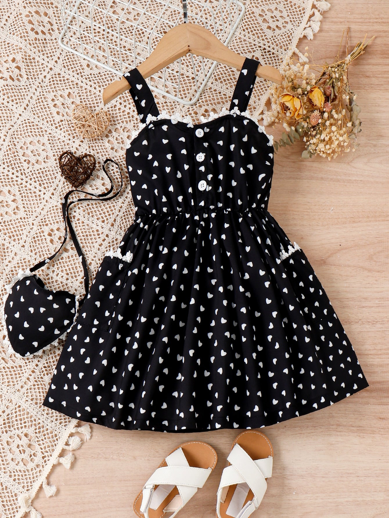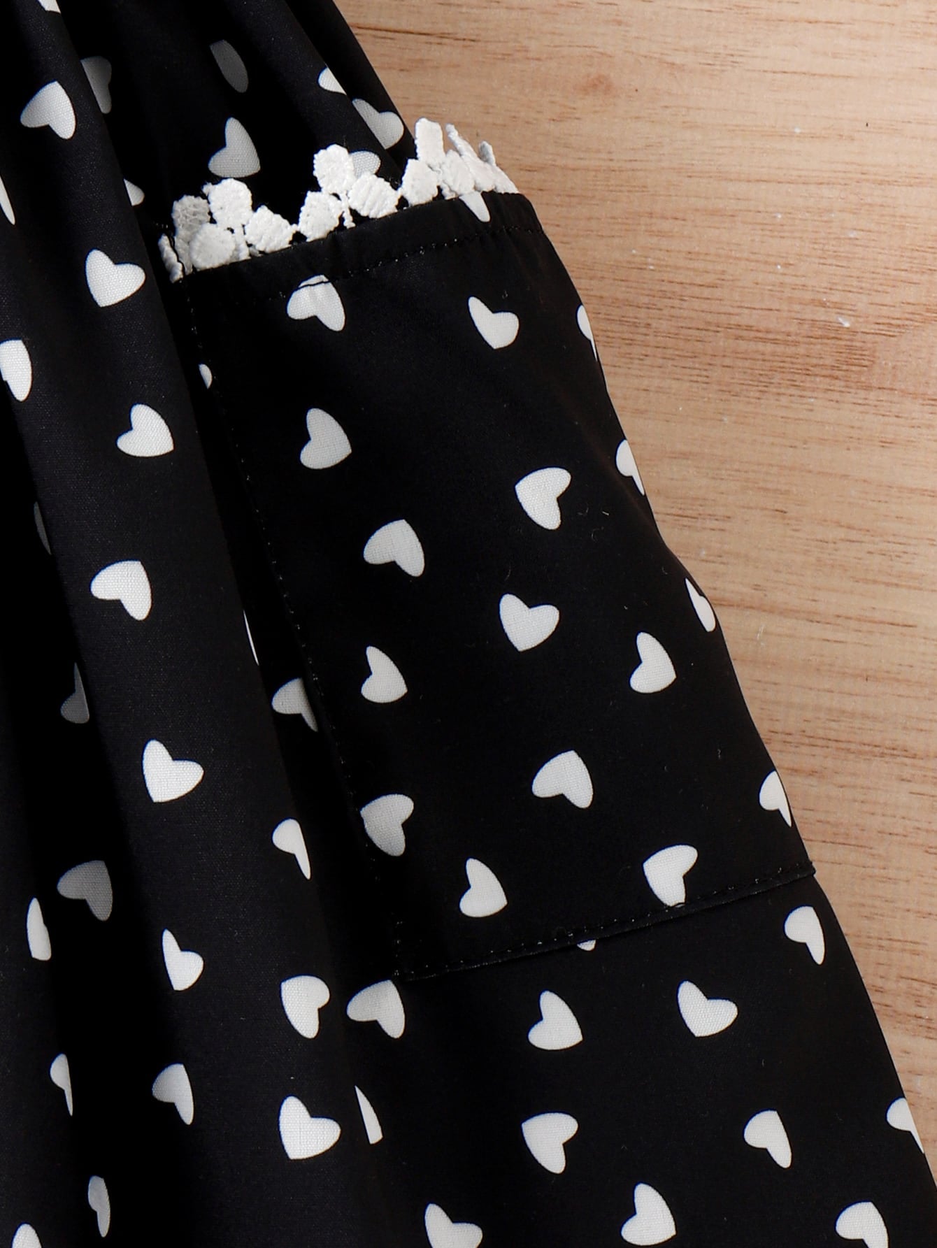 فستان فتاة صغيرة بطبعات قلوب مزينة بتقليمات دانتيل غيبور وجزمة