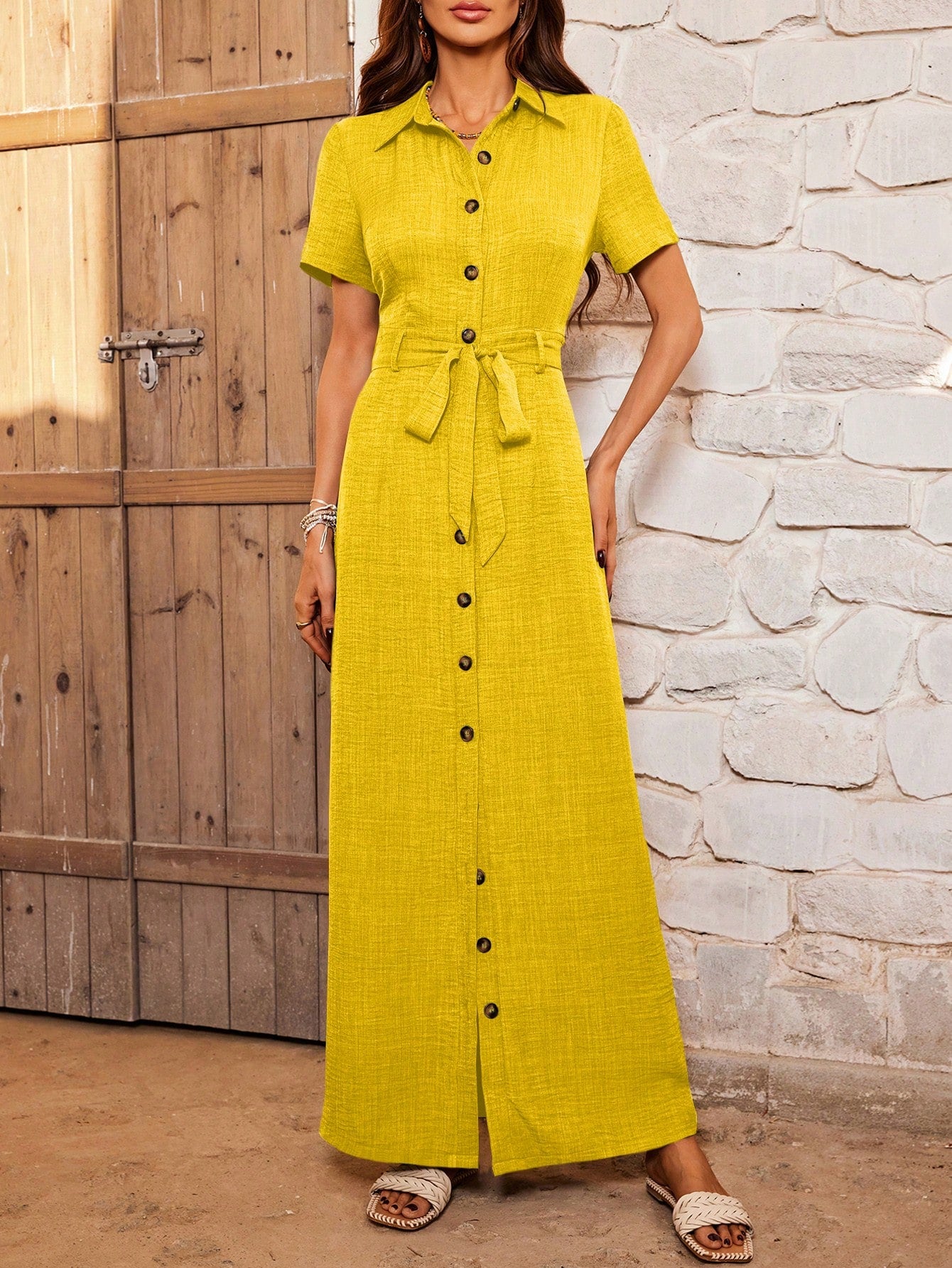 فستان قصير بأكمام قصيرة بأزرار أمامية بلون ثابت لقضاء العطلات والأوقات الفراغية