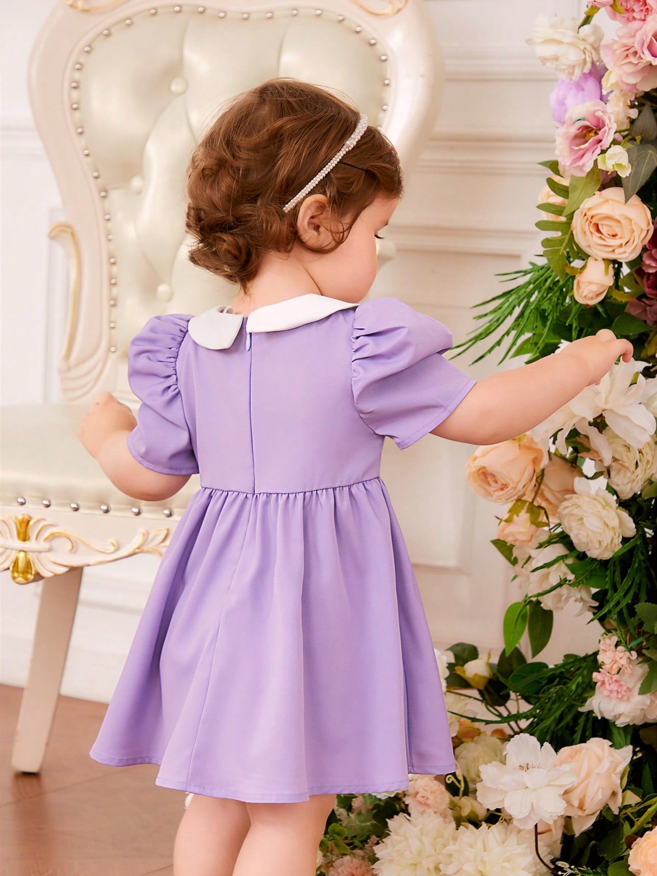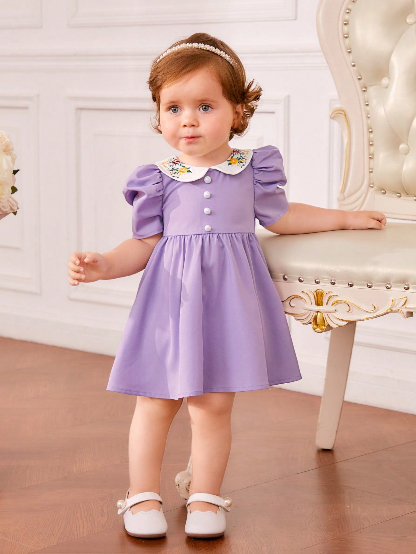 فستان قطني للأطفال الرضع بيتر بان طوق زهري تطريز زهري ، أكمام منتفخة