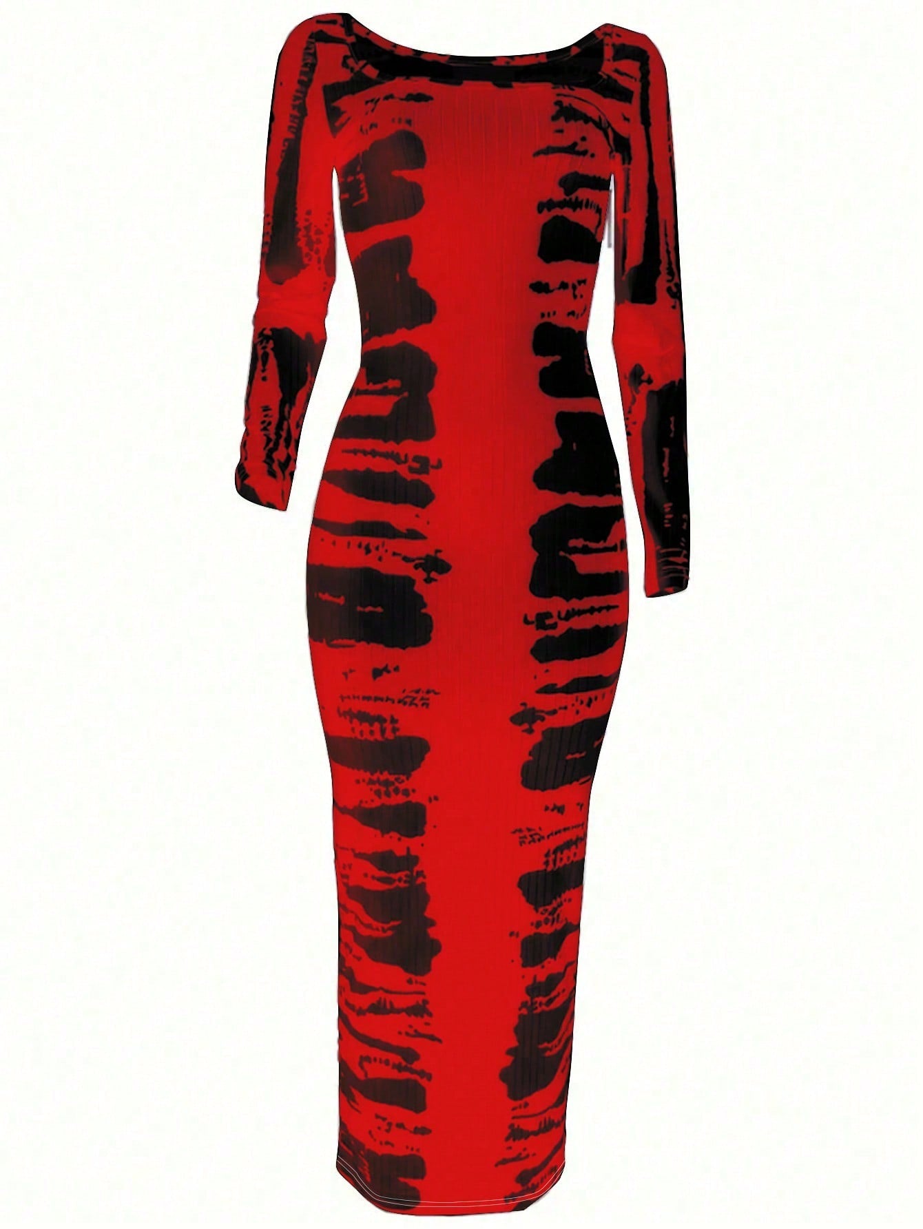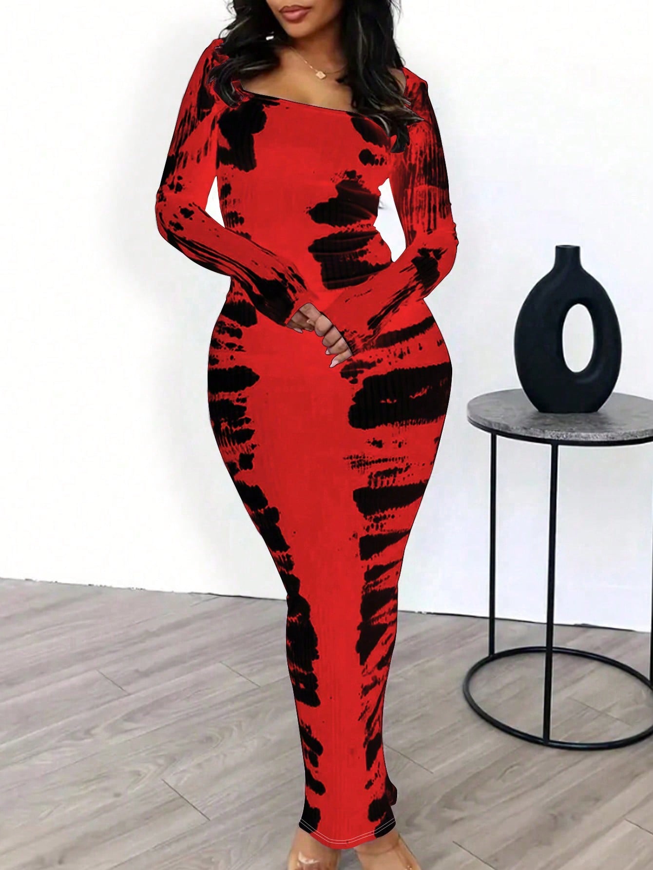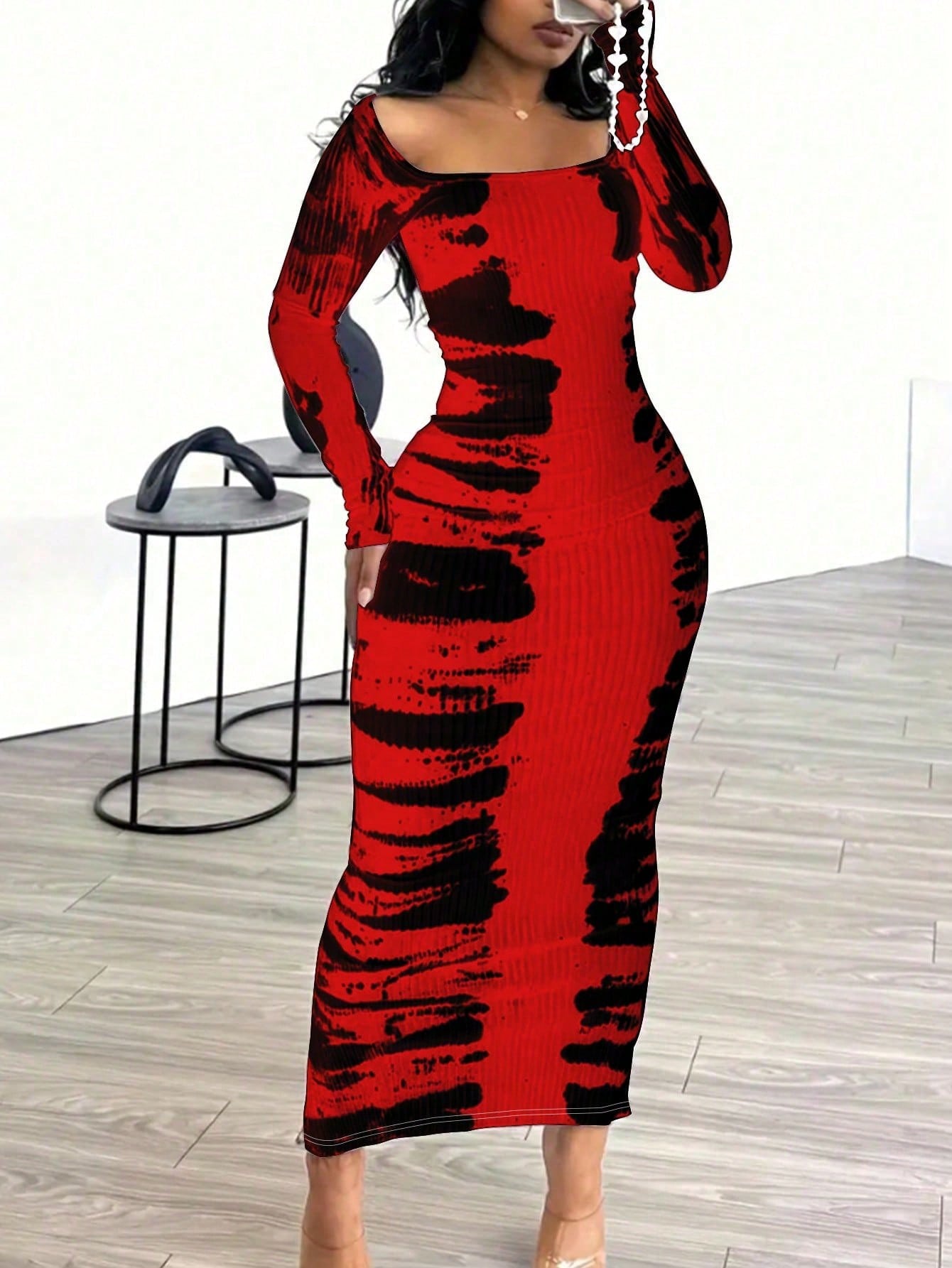 فستان كاجوال طويل بياقة مربعة وأكمام طويلة مطبوع بجميع الأنحاء للنساء، لملابس السنة الجديدة، فستان ماكسي للنساء