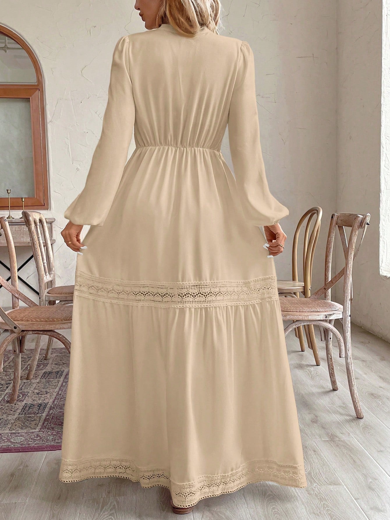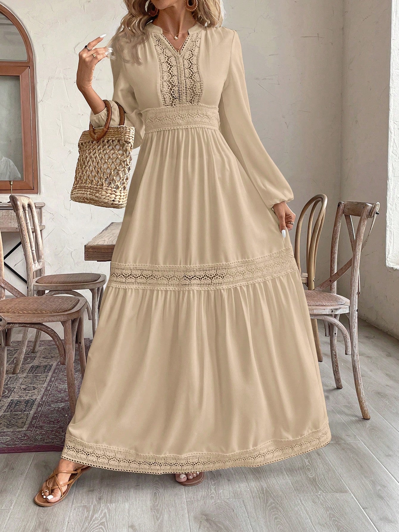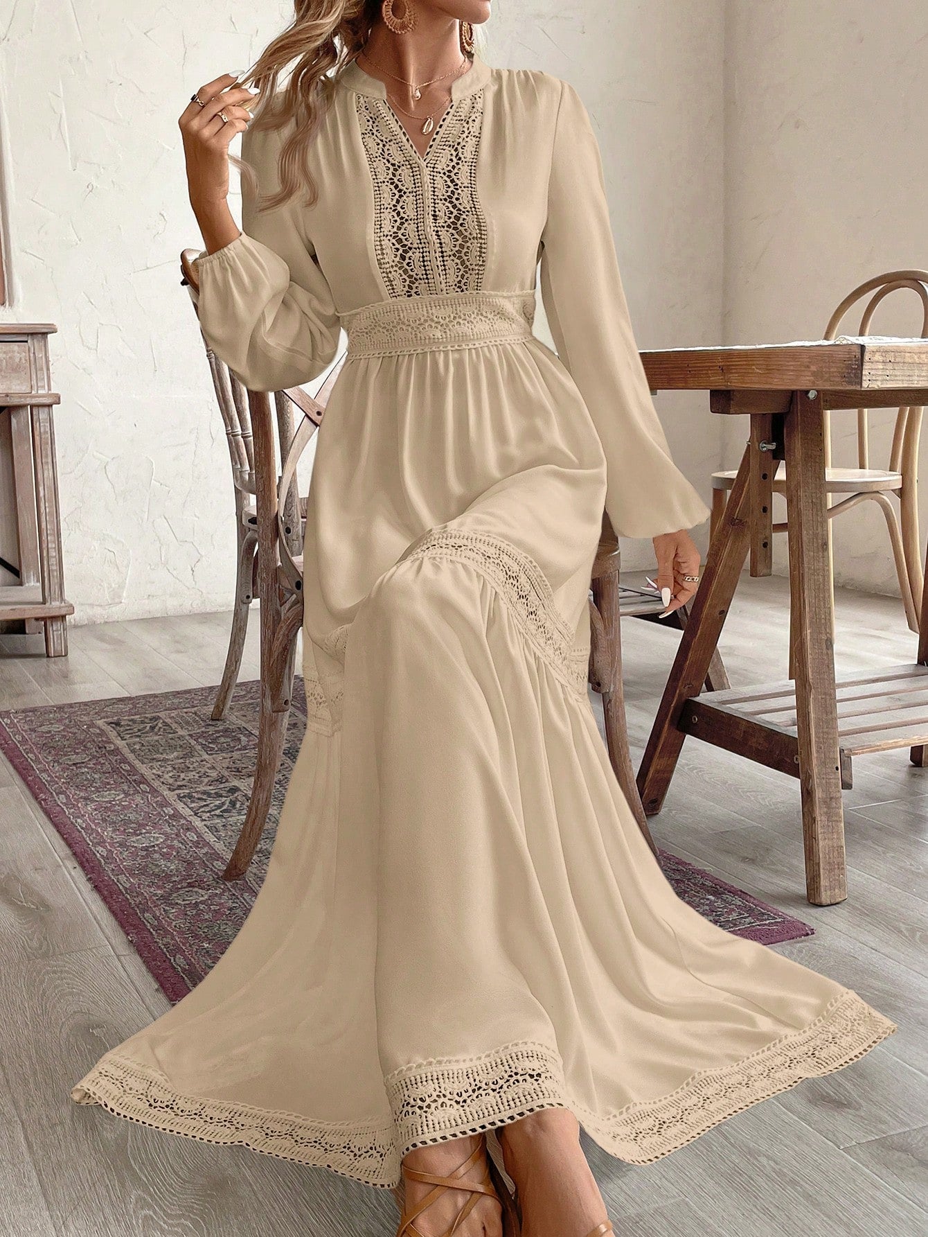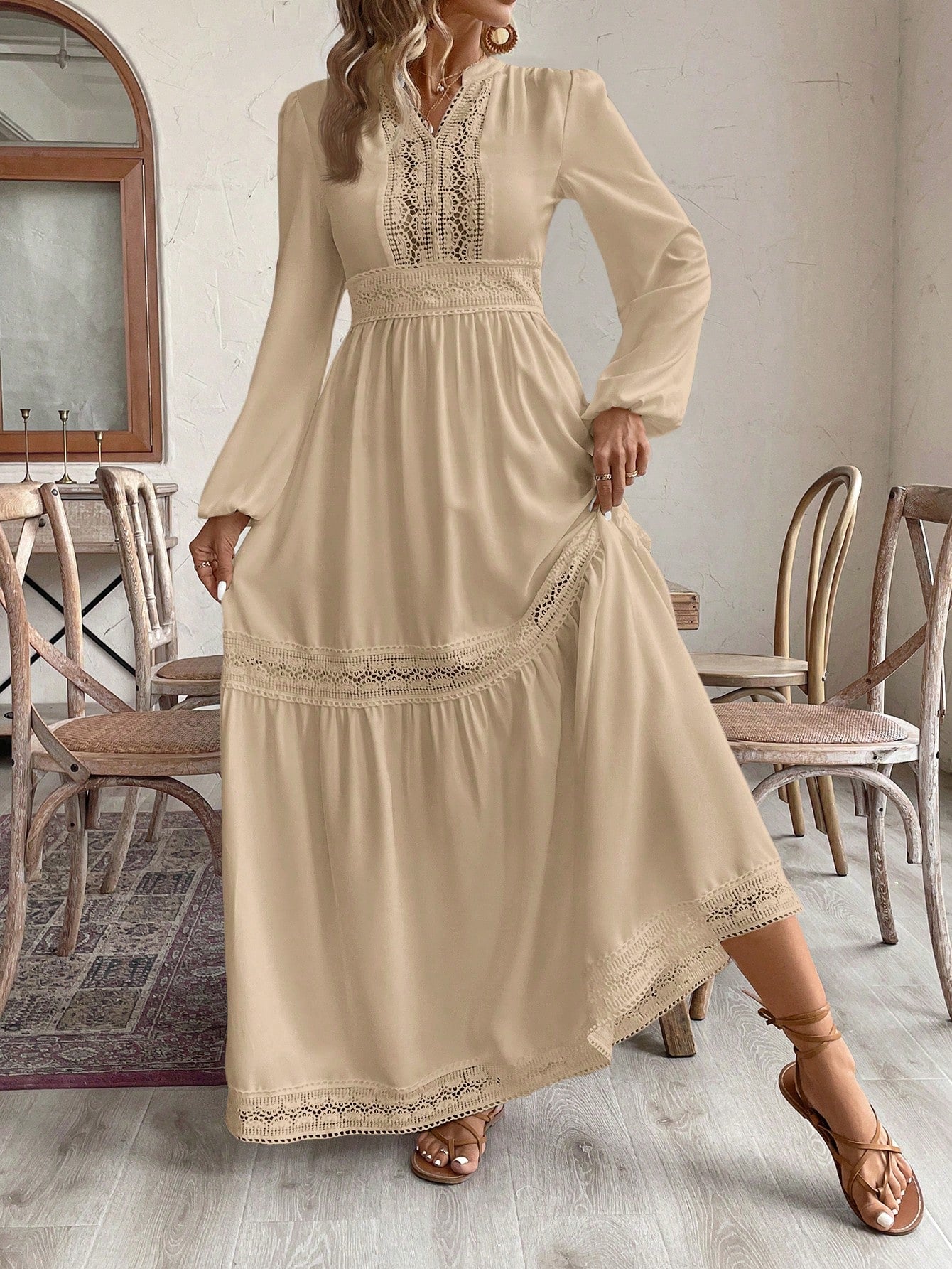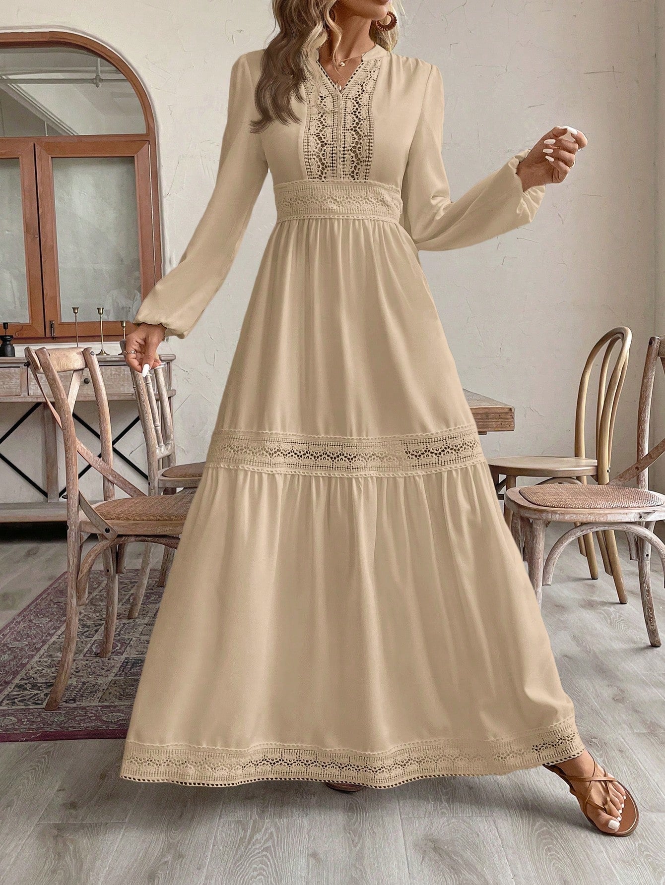 فستان كاجوال عطلة نسائي أكمام طويلة رقبة على شكل حرف V لون واحد, تفريغ و رقعة