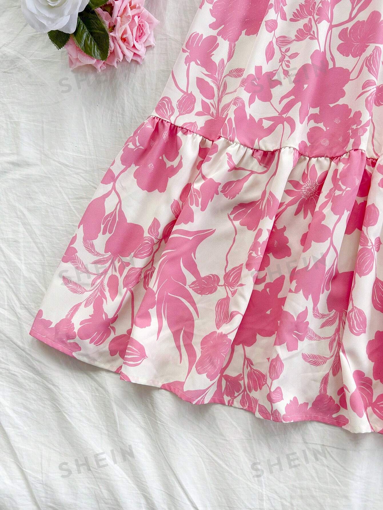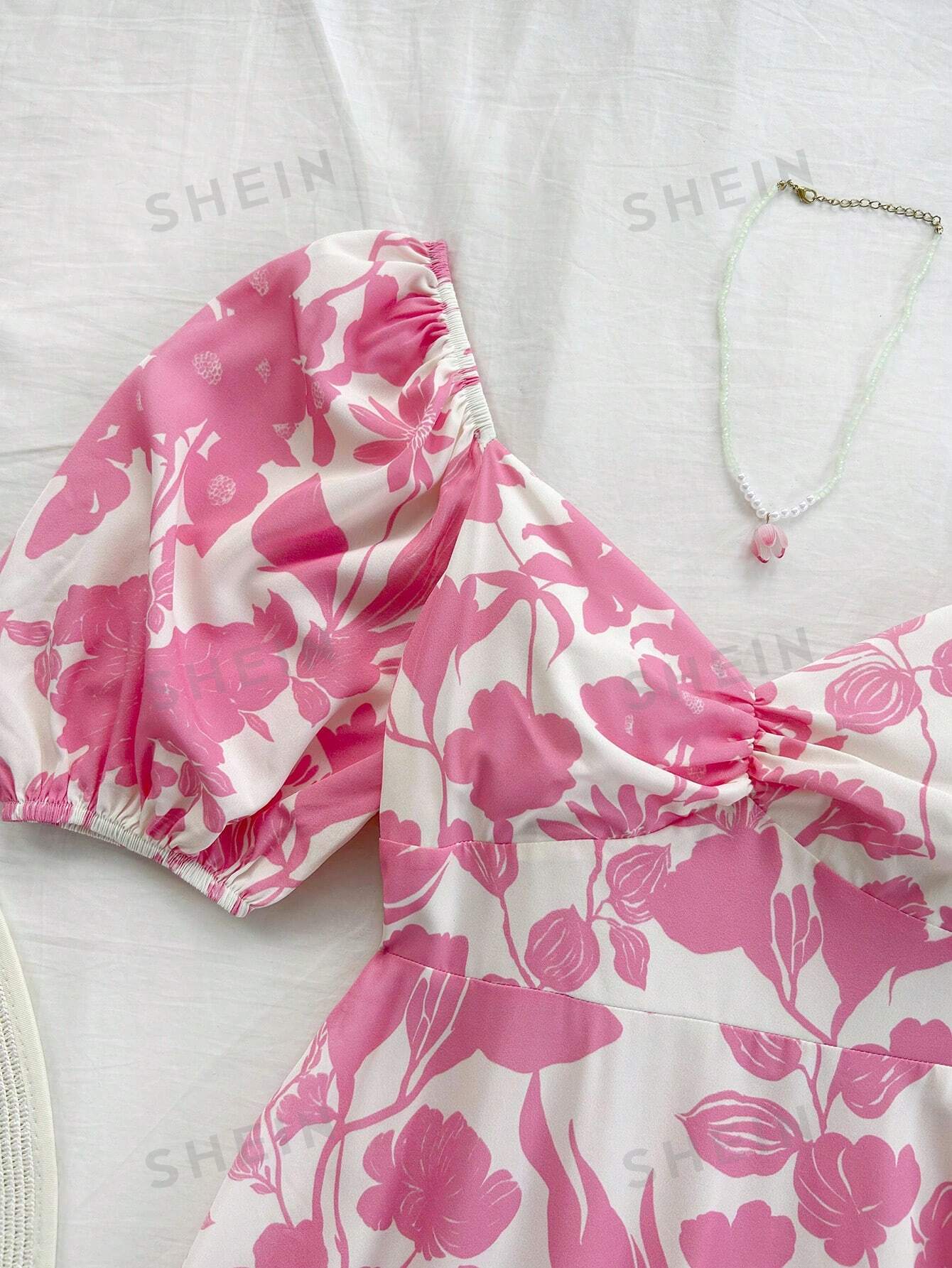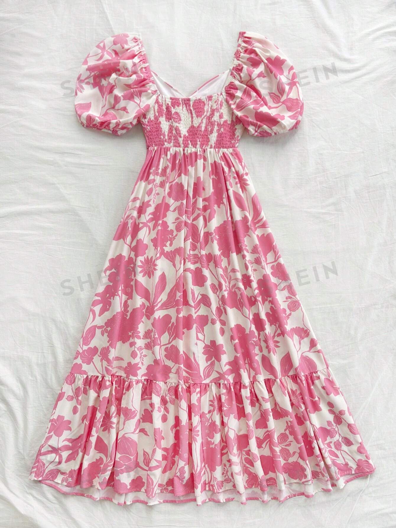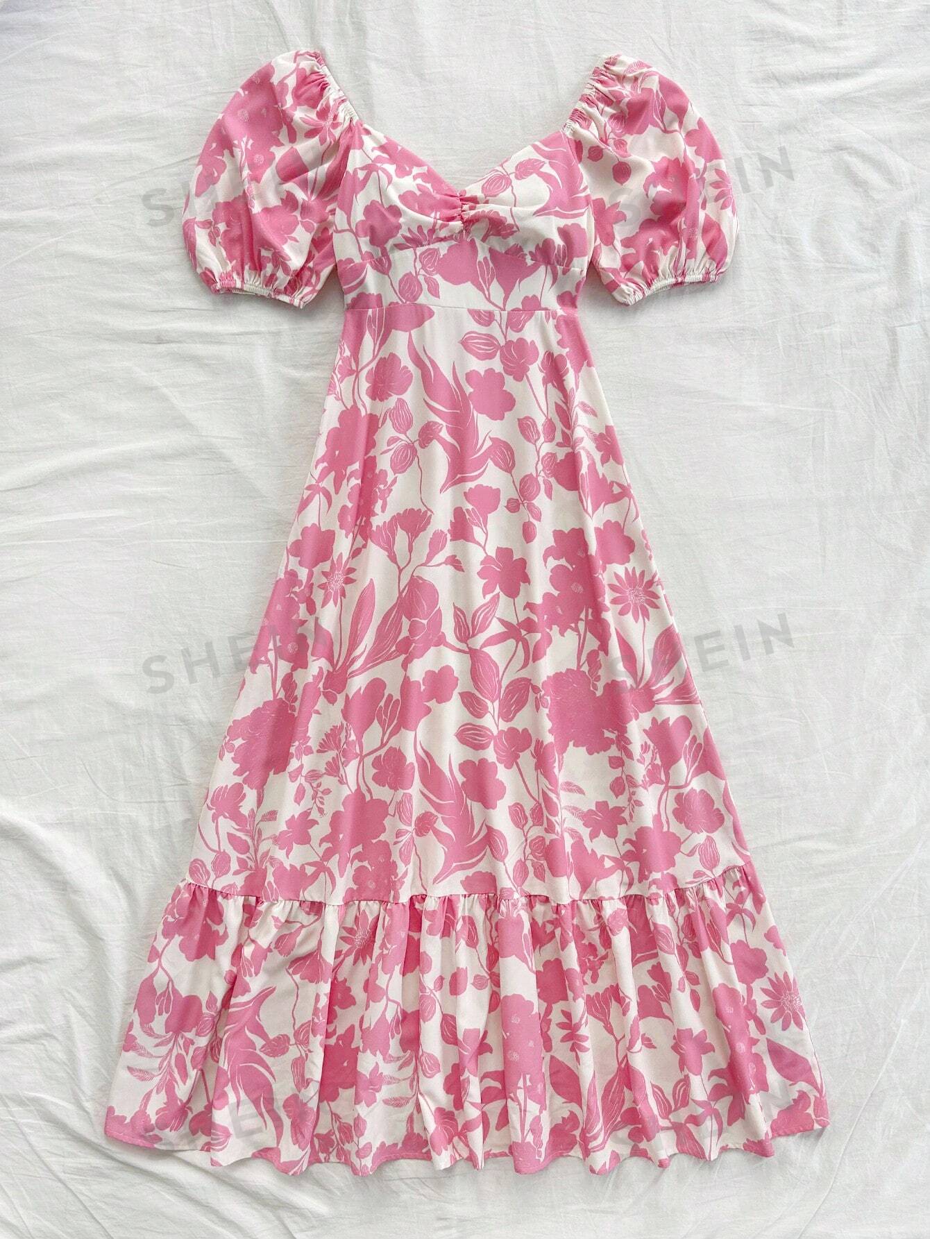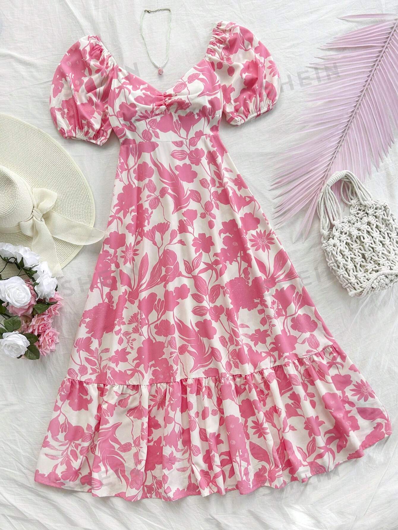 فستان كاجوال للنساء بطبعة العطلة، أكمام منفوشة وذيل مكرر، طرف مزدوج اللون رومانسي لحفل الزفاف أو العودة للمدرسة, وردي وأبيض
