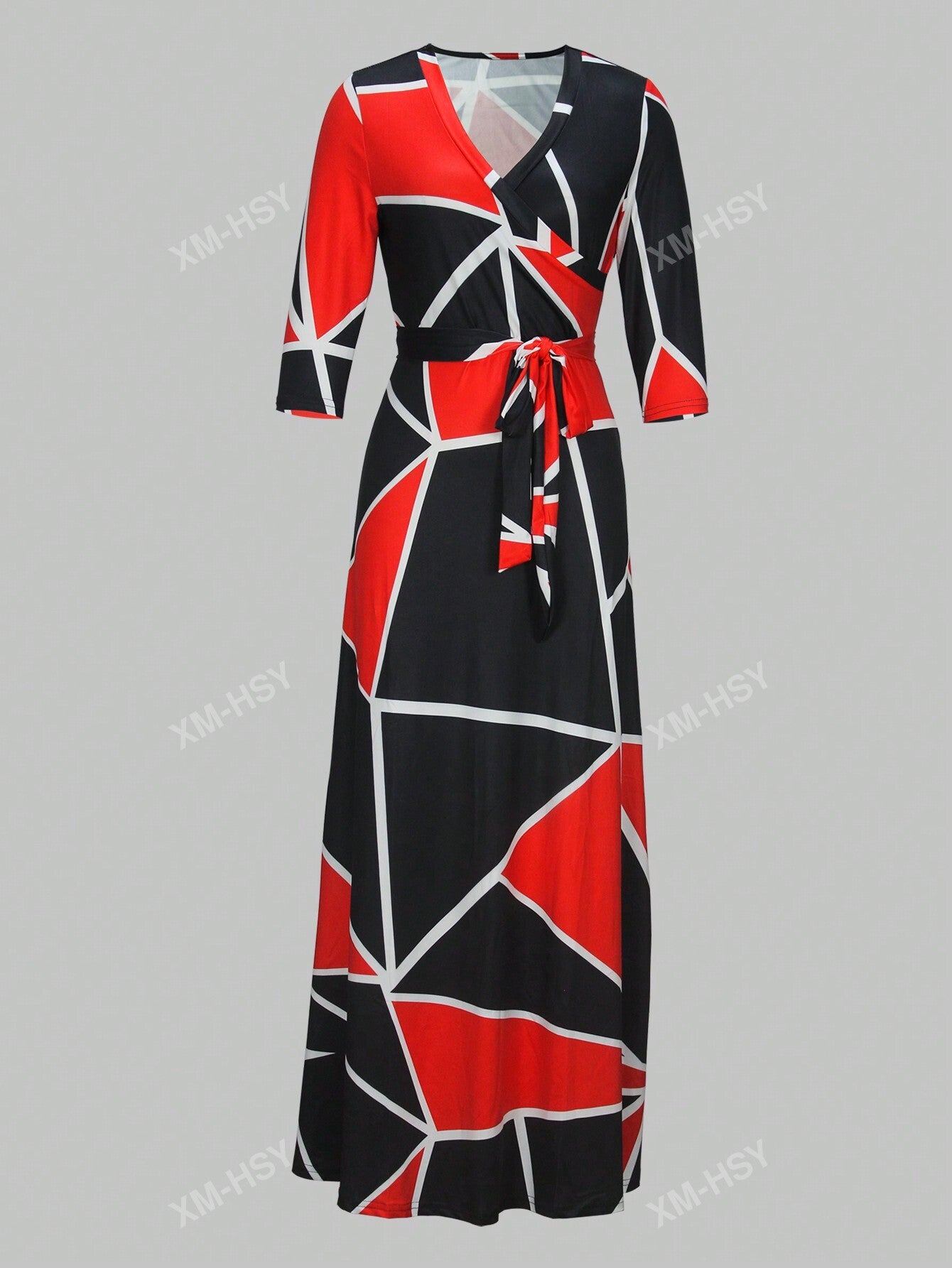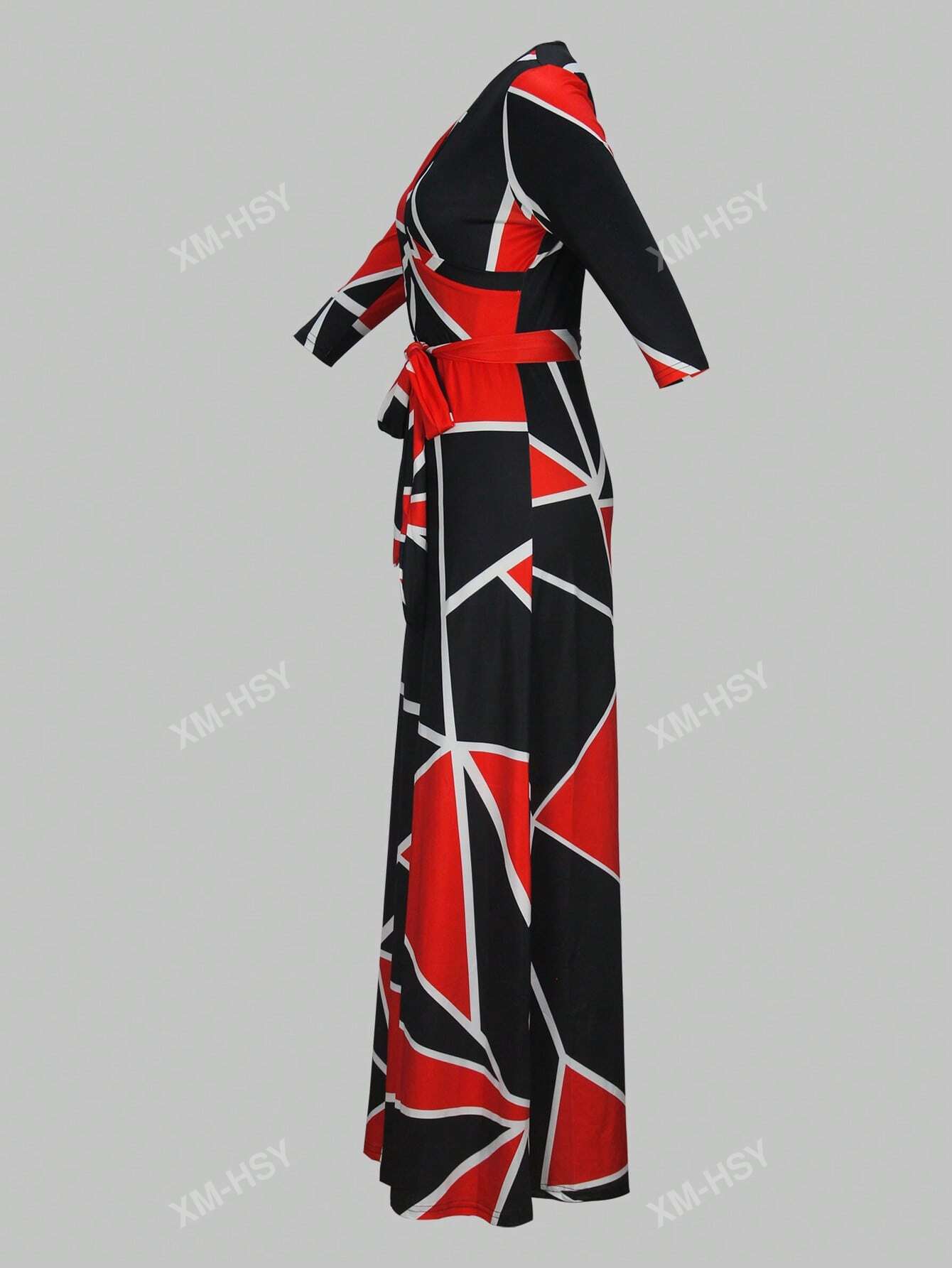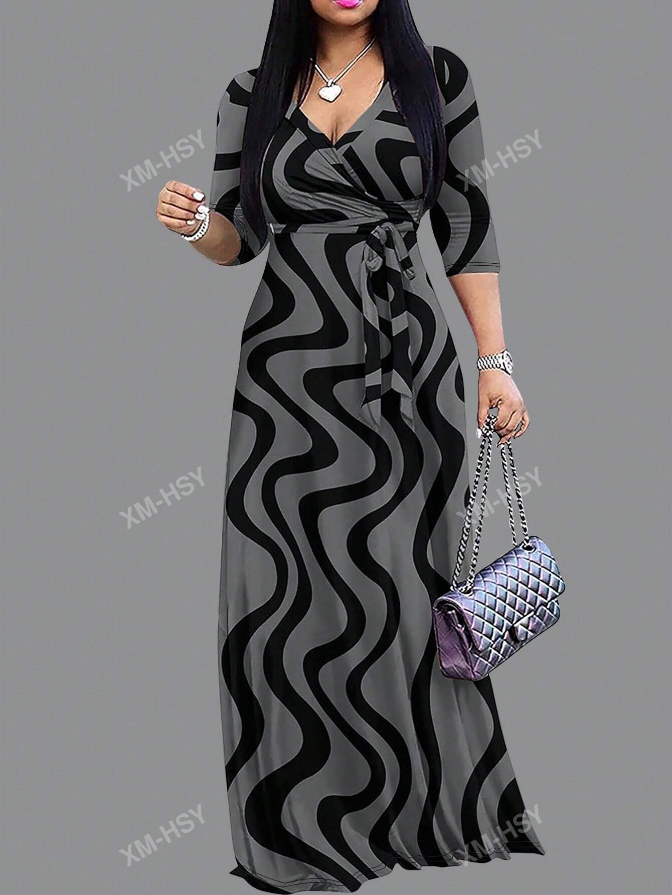 فستان كاجوال مطبوع بياقة على شكل حرف V وأكمام طويلة وخصر مربوط