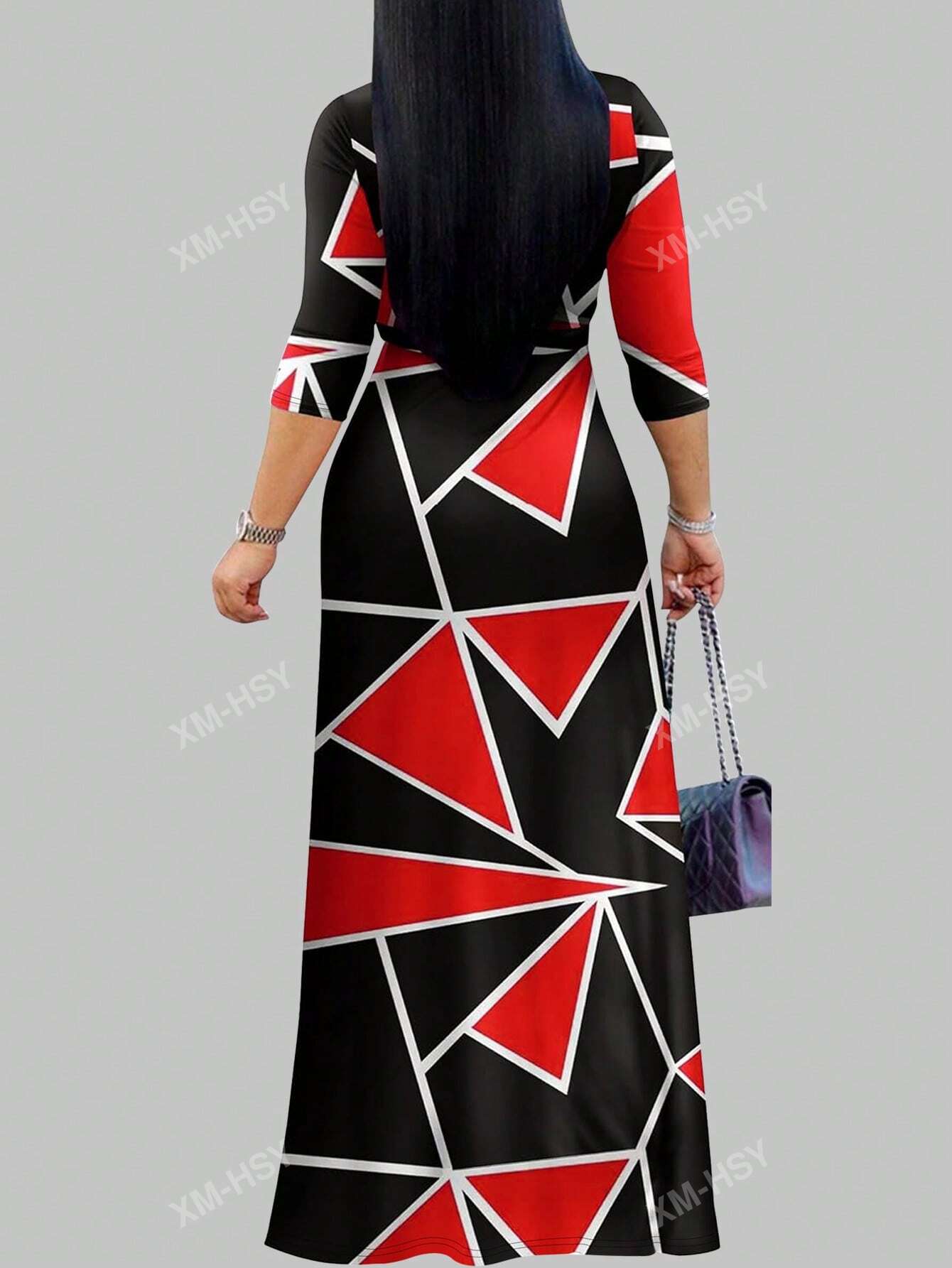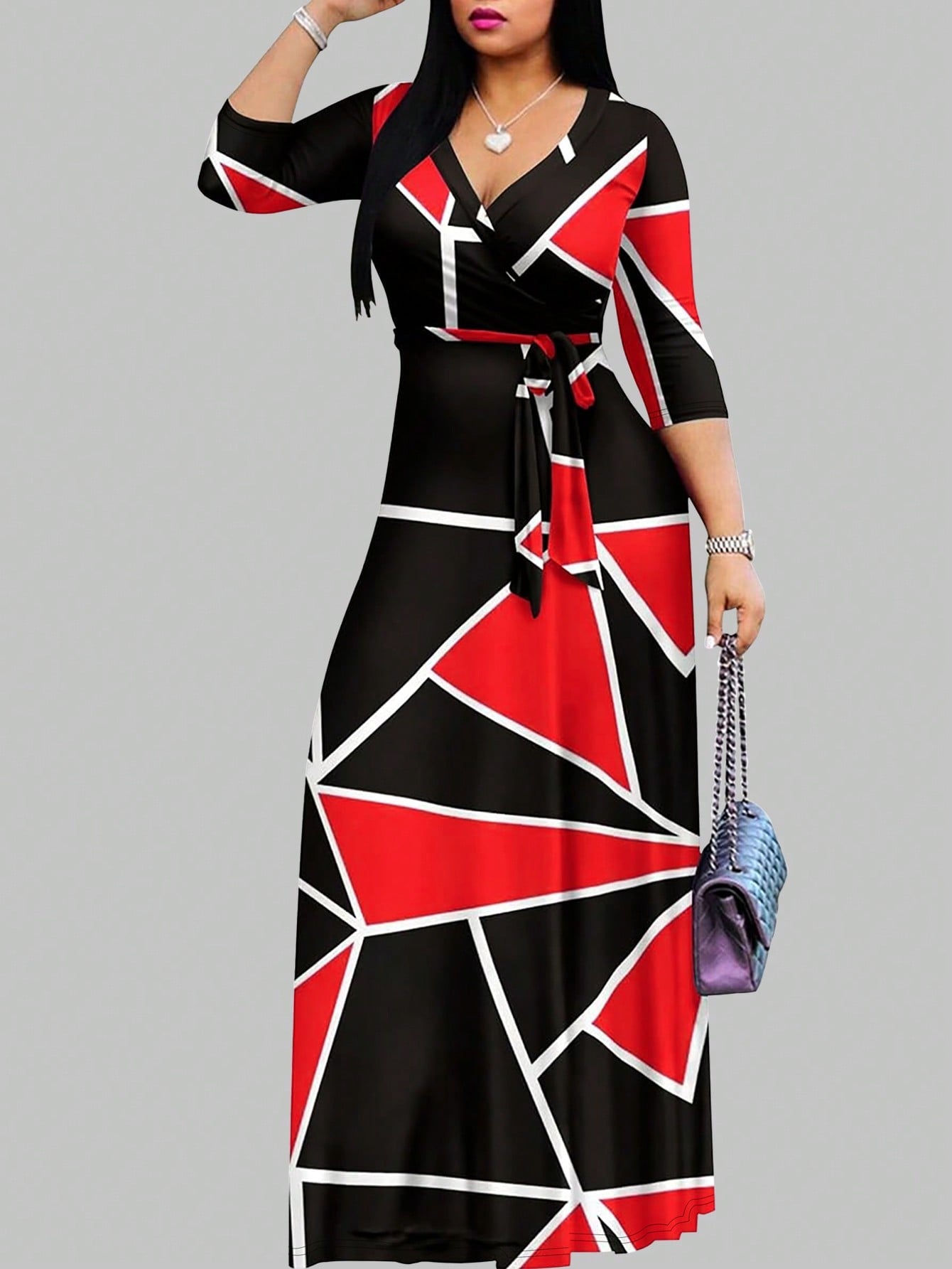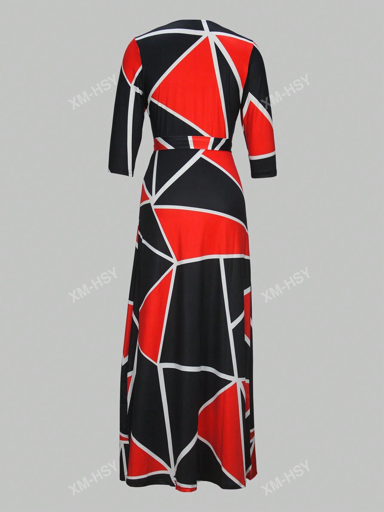 فستان كاجوال مطبوع بياقة على شكل حرف V وأكمام طويلة وخصر مربوط