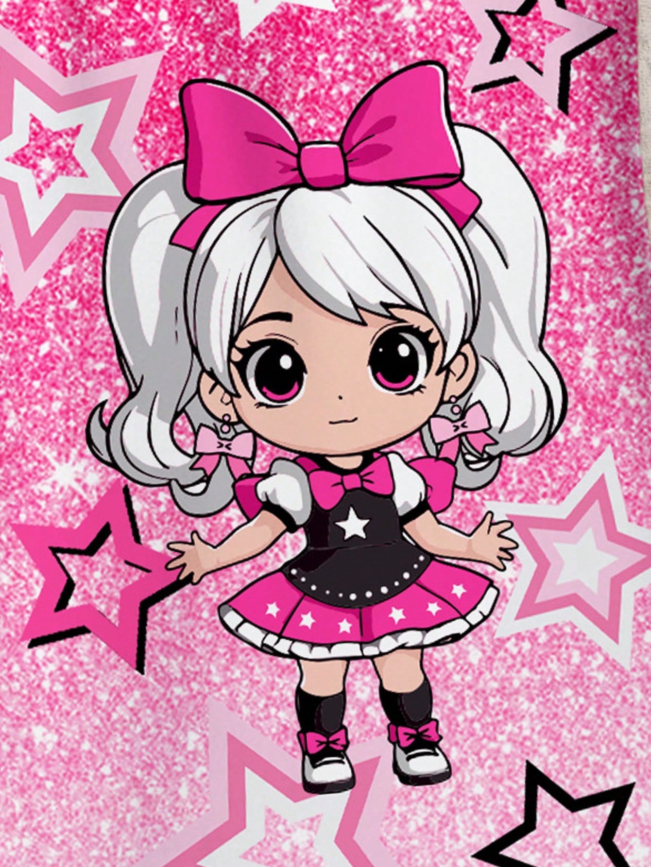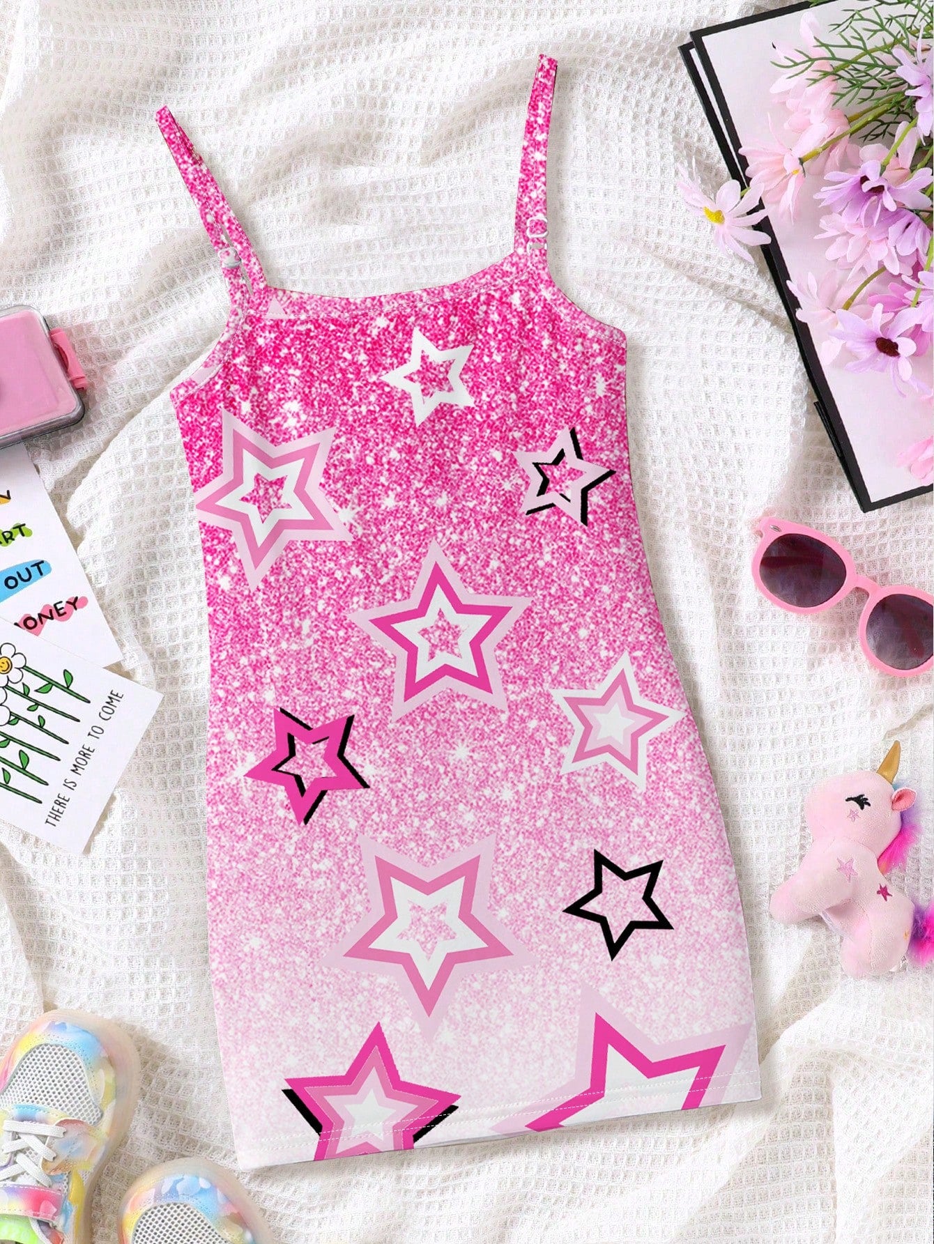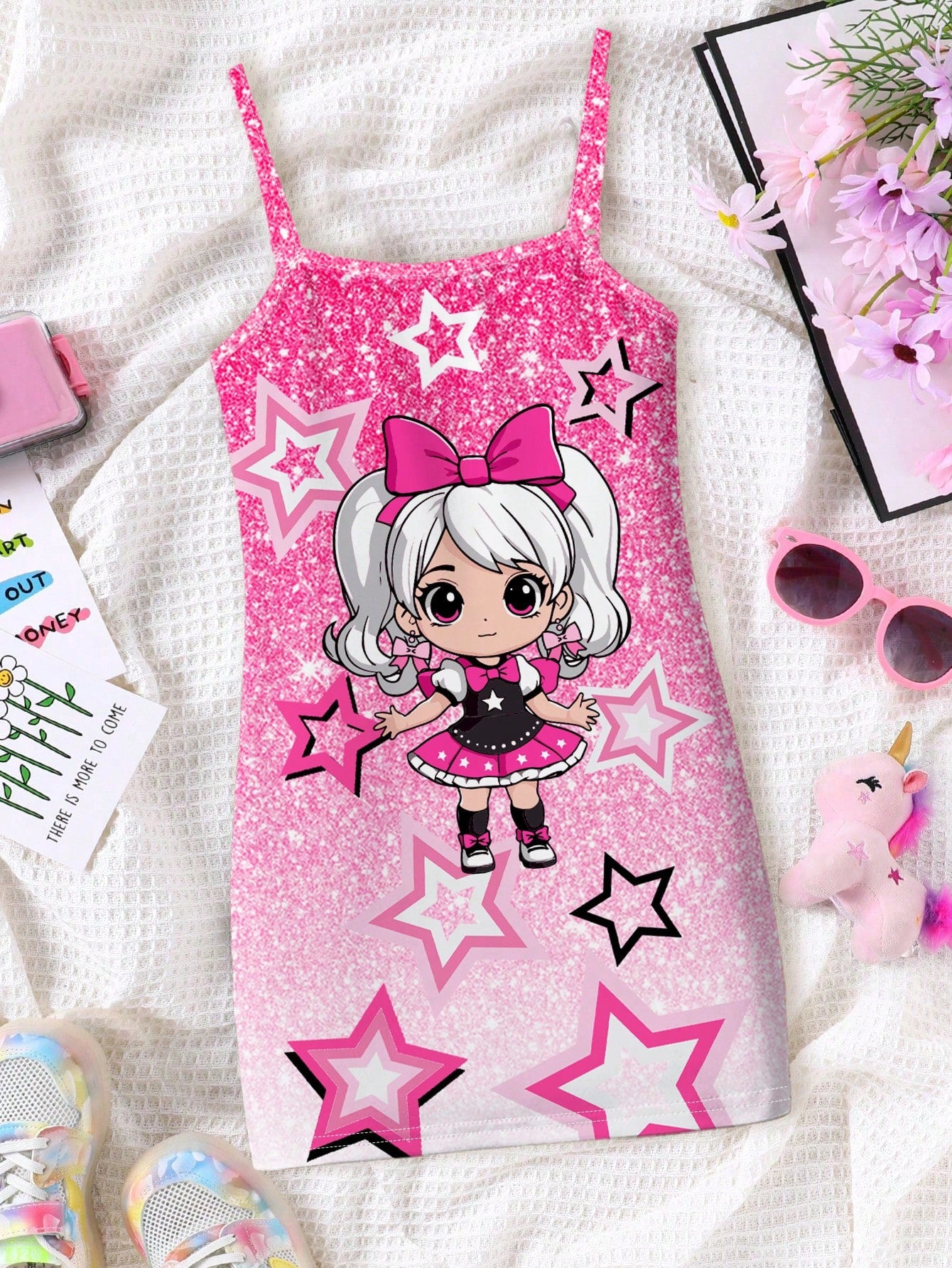 فستان كامي متوسط الطول بنمط بسيط للفتيات الصغيرات، بطابع كرتوني للفتاة الشابة،نجمة، تدرج لامع خفيف لطيف وانيق لإطلالة الصيف والحفلات