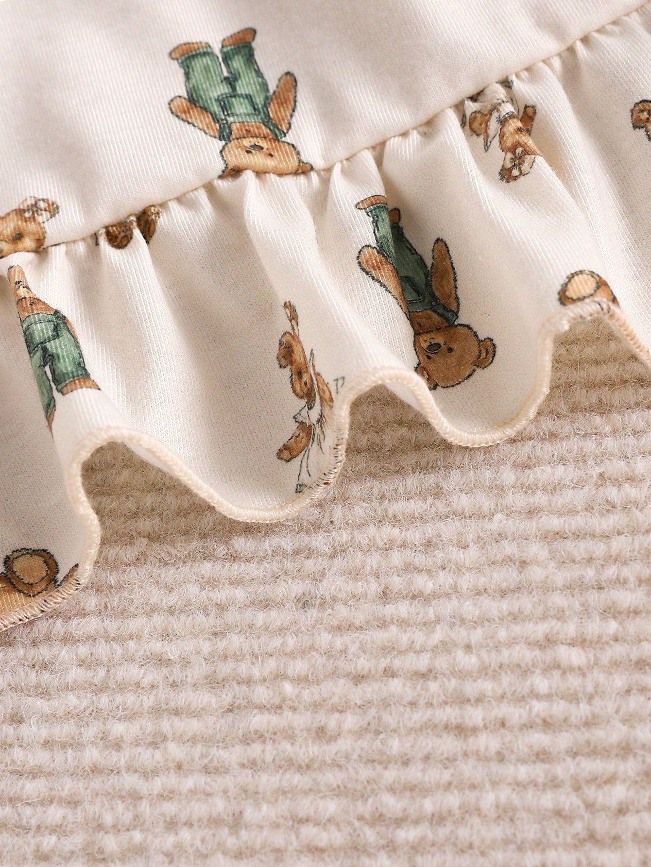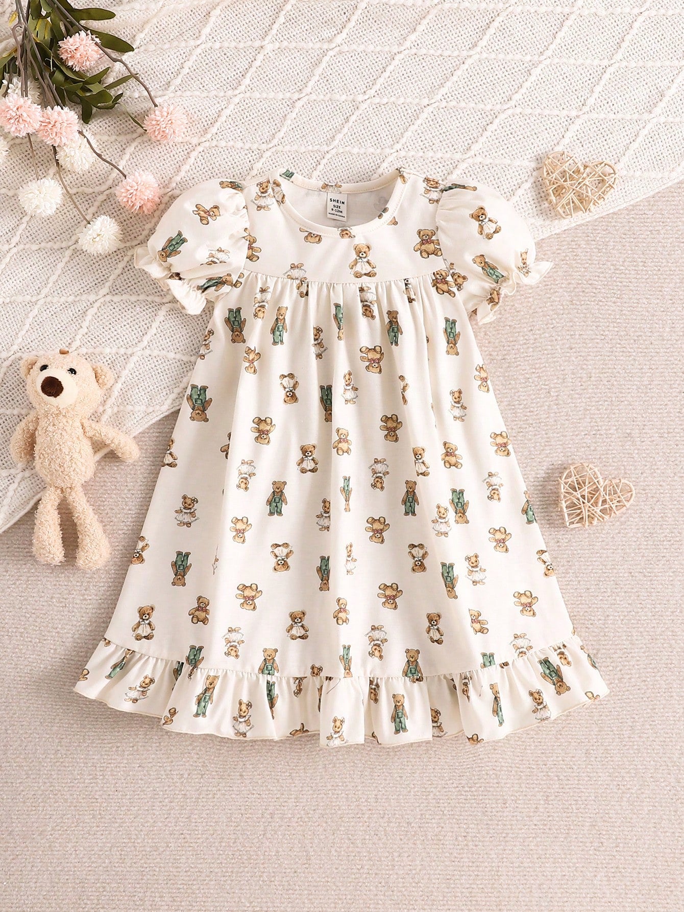 فستان ليلي محبوك لطفلة رضيعة بنمط دب كرتوني بارز ورقبة بفقاعات وحاشية بطبقات زخرفية