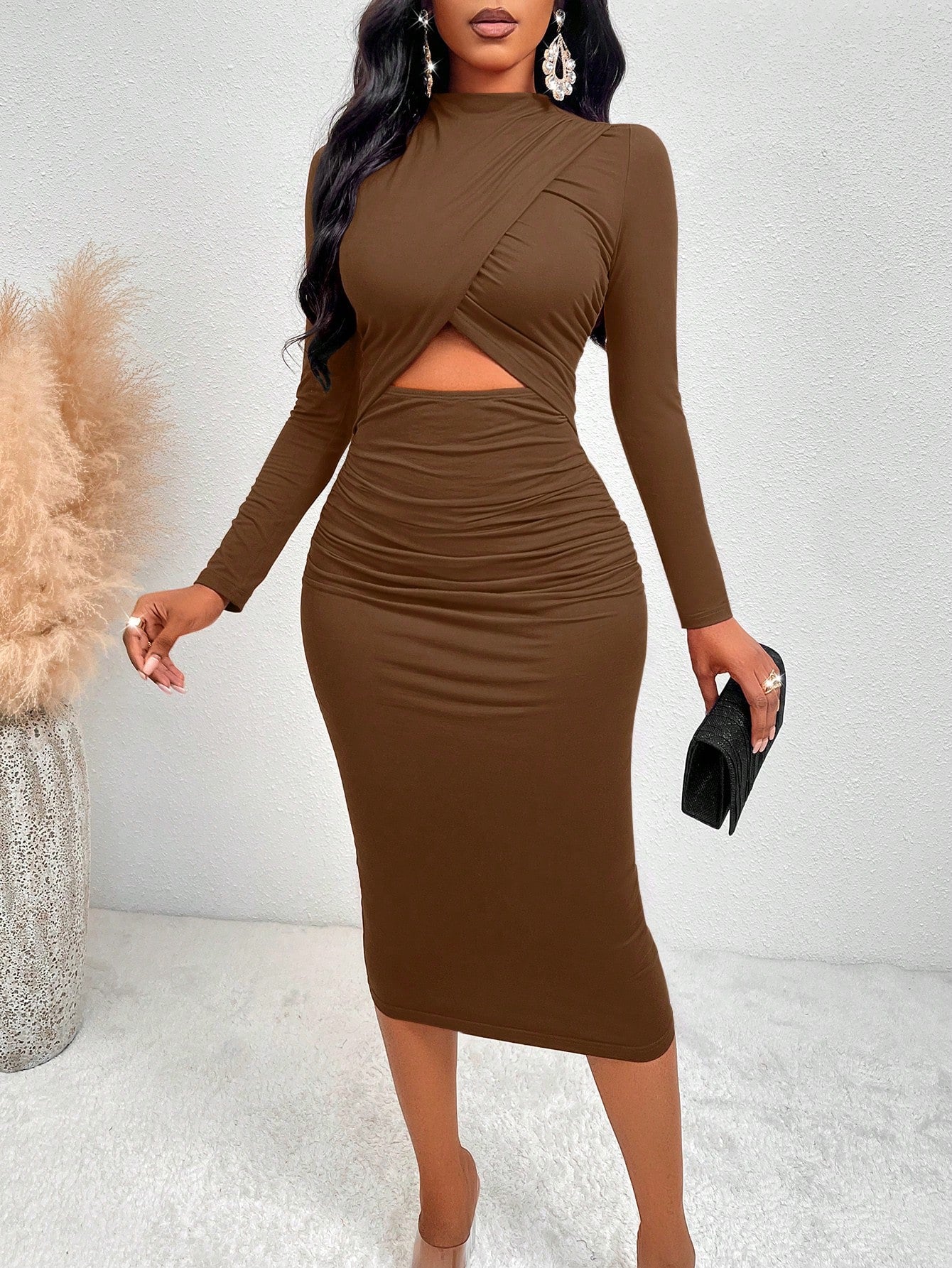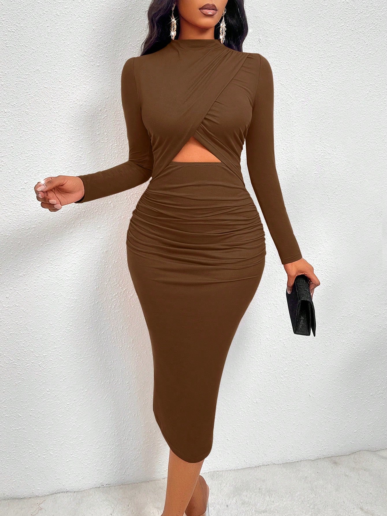 فستان ماكسي سيدات لون سادة طويل الأكمام بتصميم منقوب مطوي بسيط كاجوال