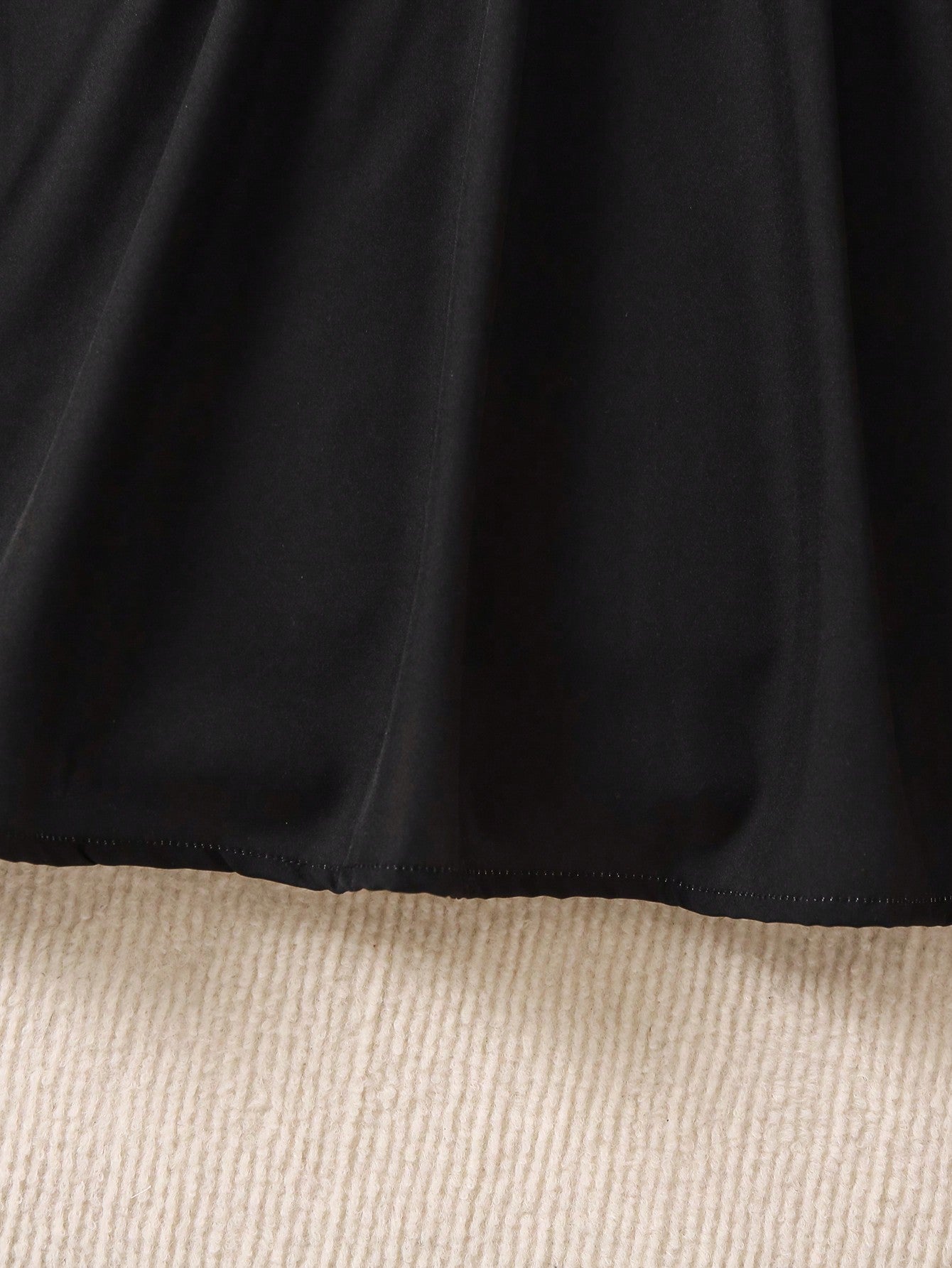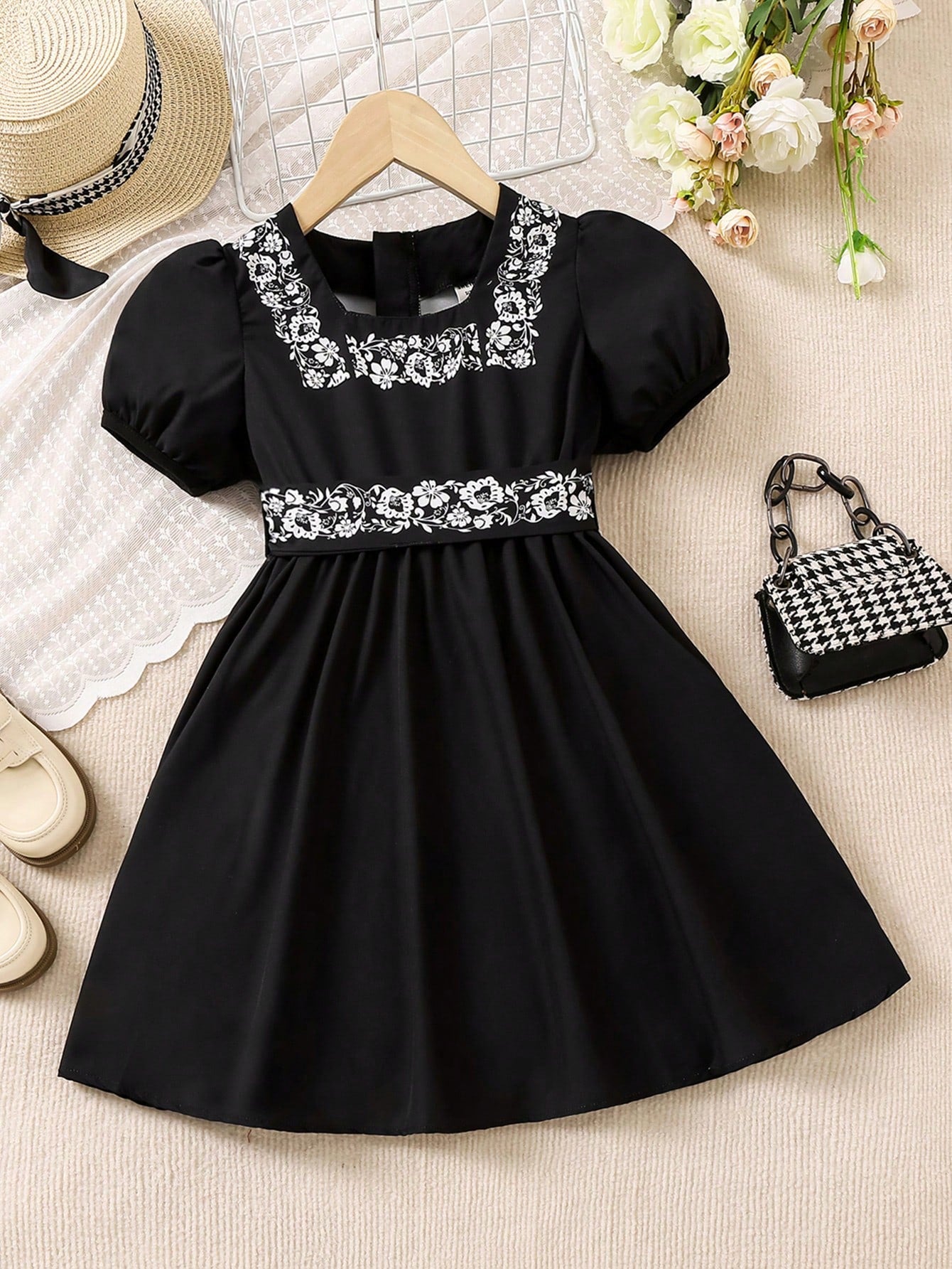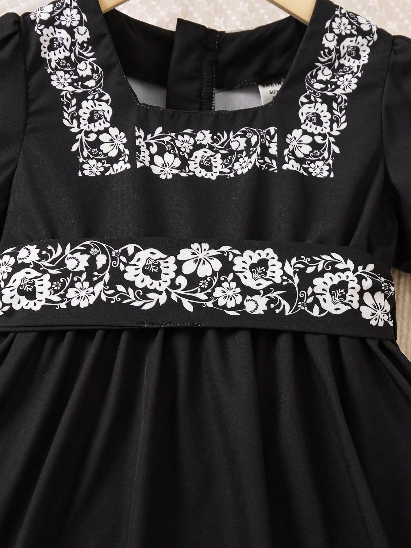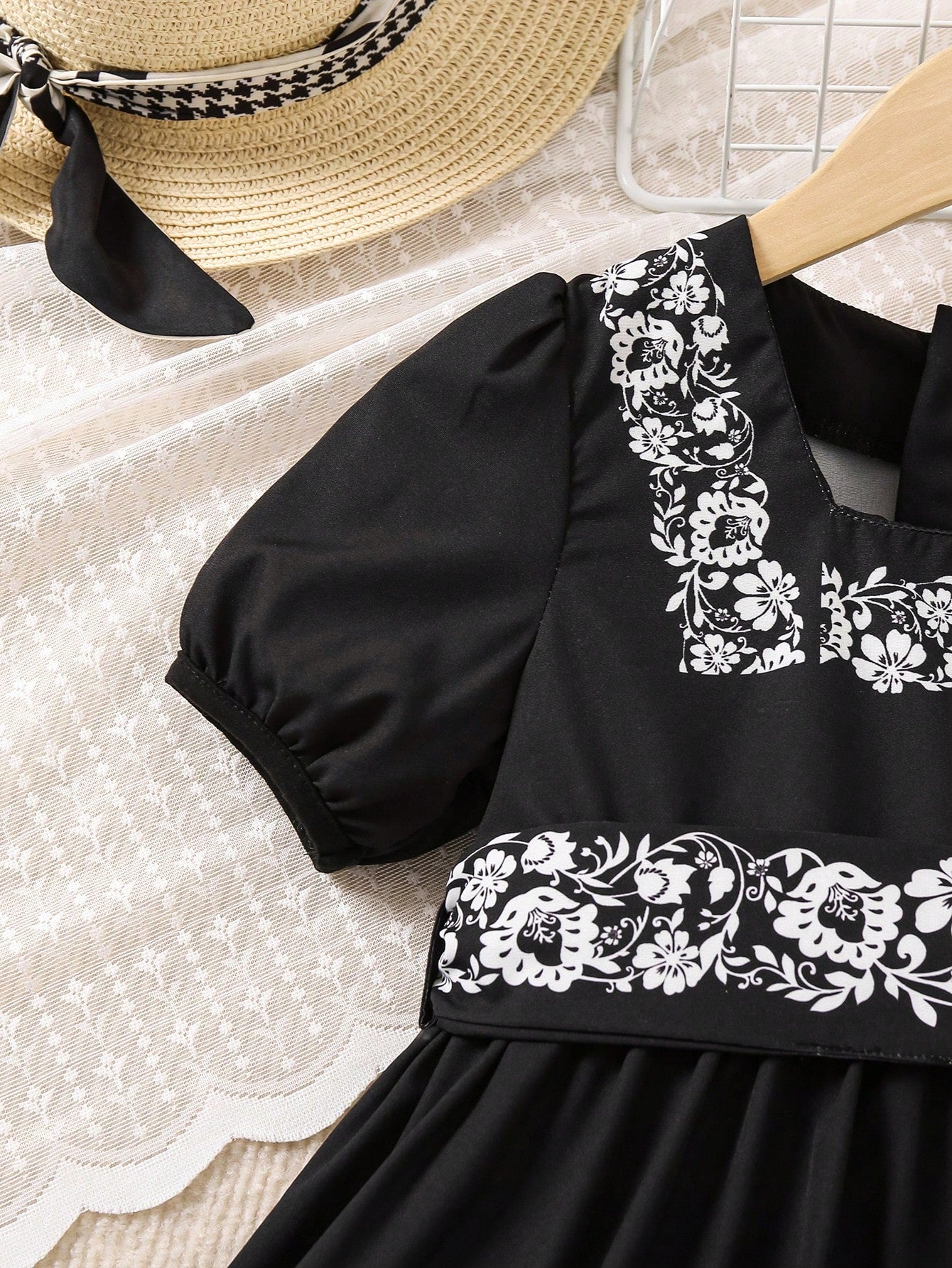 فستان ميدي قصير الأكمام للفتيات الصغيرات بطبعة زهر بيضاء على خلفية سوداء، محافظ ومناسب لفصل الصيف