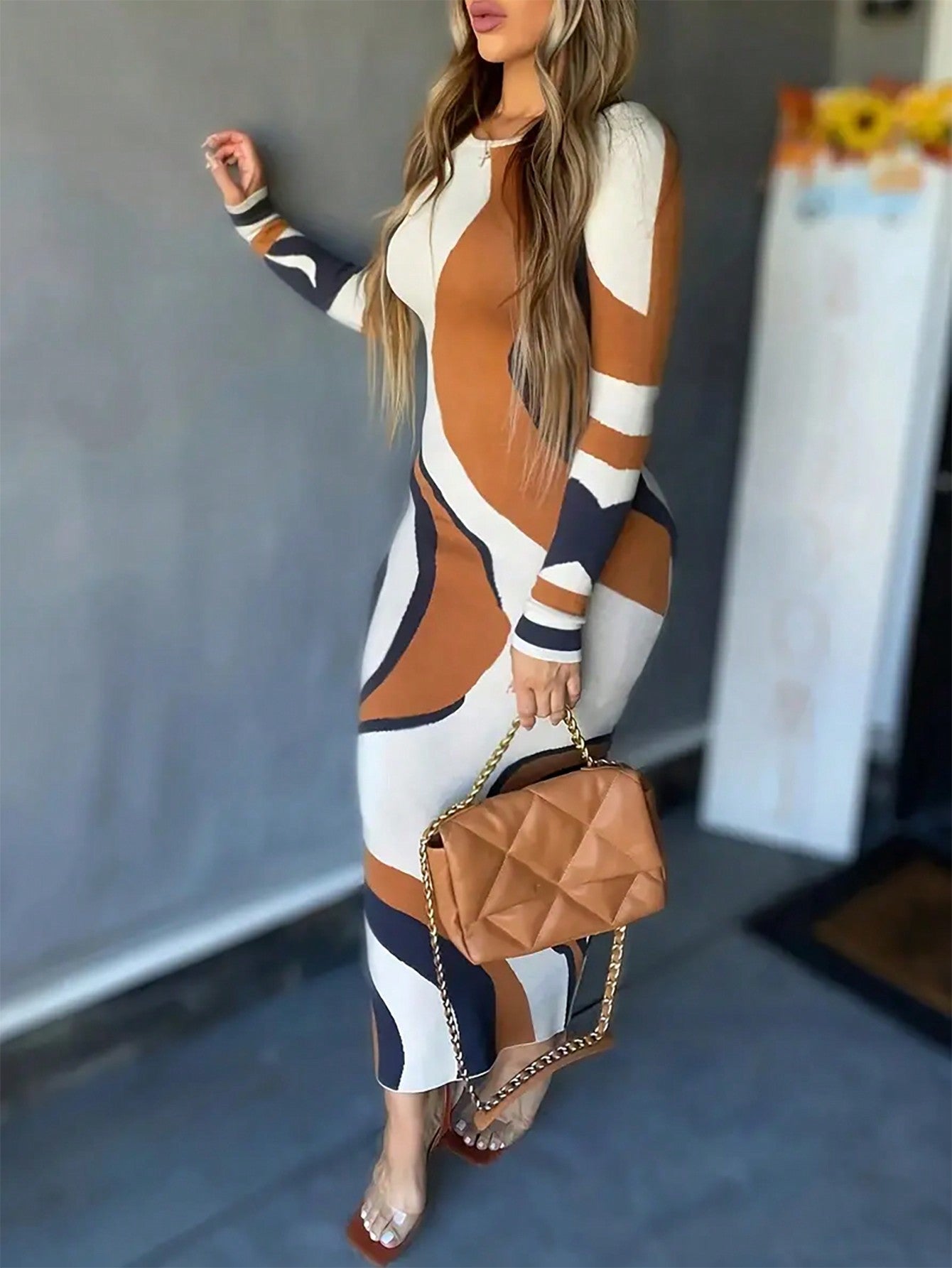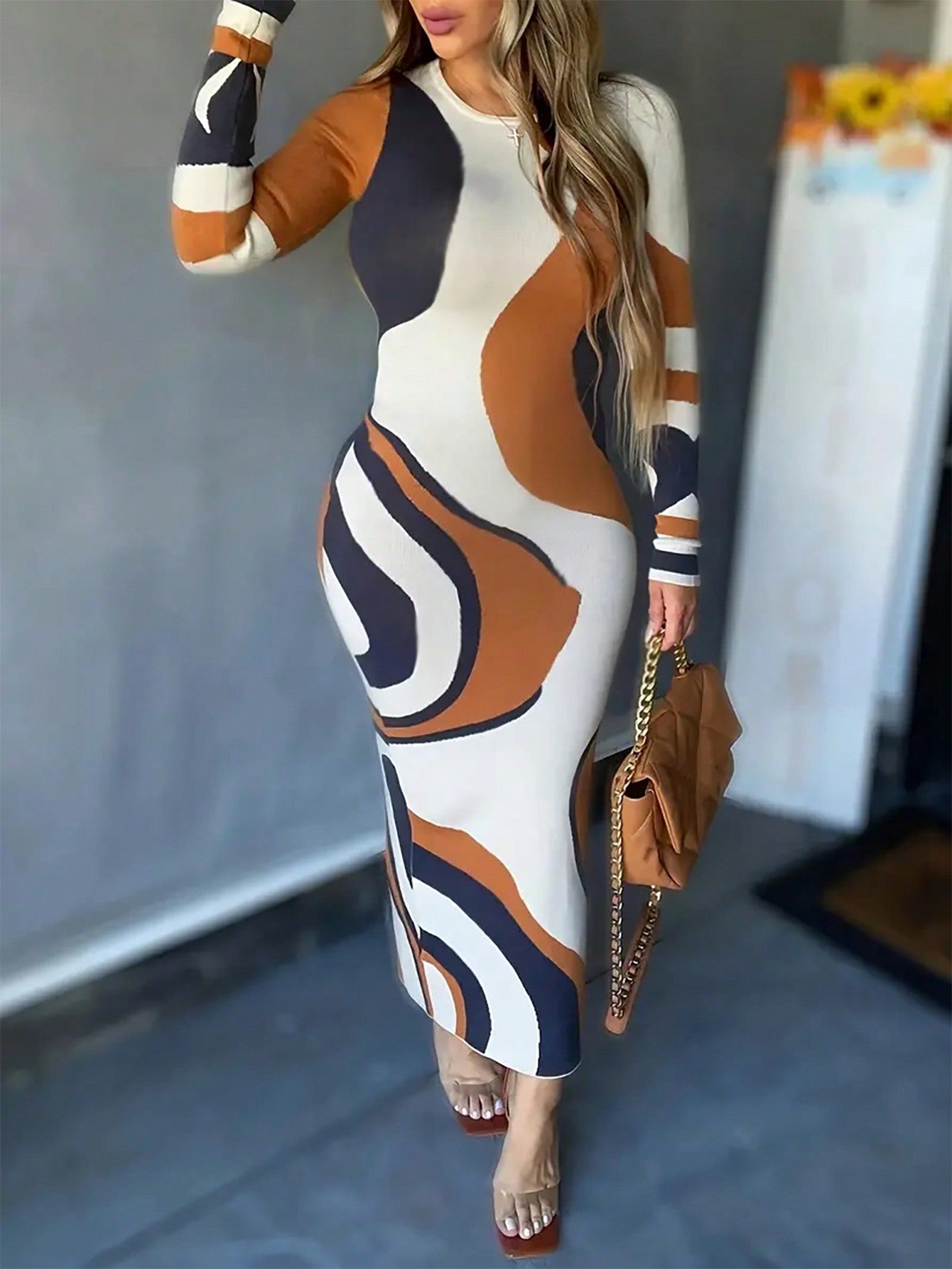 فستان نسائي برقبة دائرية وطبعة خطوط مجردة و تصميم عصري ملائم وذات أكمام طويلة