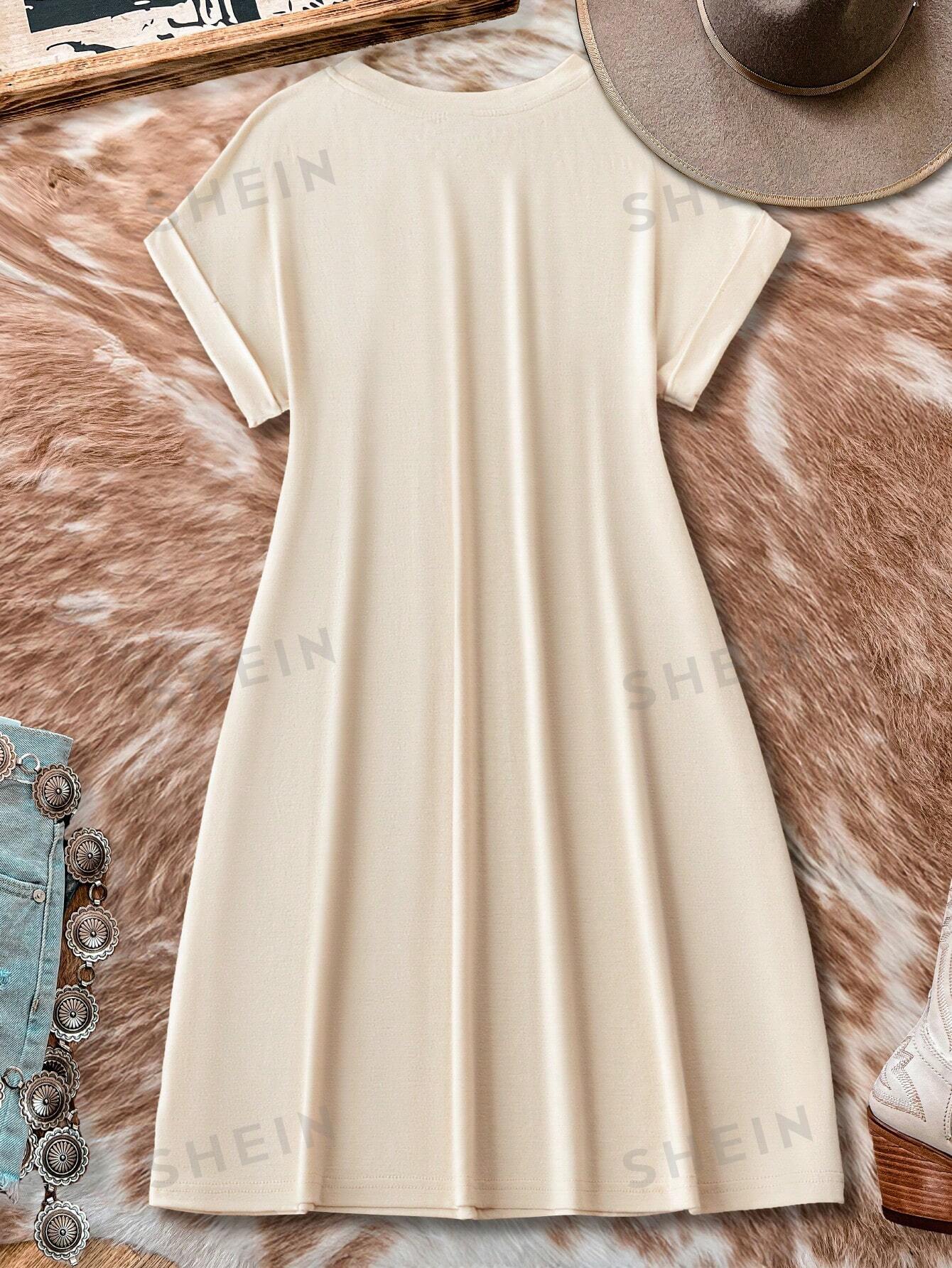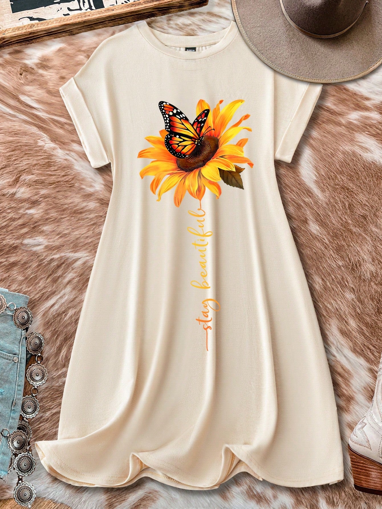 فستان نسائي برقبة دائرية و أكمام قصيرة واسعة القَصَّة بنمط دوار الشمس، مناسب للاستخدام الصيفي لتحافظي على جمالك