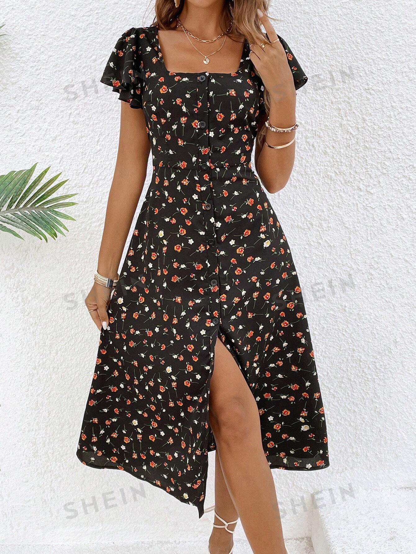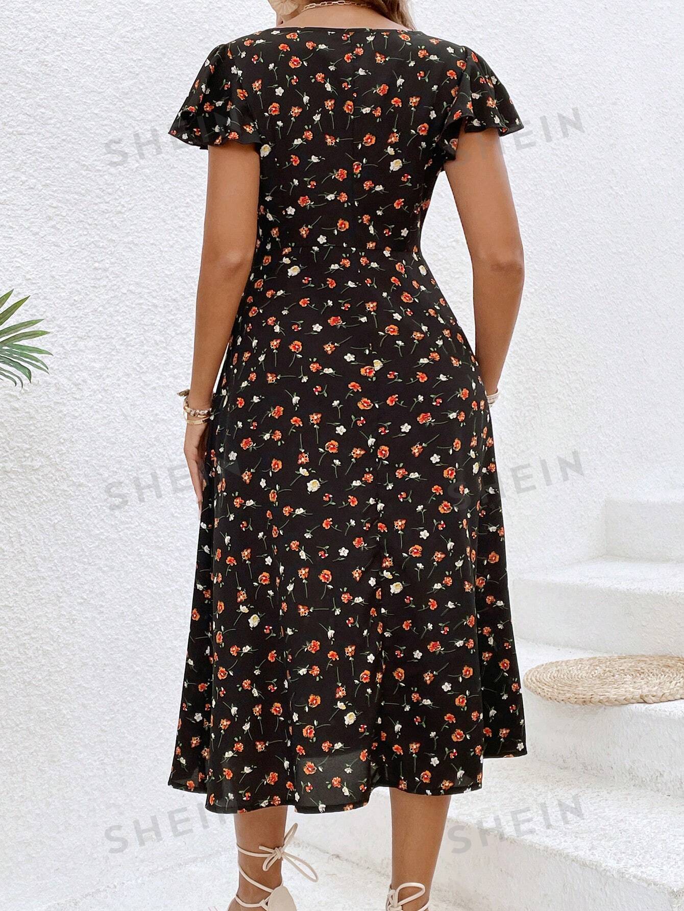 فستان نسائي بطبعات زهور مع ربطة عنق بنظام هالتر وفتحة جانبية