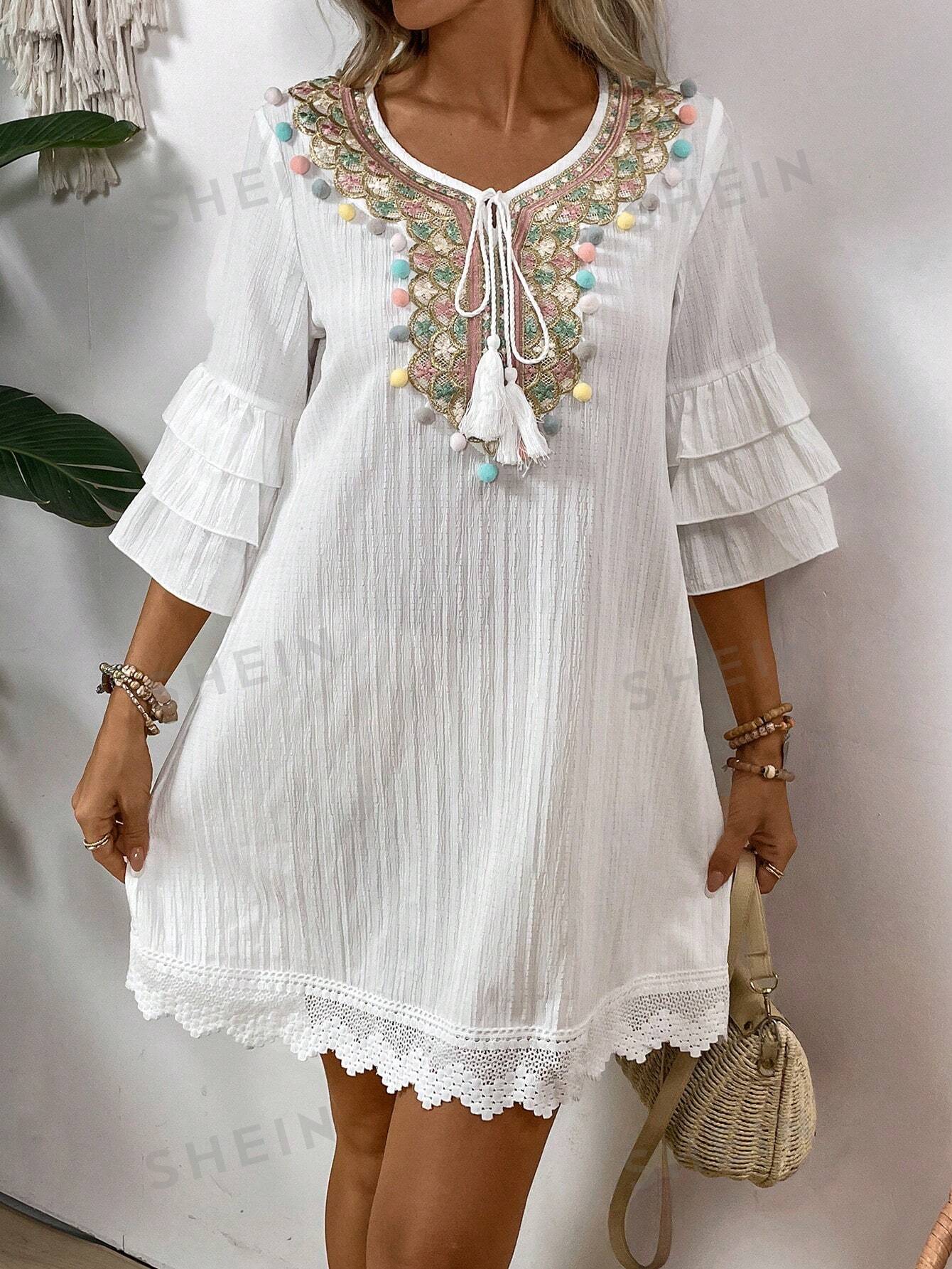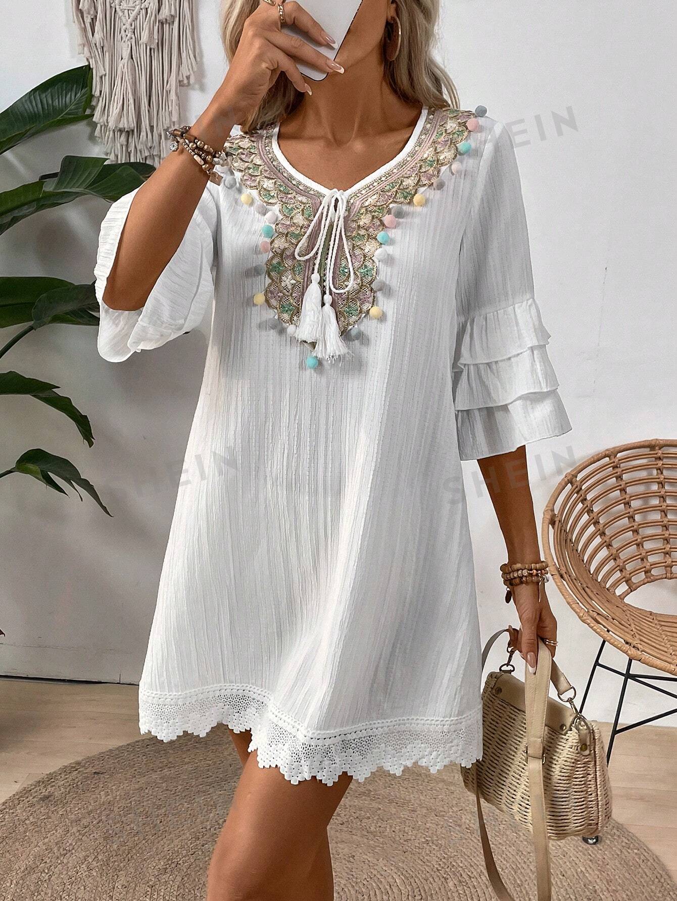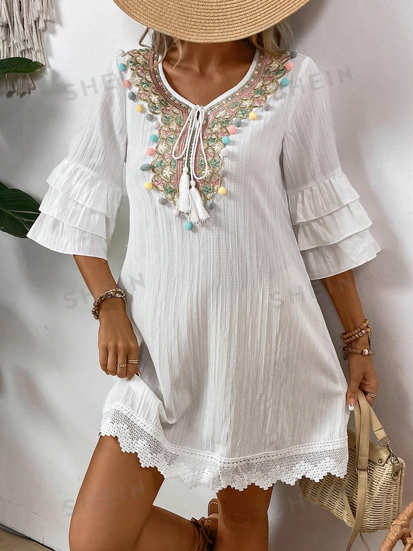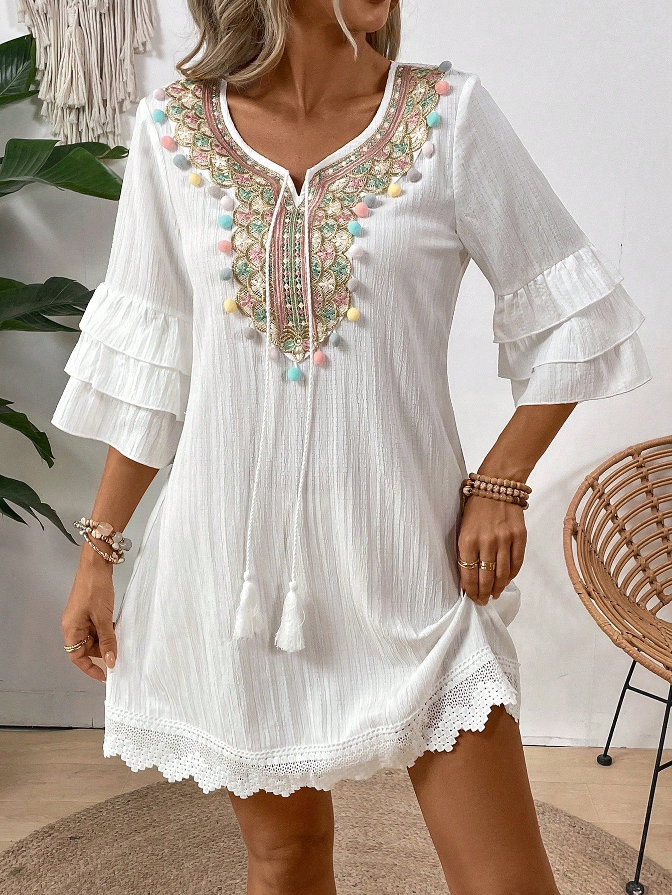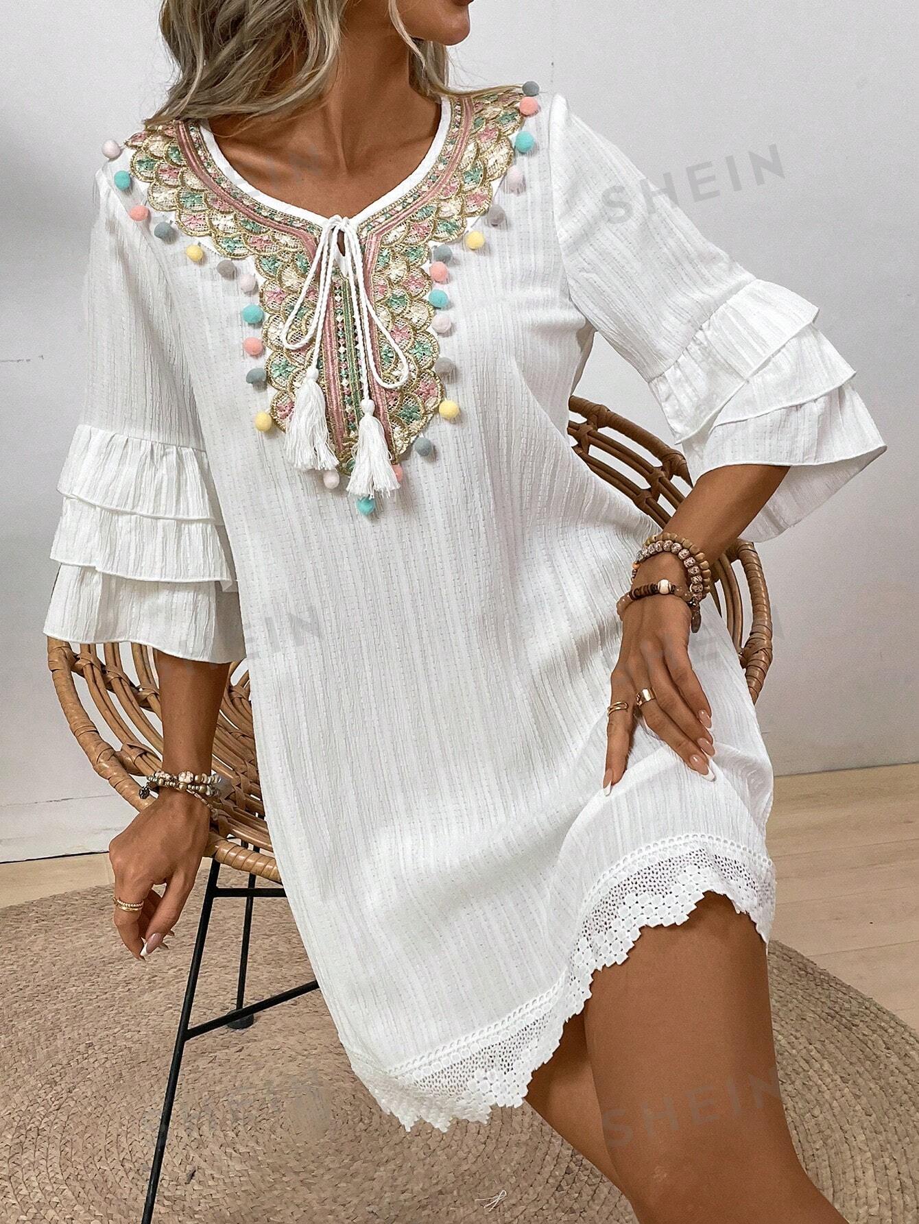 فستان نسائي بياقة على شكل حرف V بتفاصيل بوم بوم ملونة عصرية