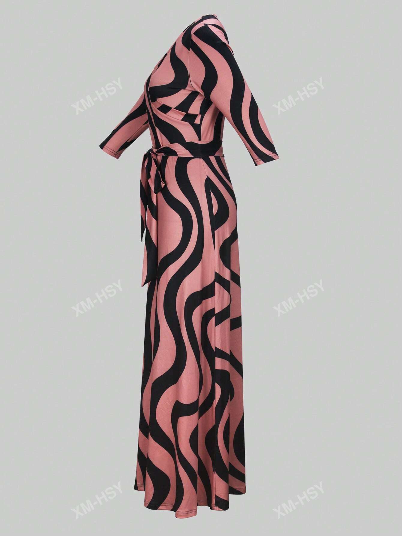 فستان نسائي بياقة على شكل حرف V وربطة ذاتية مع أكمام 3/4 بنمط متموج