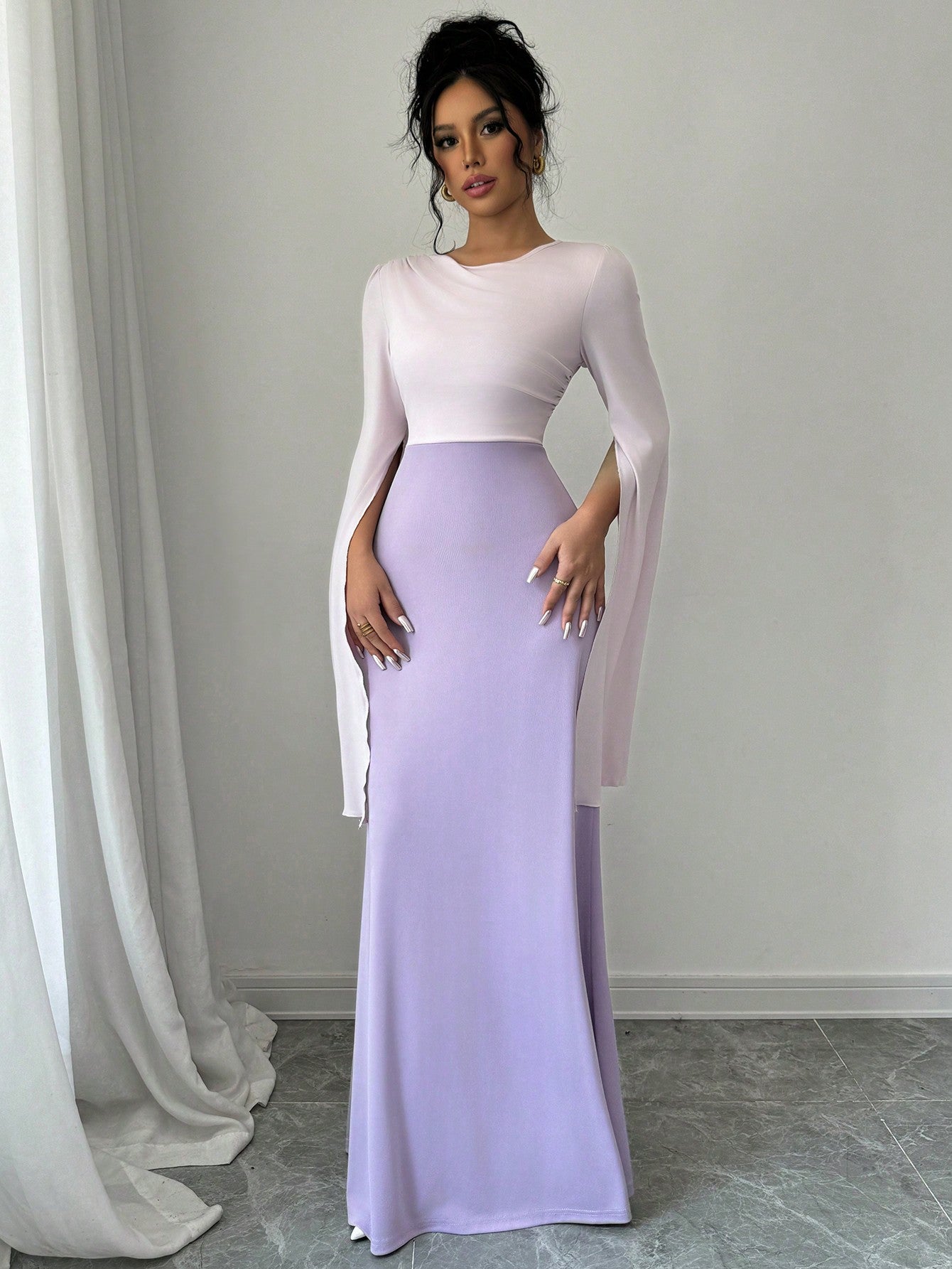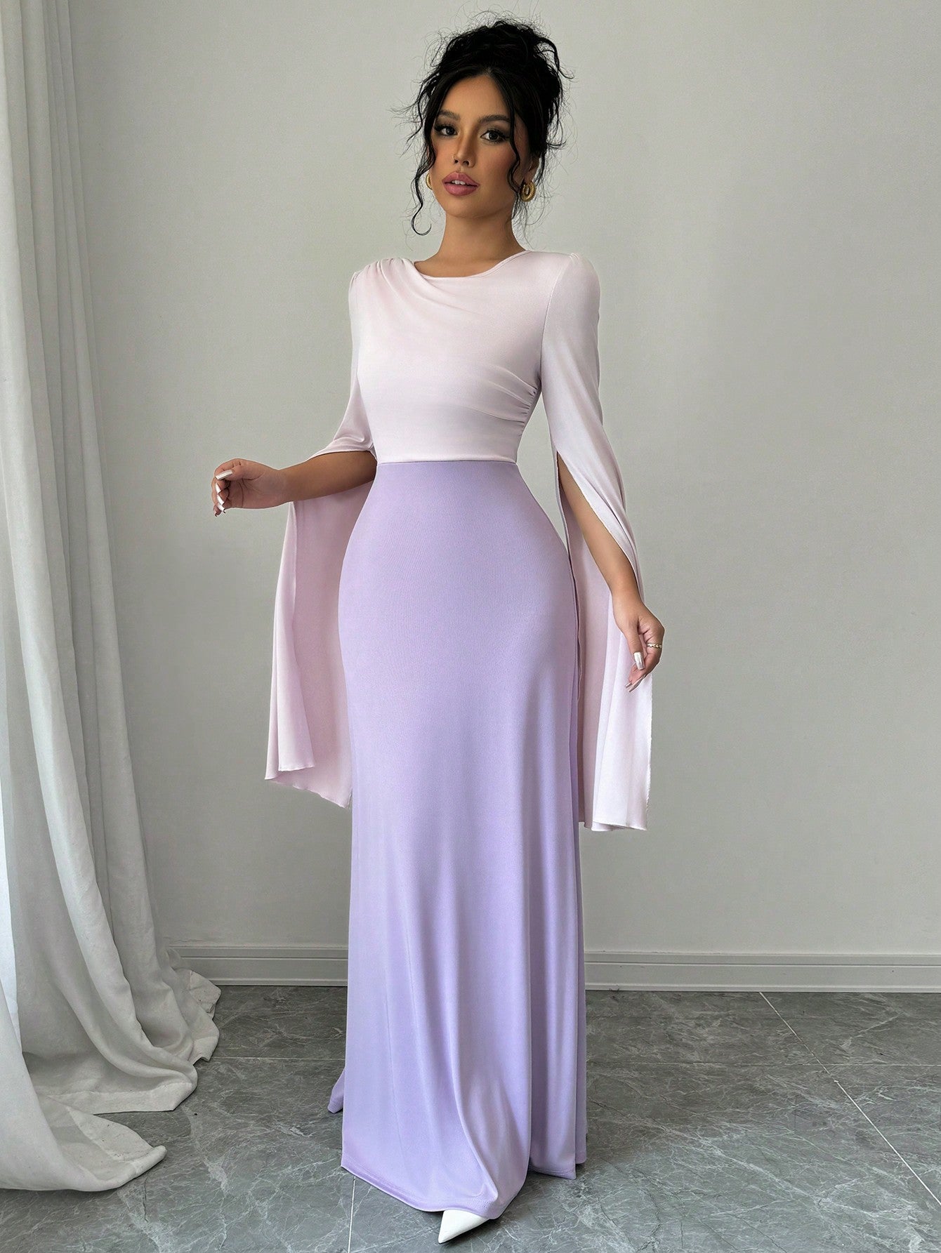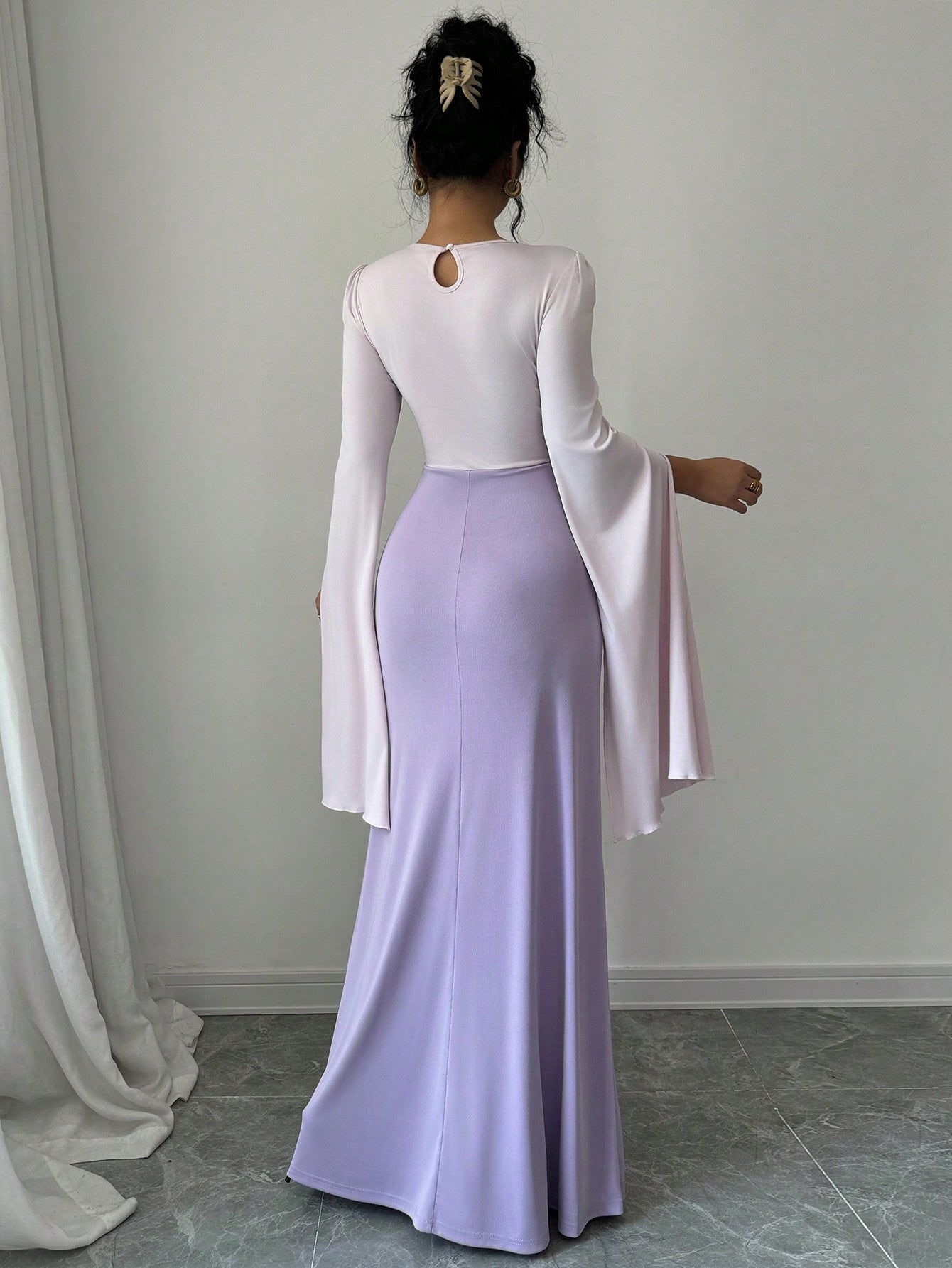 فستان نسائي طويل ذو أكمام منفصلة واسعة مخضر الذيل