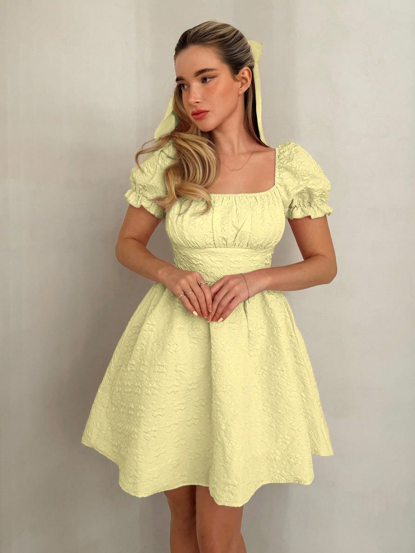 فستان نسيج ذو ملمس مطوي بياقة مربعة لون ساده