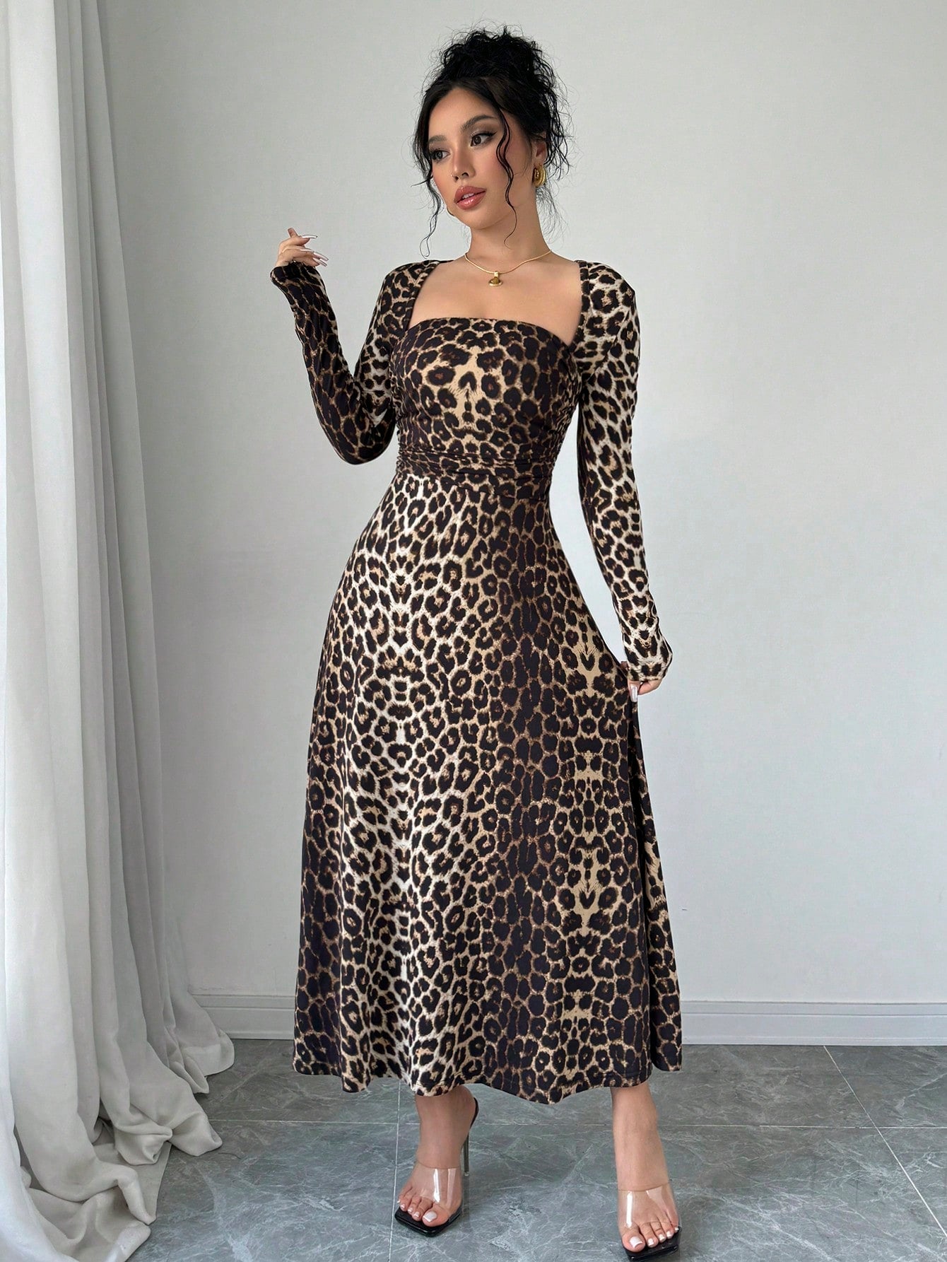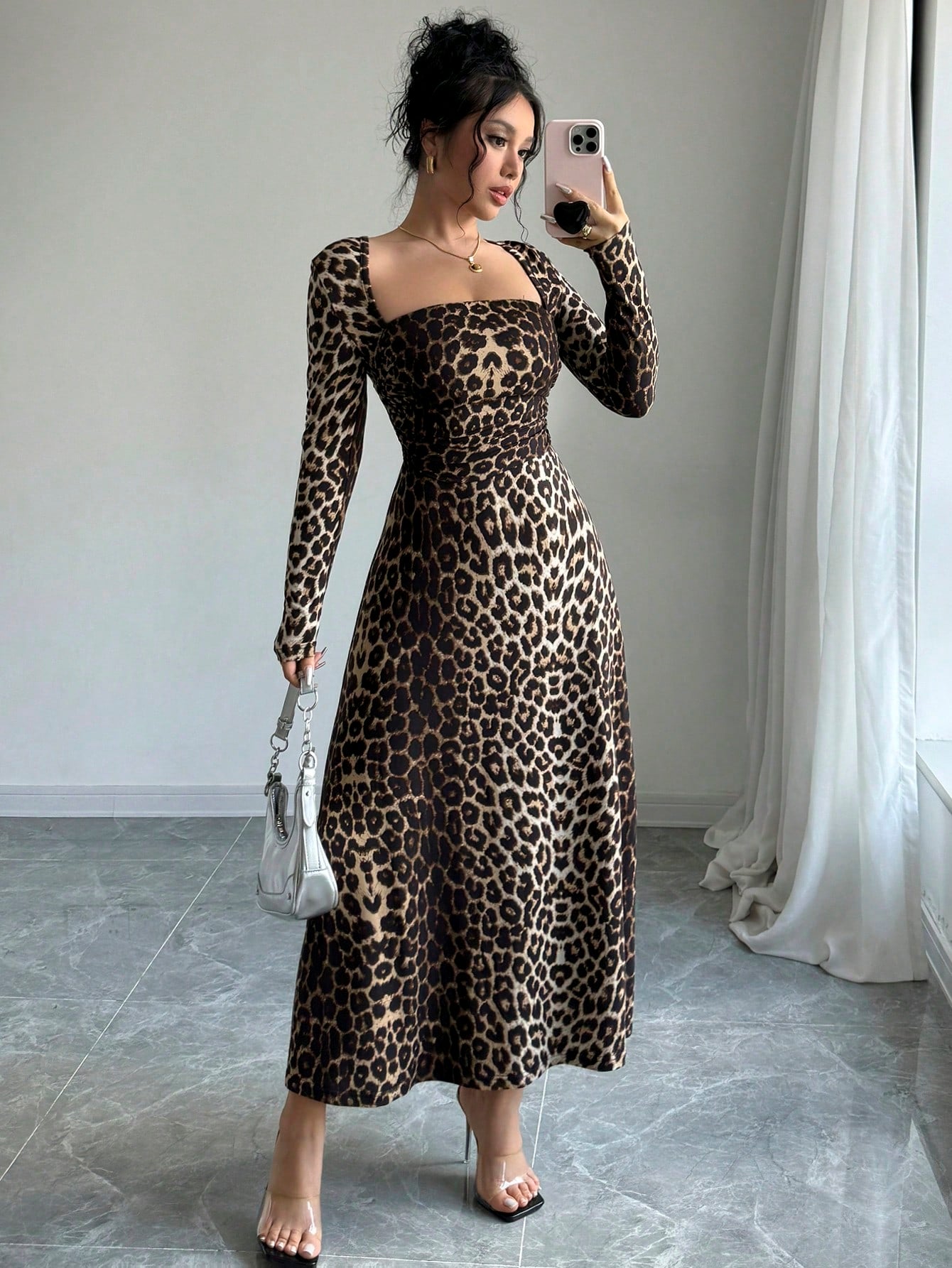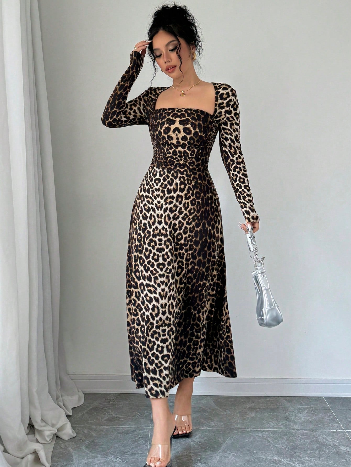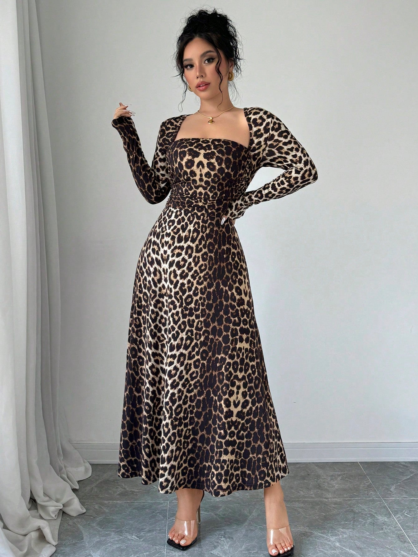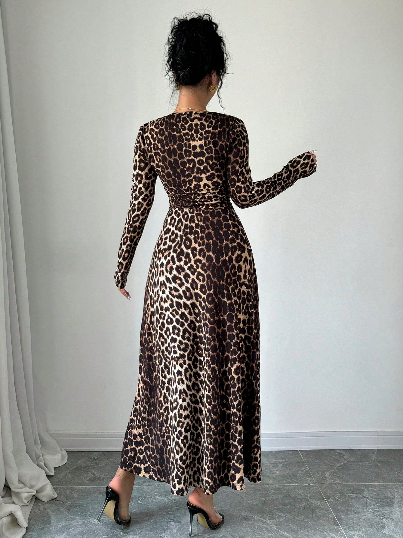 فستان نمر متوسط الطول بطيات عند الخصر بأكمام طويلة وياقة مستديرة للنساء ، ربيع وخريف