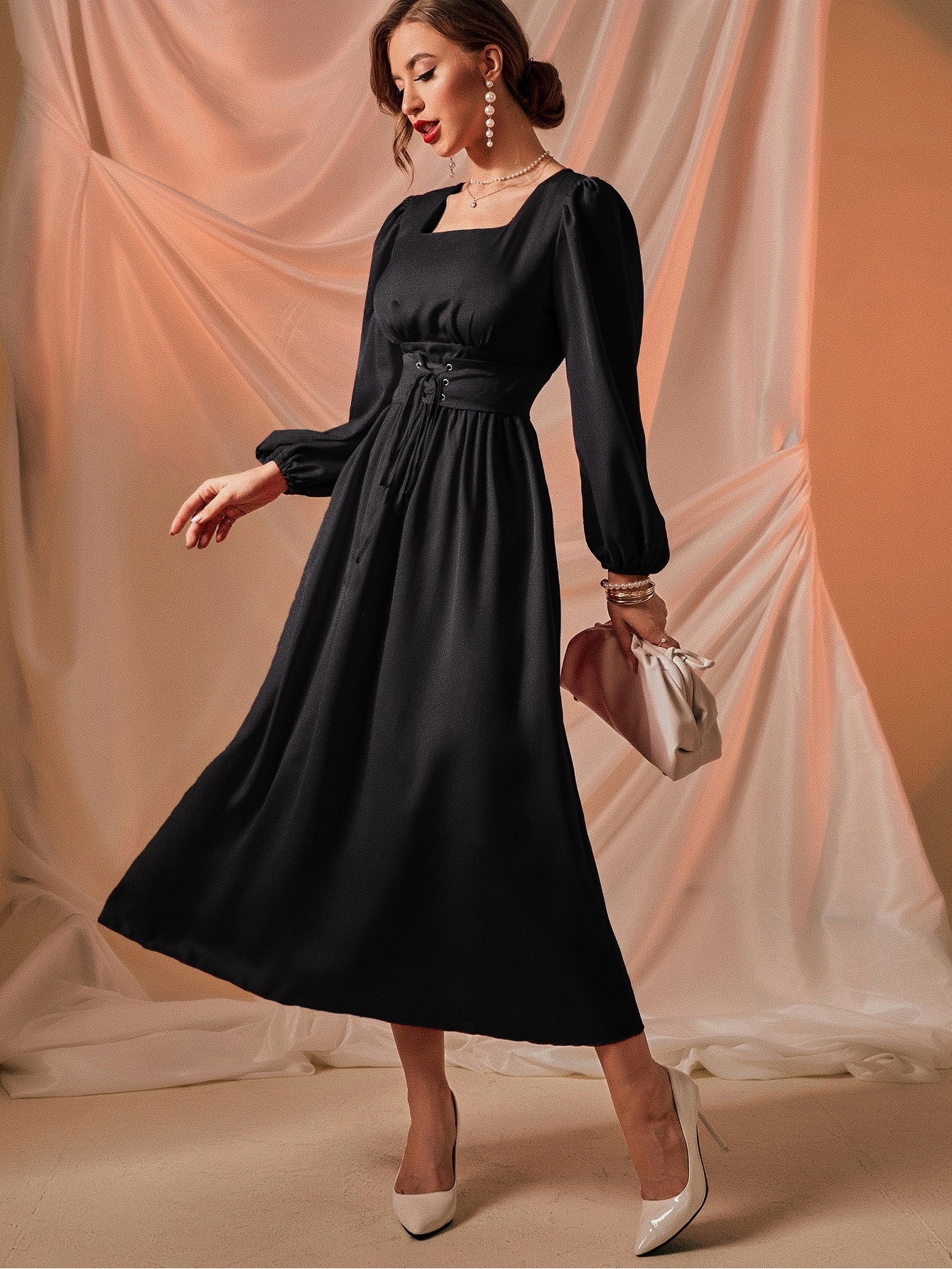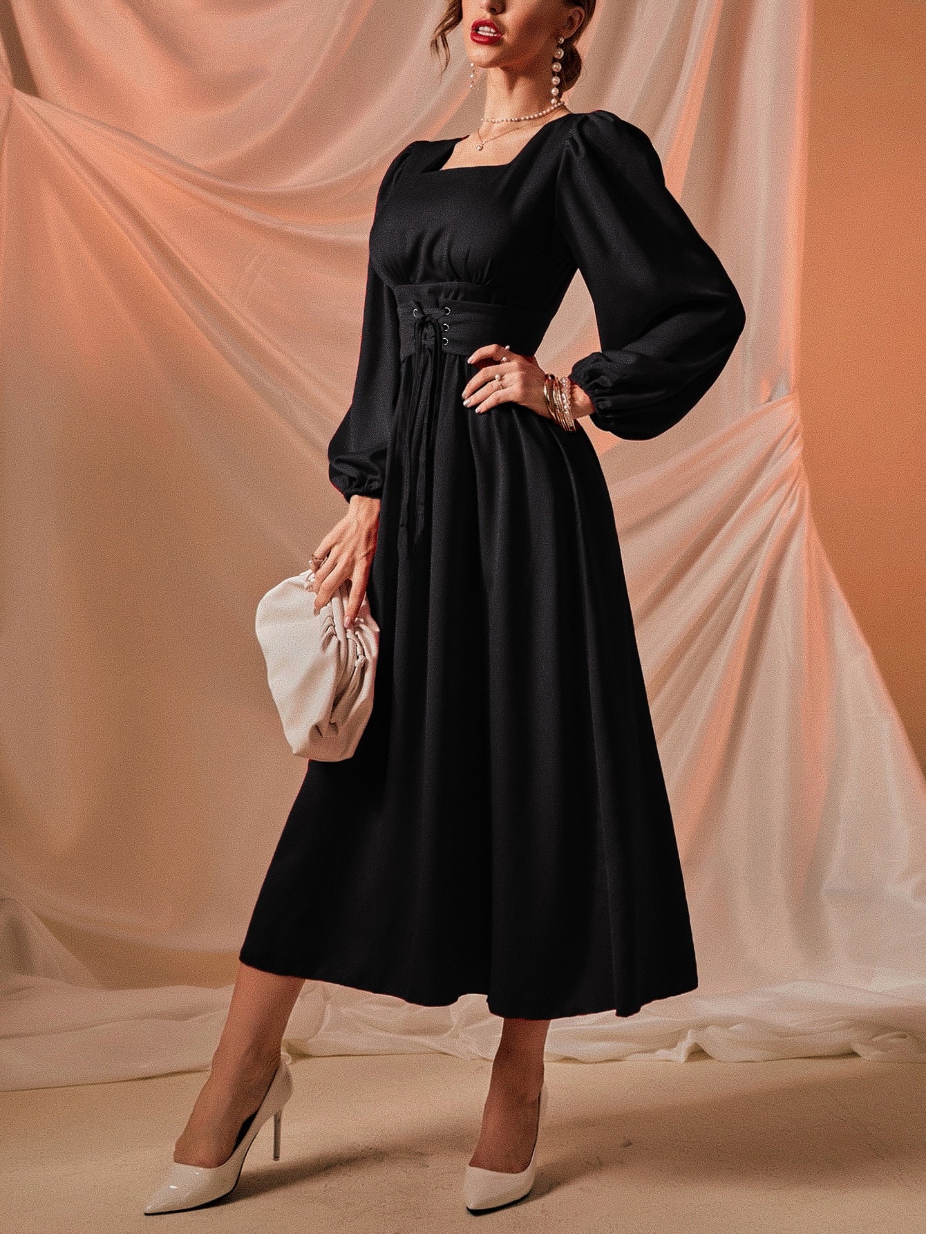 فستان ياقة مربع أكمام فانوس رباط امامي