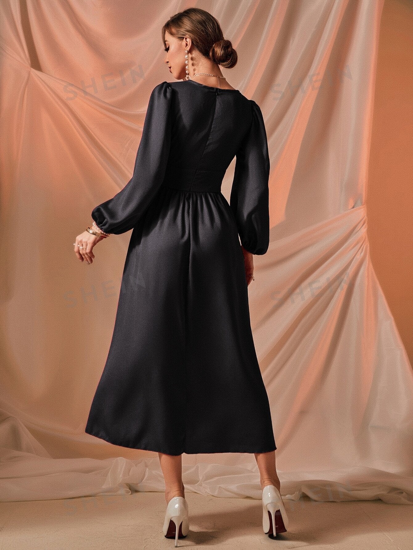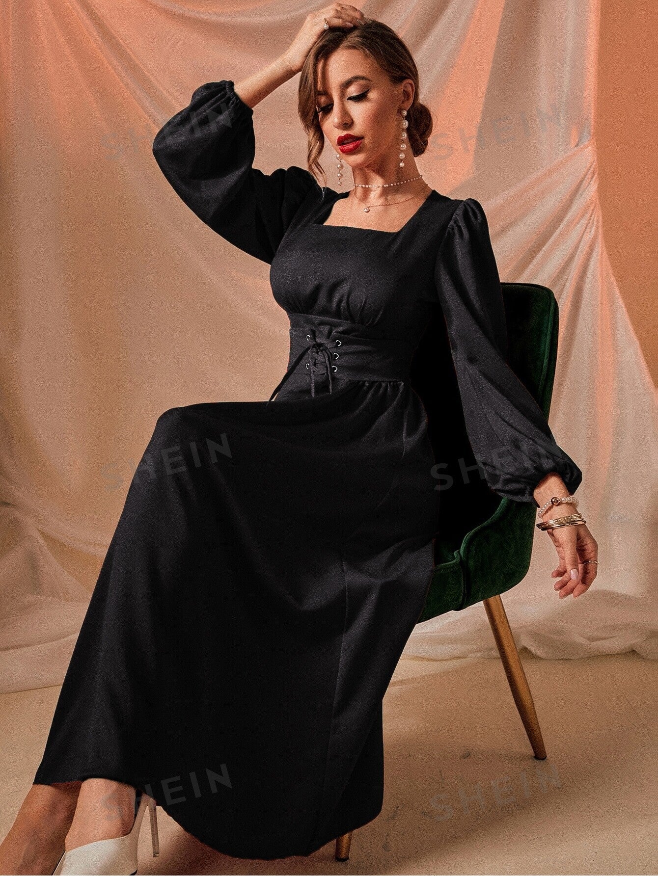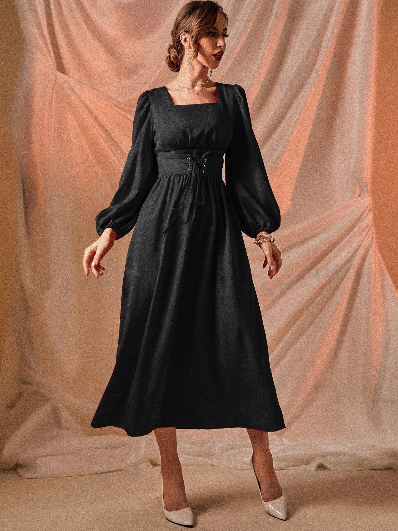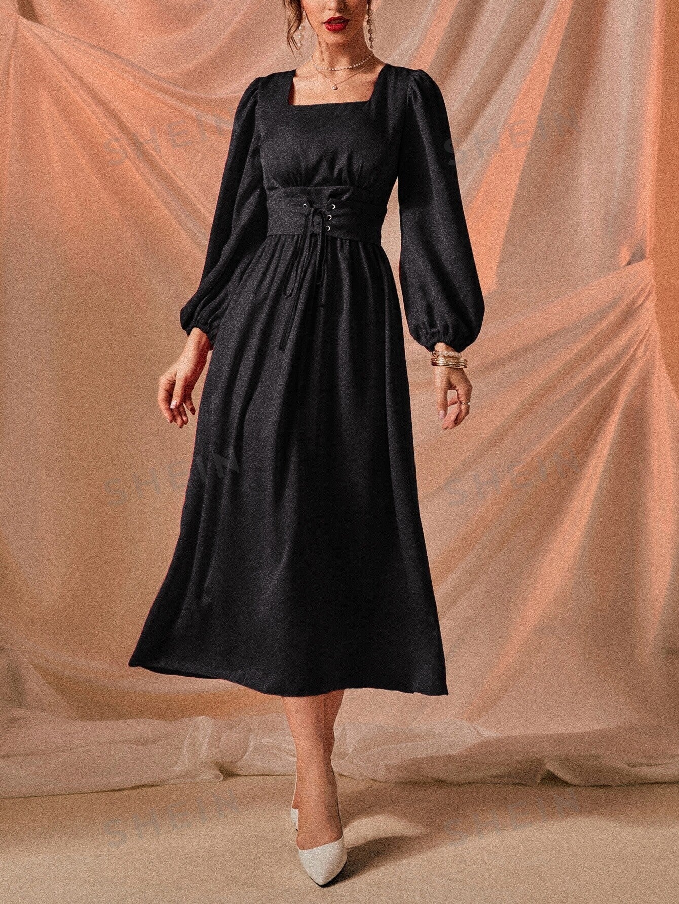 فستان ياقة مربع أكمام فانوس رباط امامي