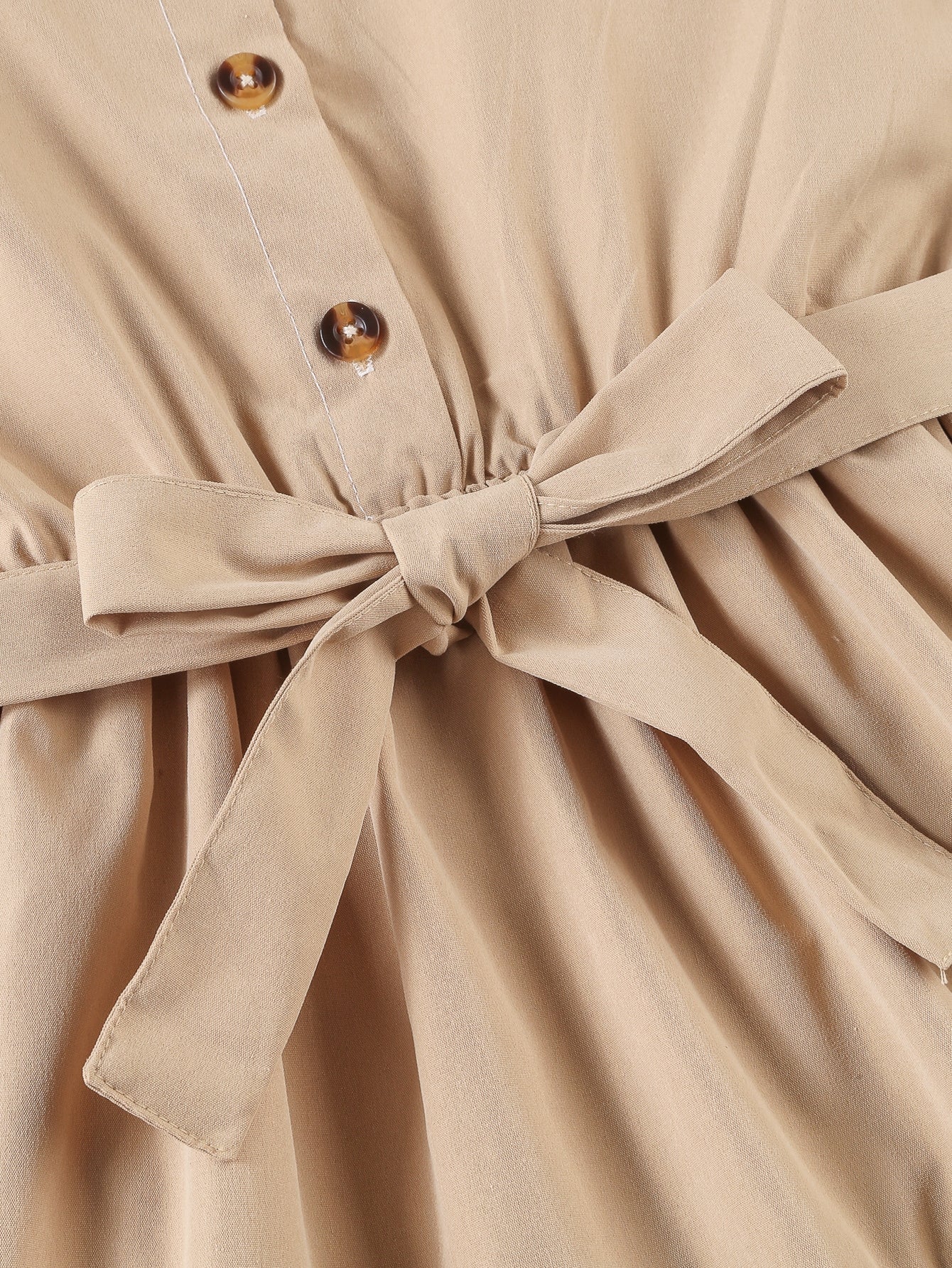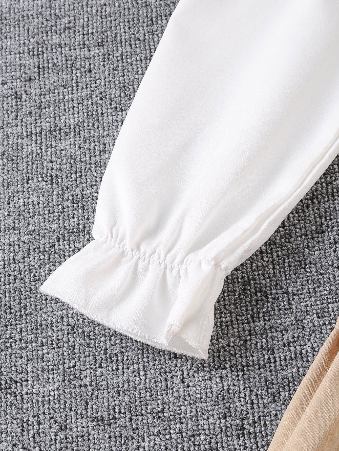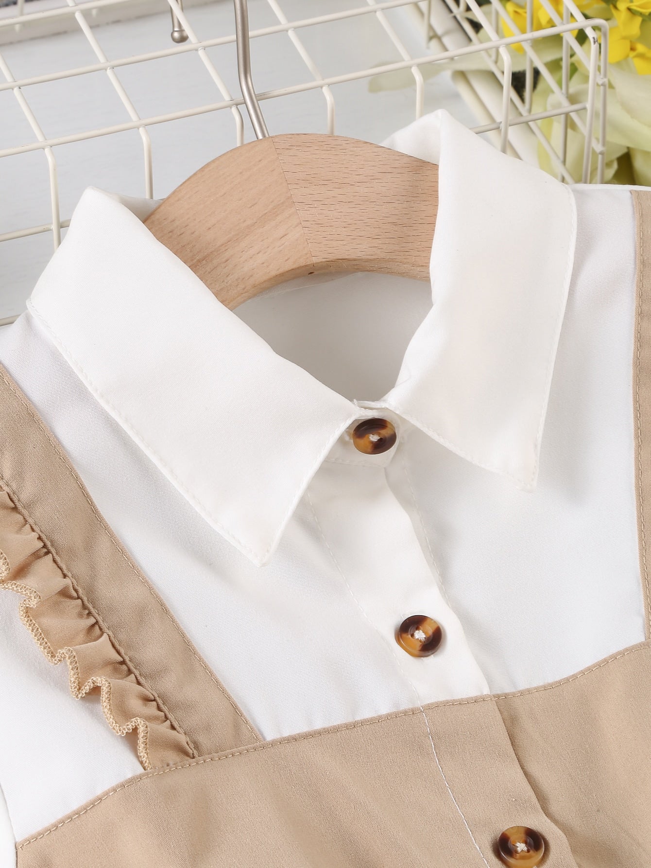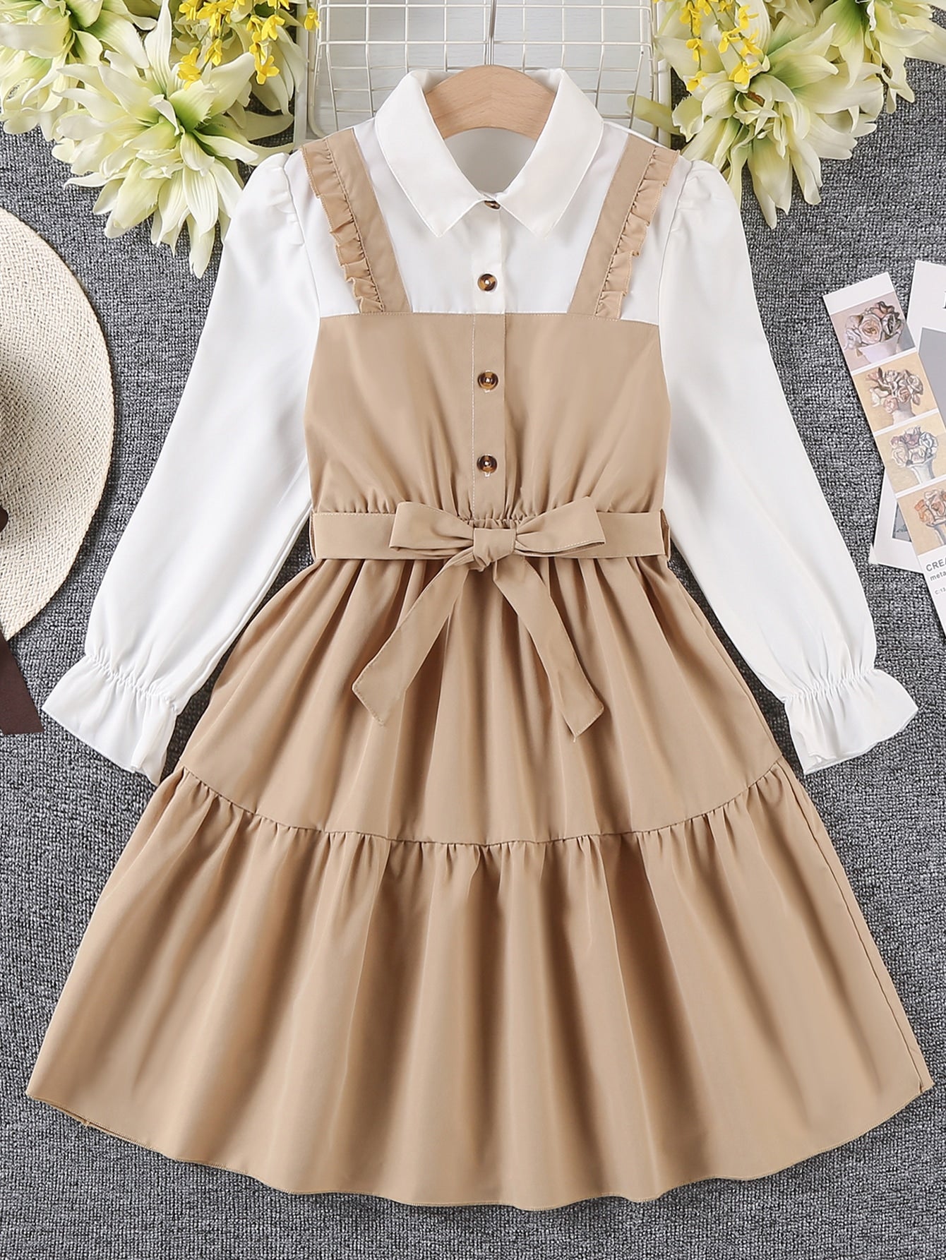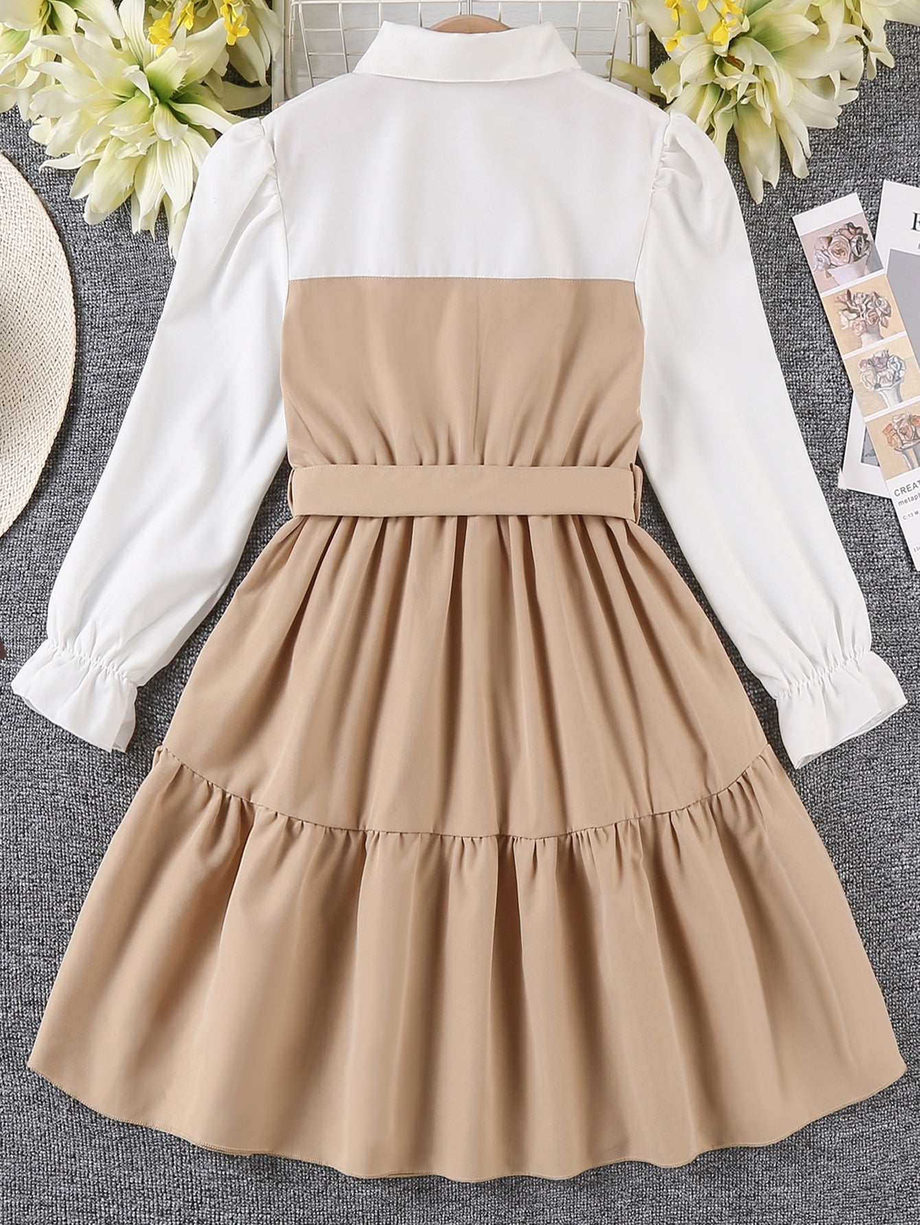 فستان 2 في 1 ألوان متباينة اكمام منتفضة حافة مكشكشة حزام بنات