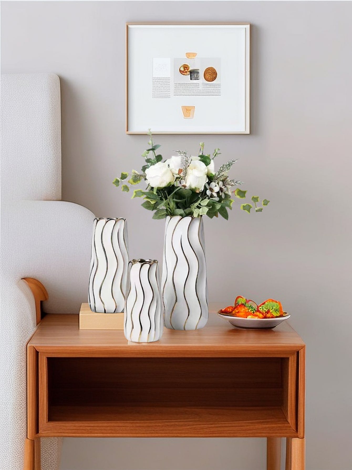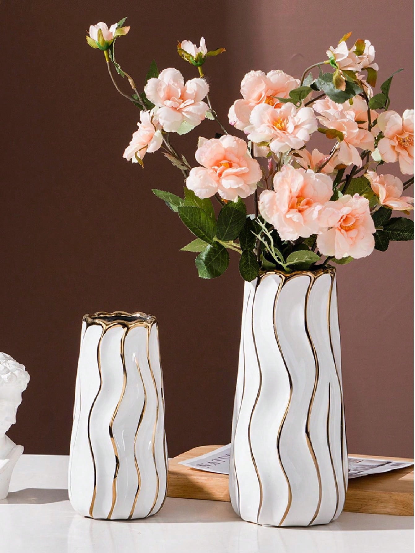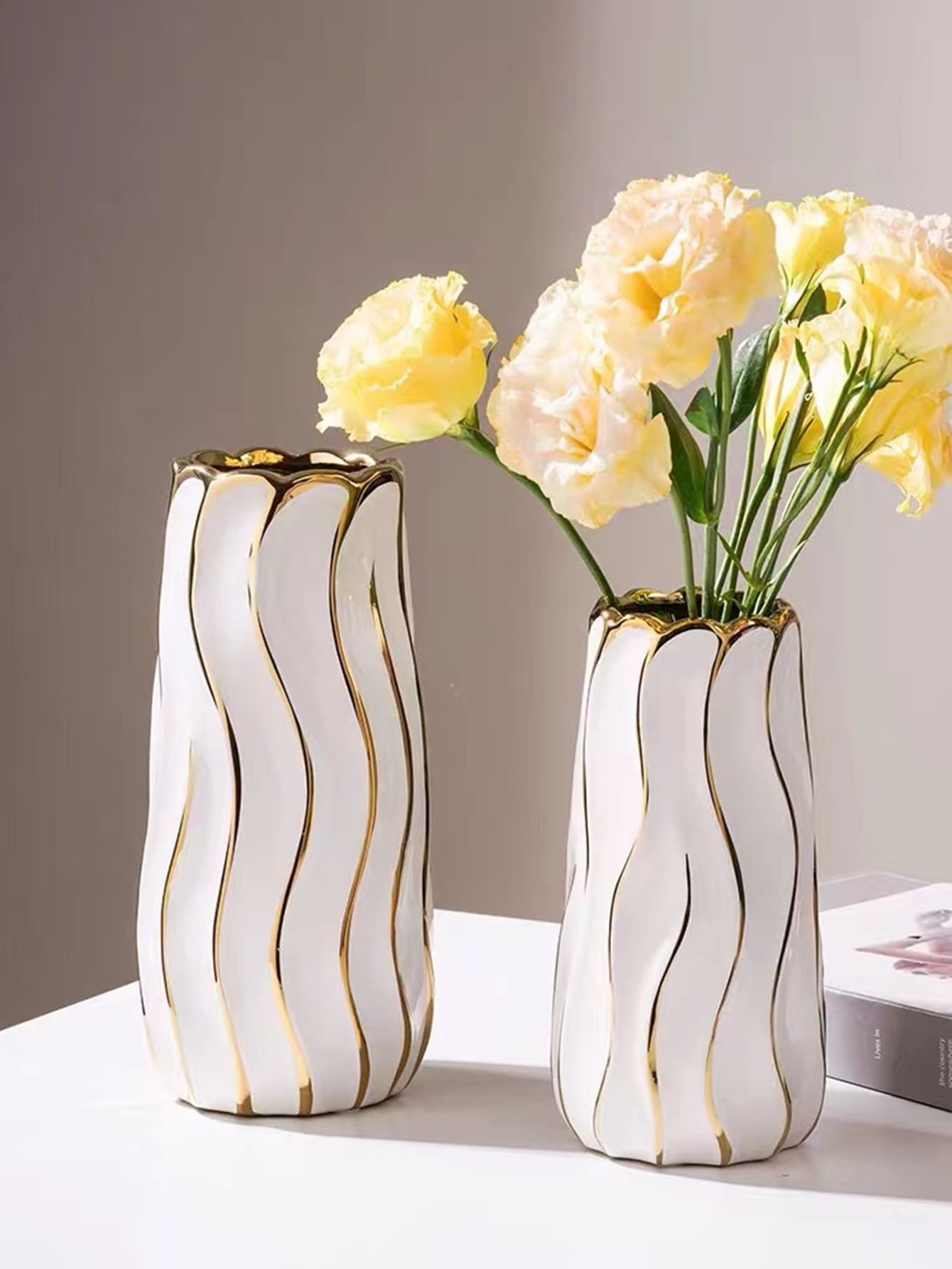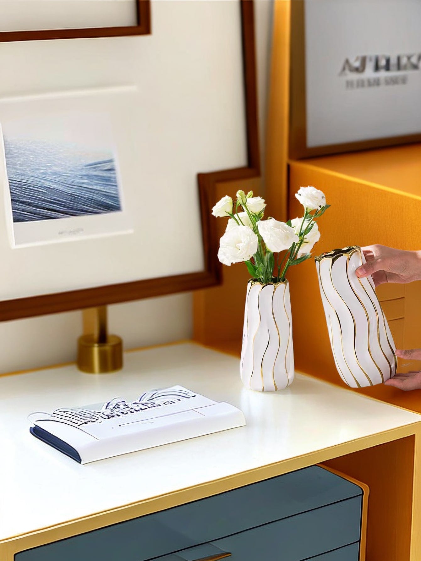 قارورة كبيرة بتصميم بسيط باللون الأبيض والذهبي