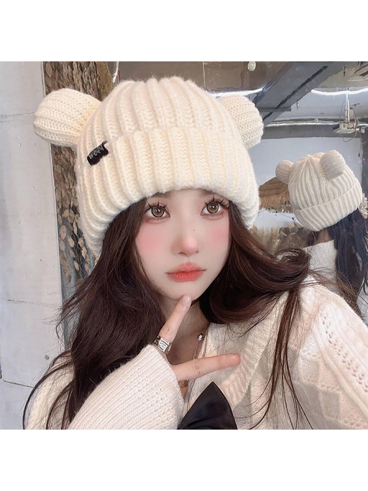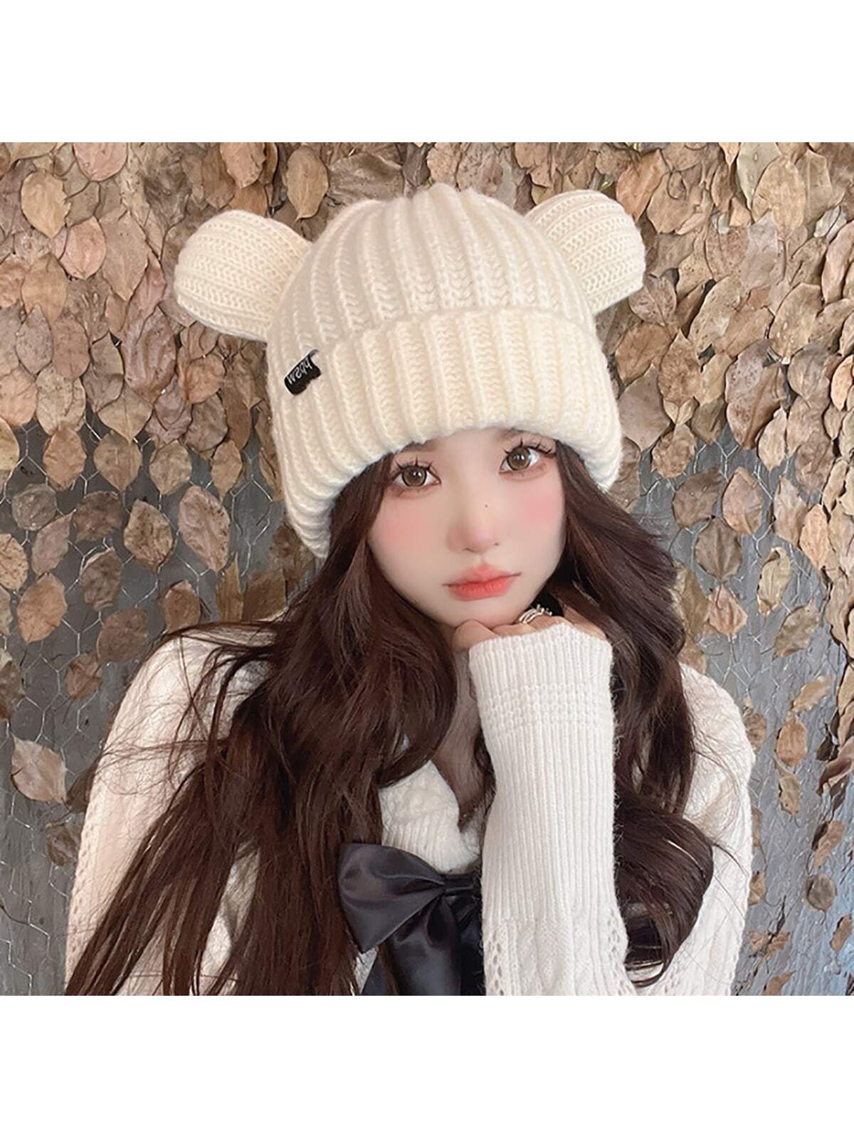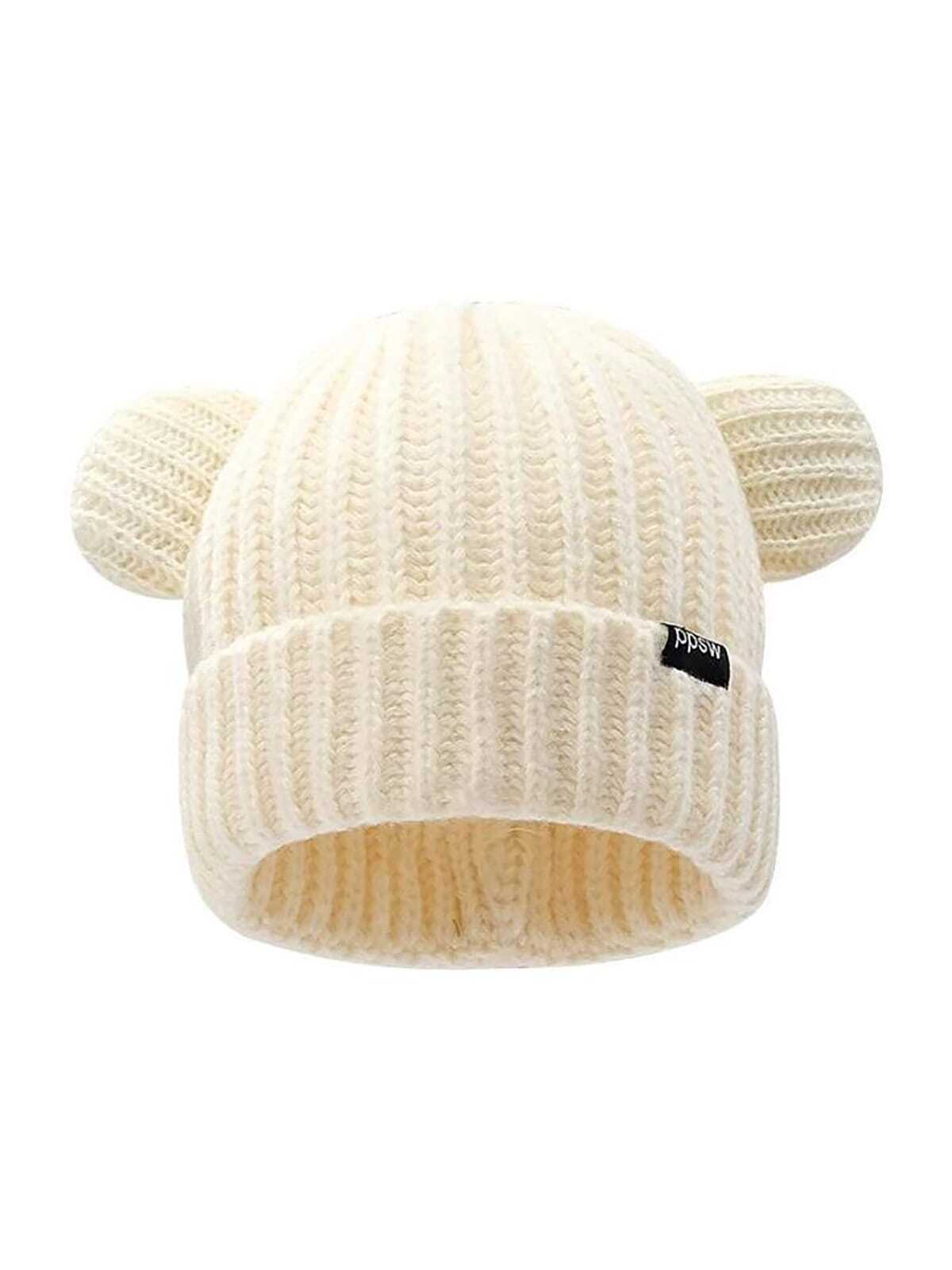 قبعة محبوكة بلون واحد سميكة مزودة بتوشيحة مدبلجة بشكل آذان الدب