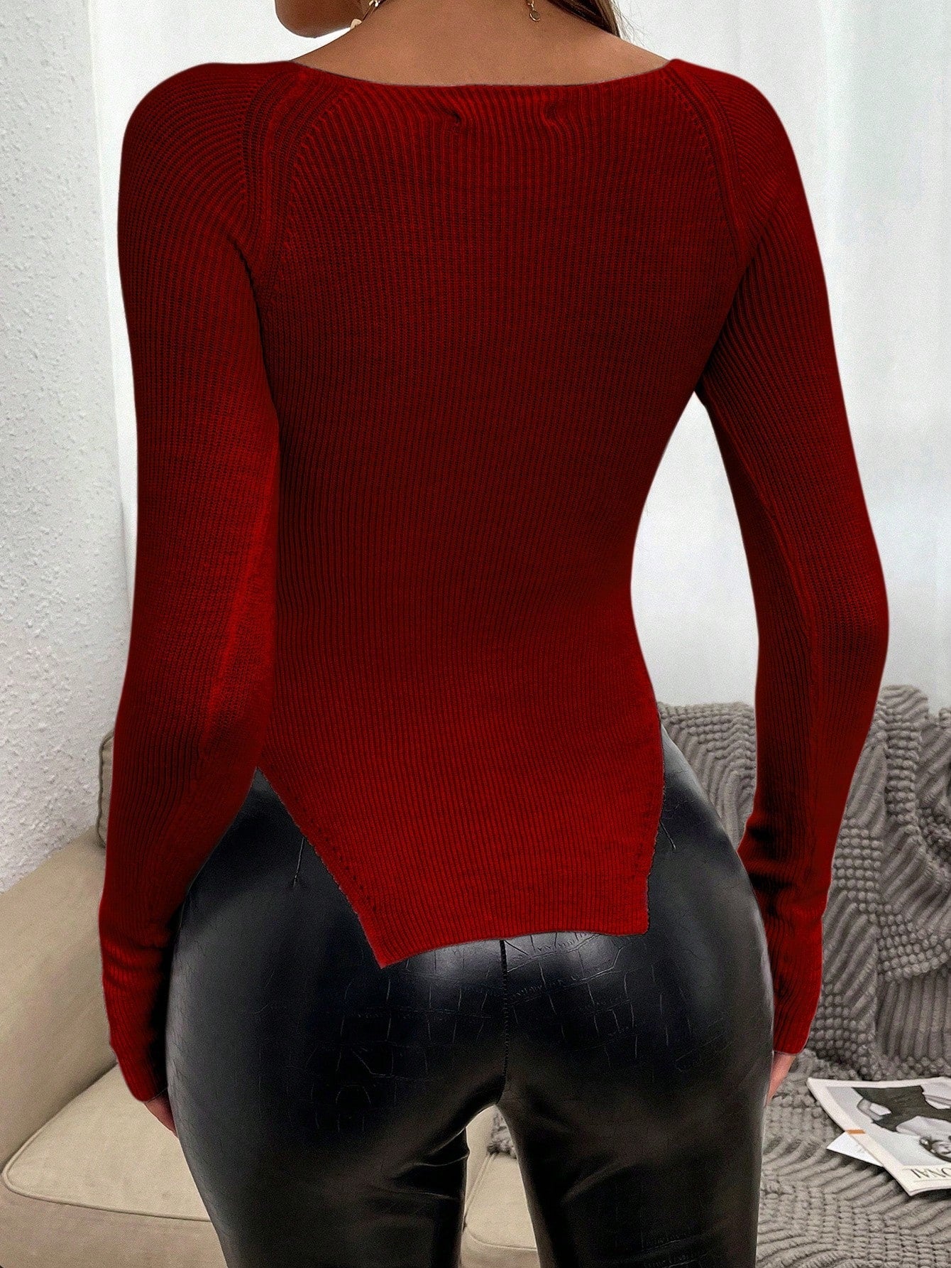 قميص صوفي بياقة القلب و انقسام جانبي من نفس اللون