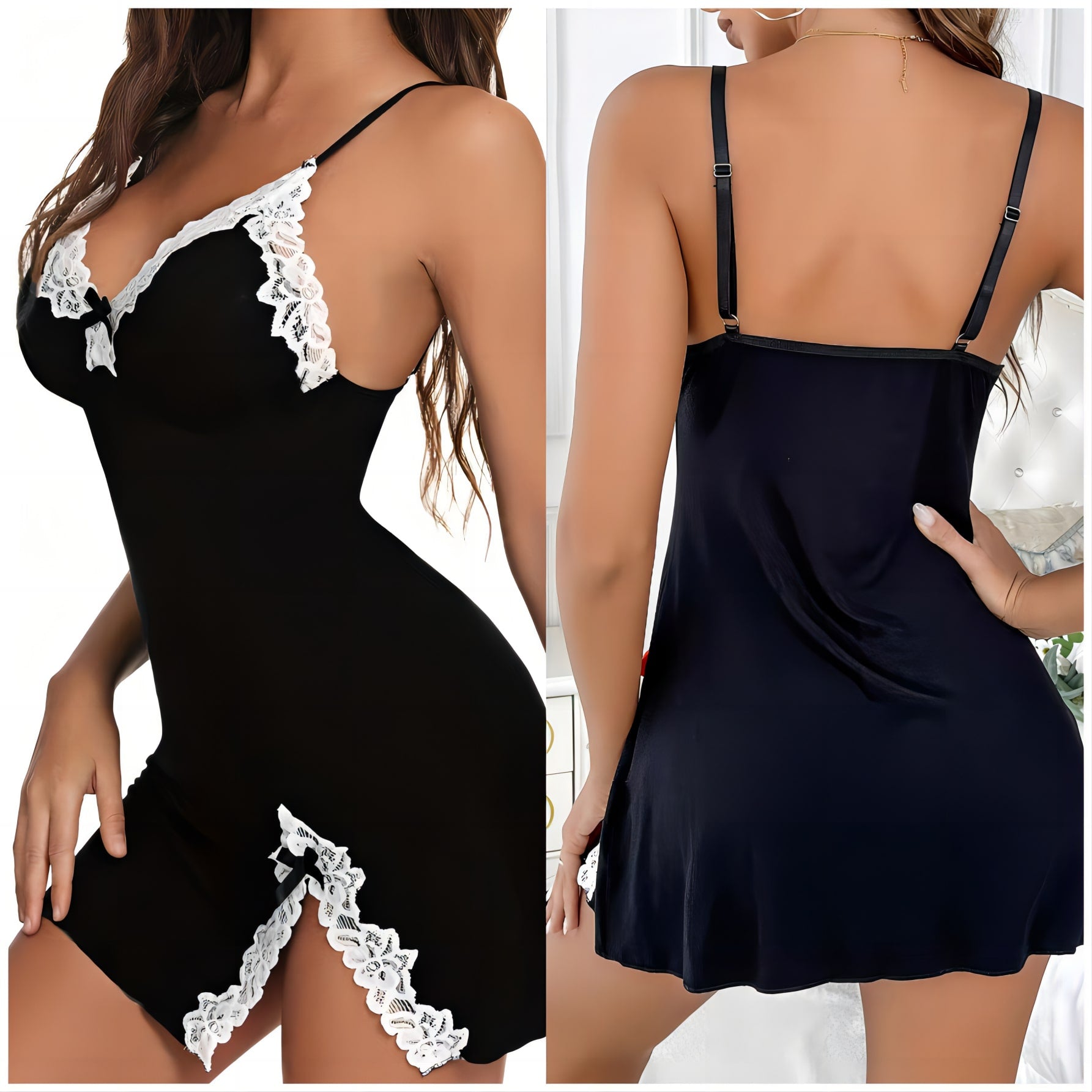 قميص نوم قصير بشريط دانتيل و عقدة أمامية و فتحة جانبية، قميص نوم