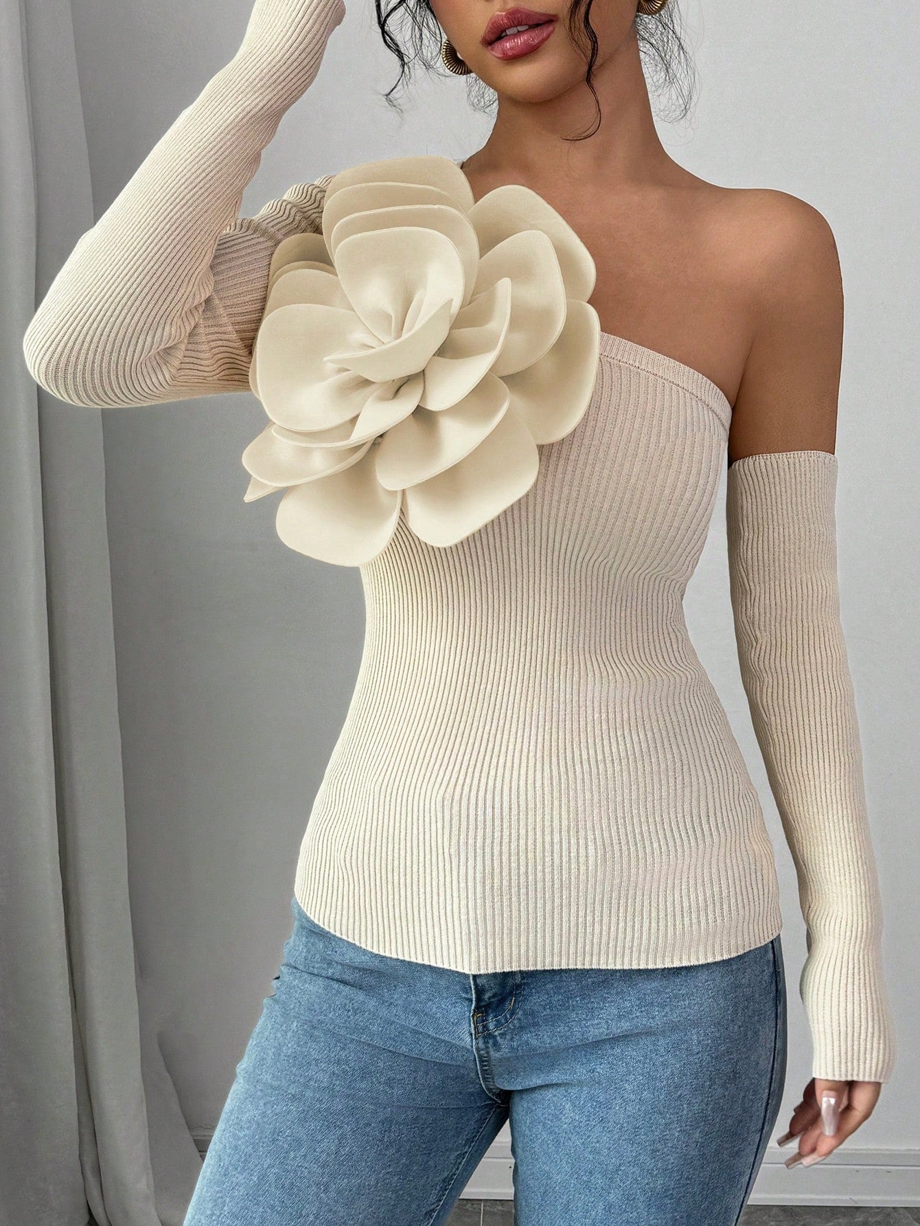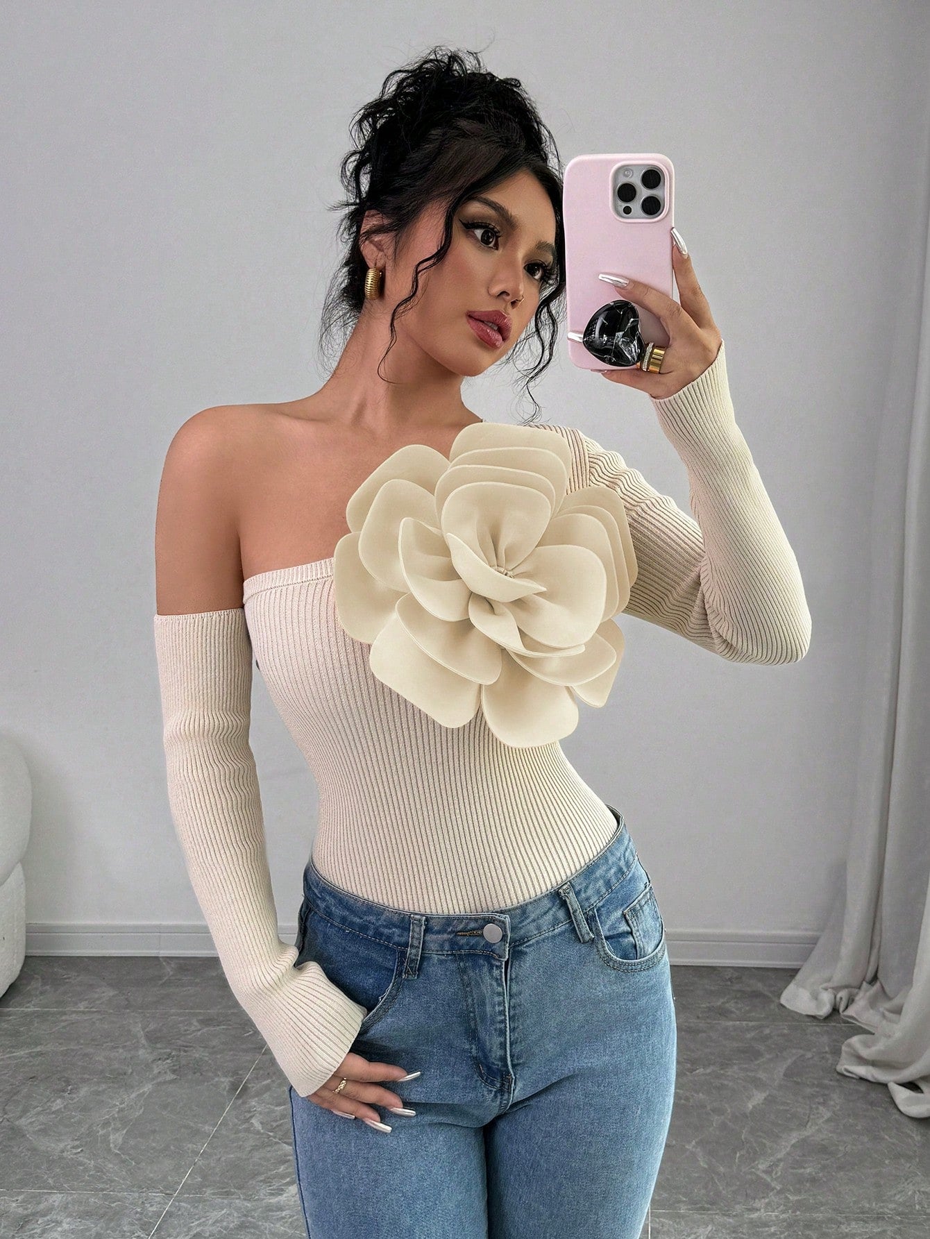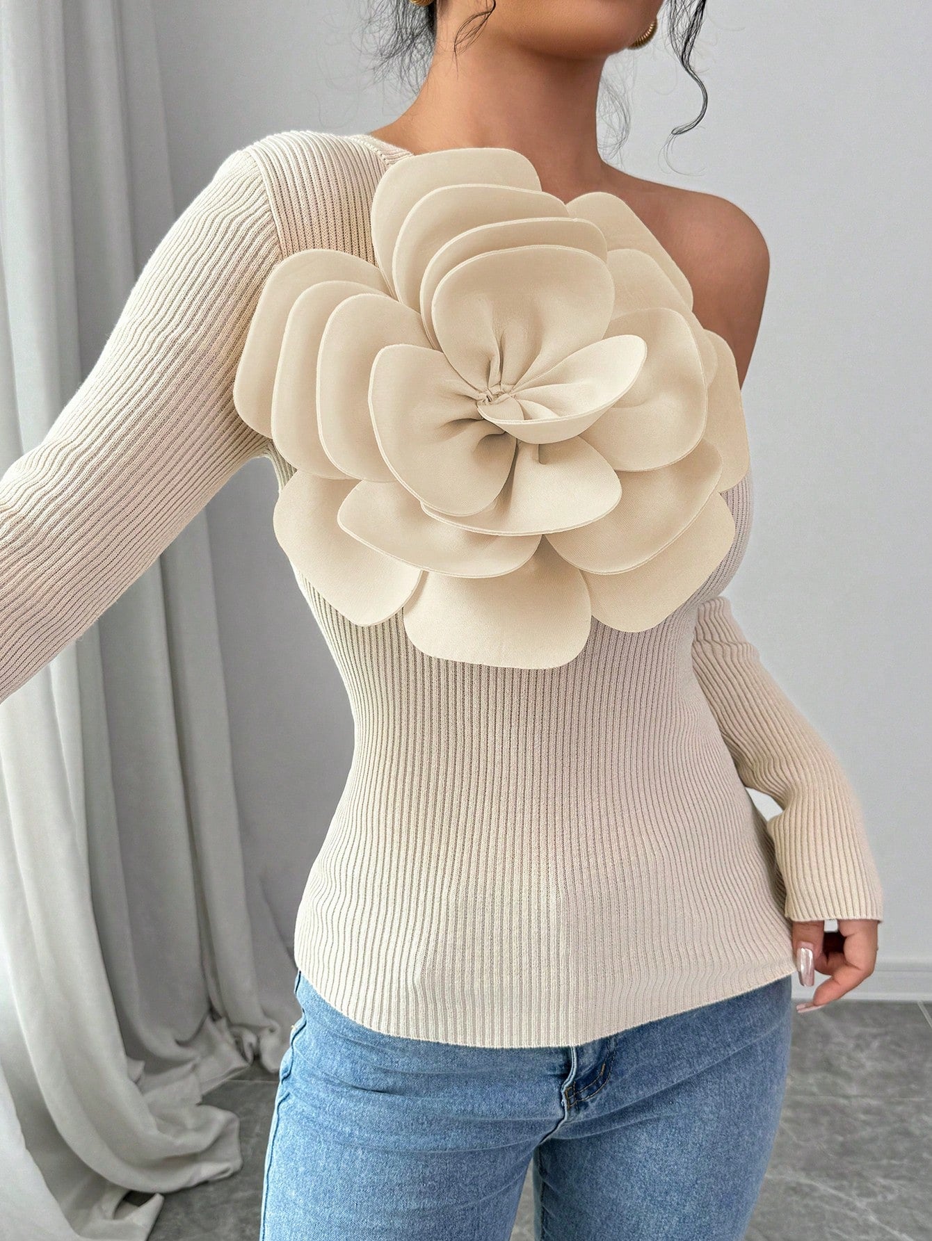 كنزة صوفية صوفية ضيقة للنساء مزينة بتفاصيل زهرية مع فتحة في الكتف ، مناسبة للخريف / الشتاء