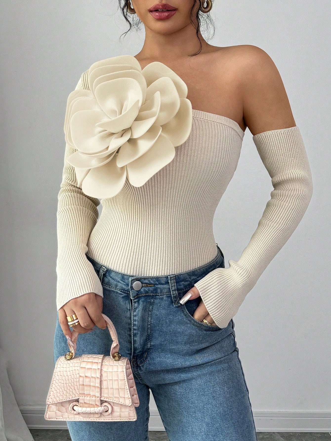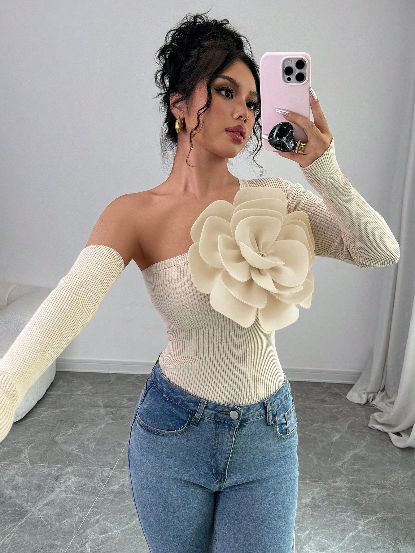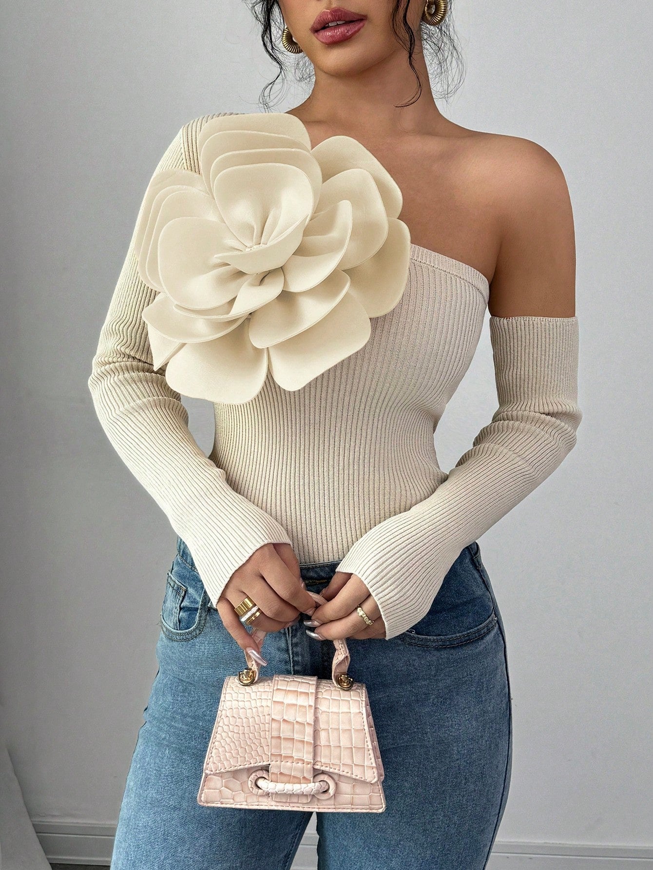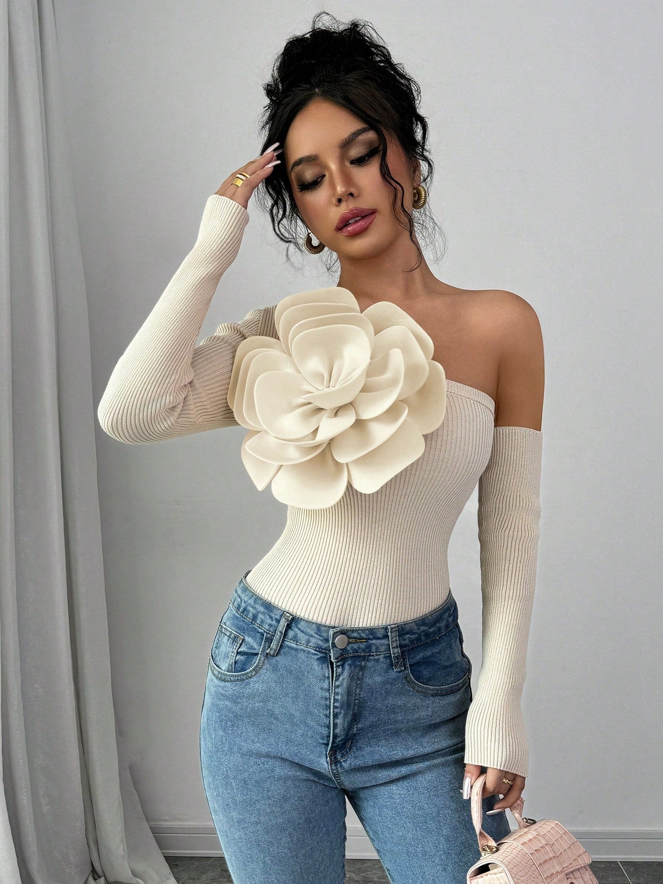 كنزة صوفية صوفية ضيقة للنساء مزينة بتفاصيل زهرية مع فتحة في الكتف ، مناسبة للخريف / الشتاء
