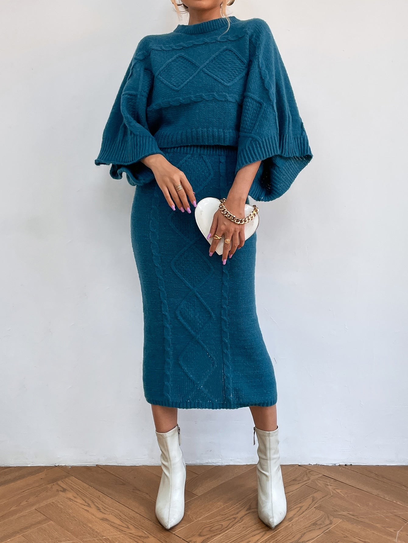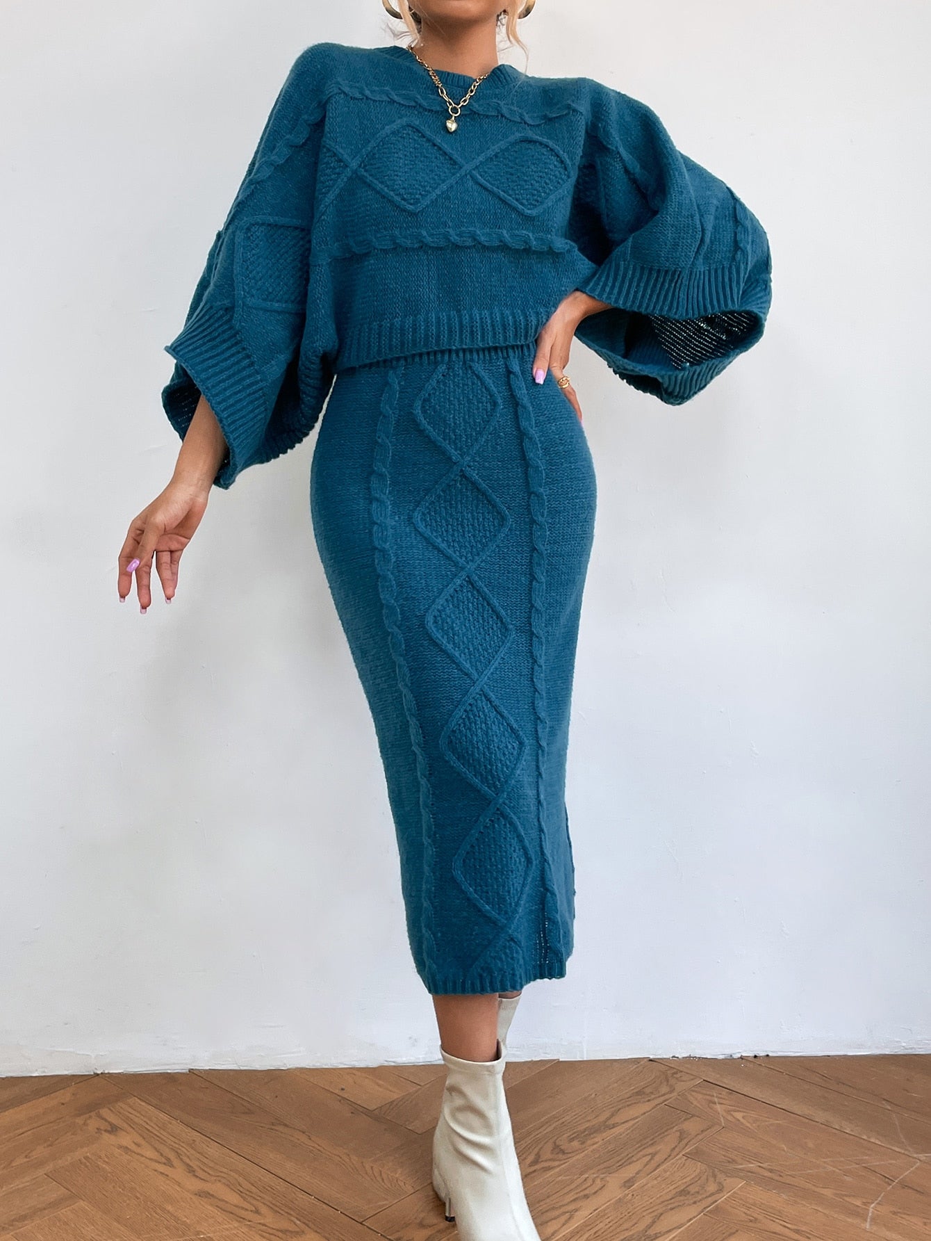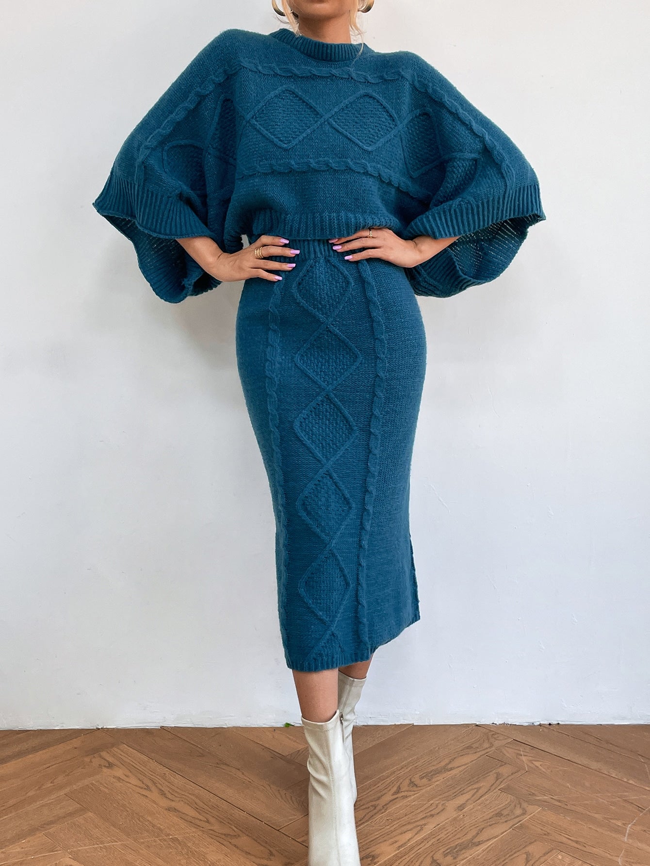 كنزة صوف اكمام جناح الخفاش منسوج مضفور وتنورة محبوكة شق خلفي بدون قميص
