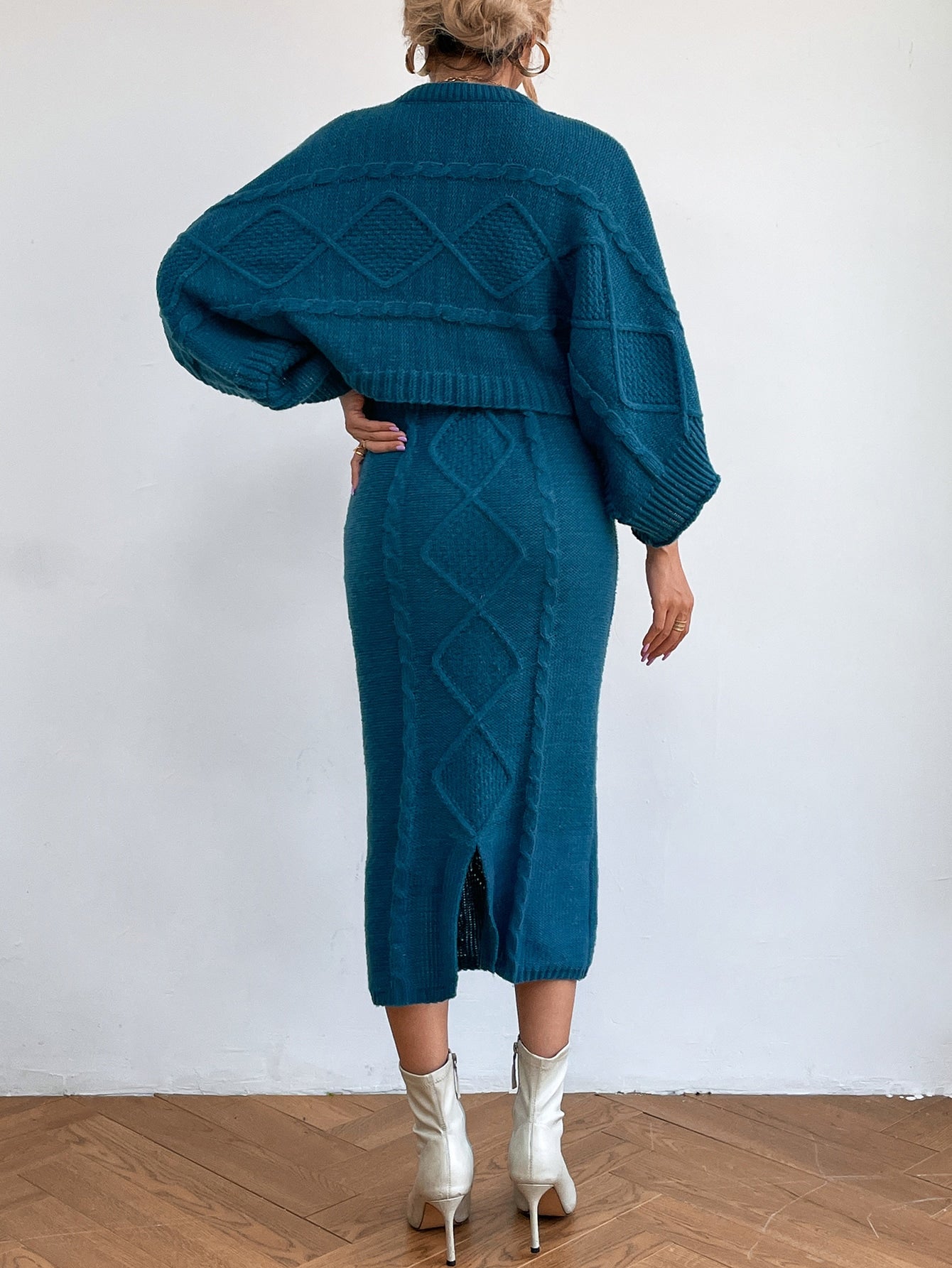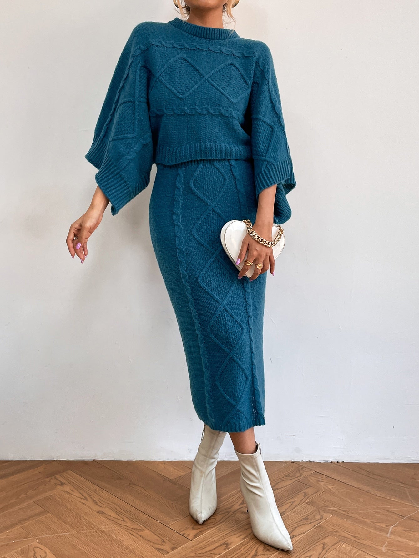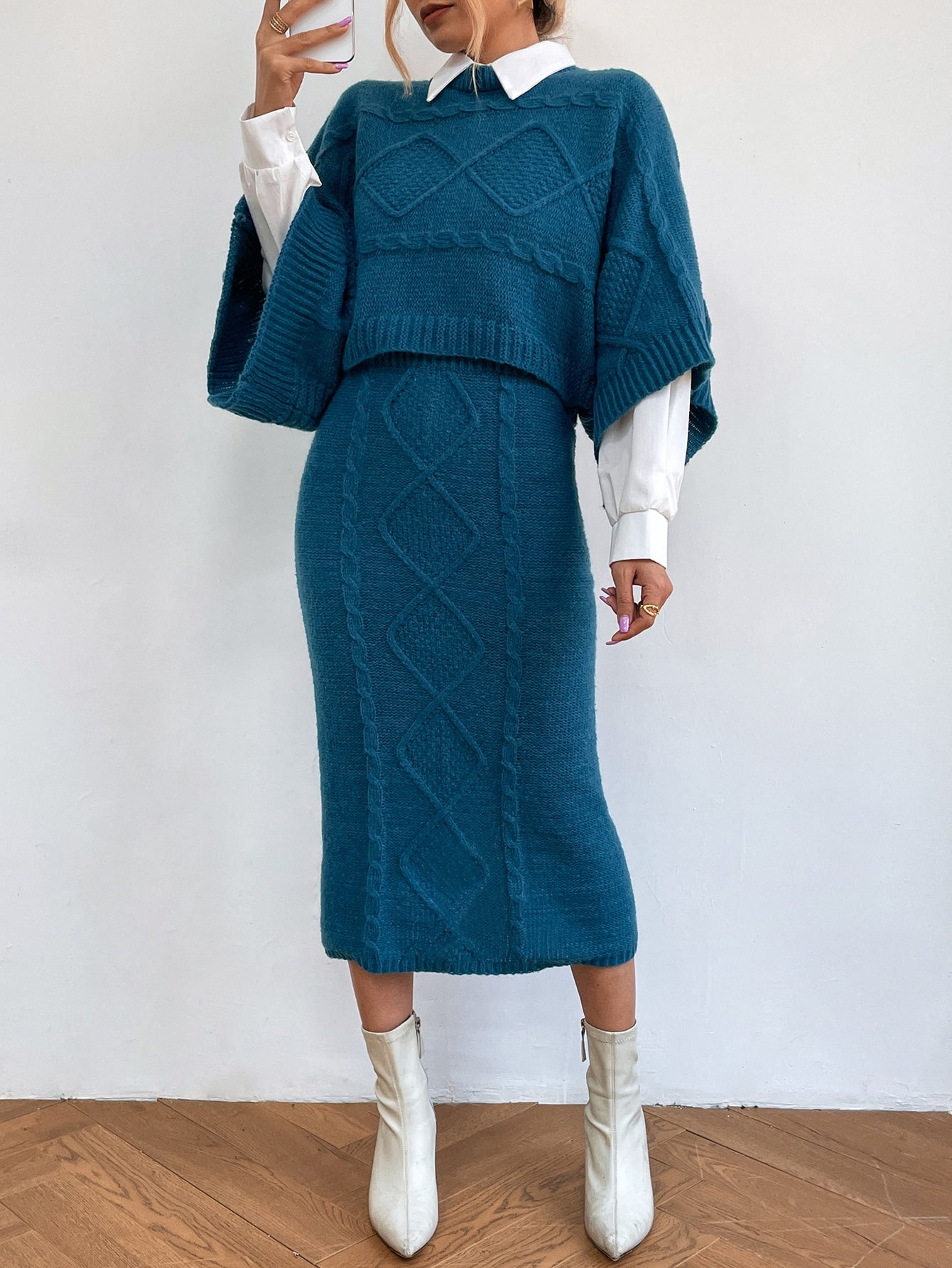 كنزة صوف اكمام جناح الخفاش منسوج مضفور وتنورة محبوكة شق خلفي بدون قميص
