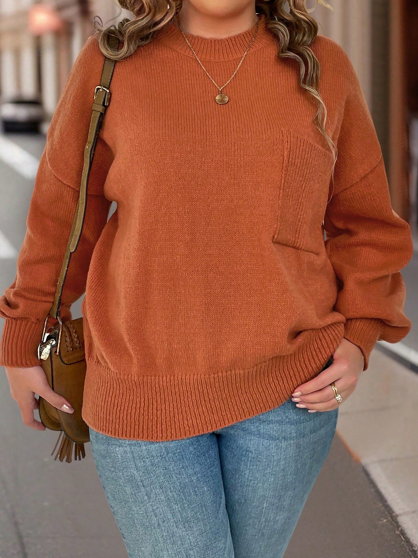 كنزة صوف منخفض الاكتاف جيب مرقع مقاس كبير