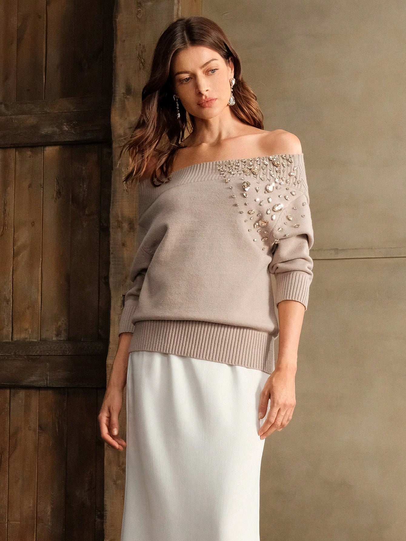 كنزة محبوكة بحلية منتجة يدويًا وبأكتاف مكشوفة، للخريف