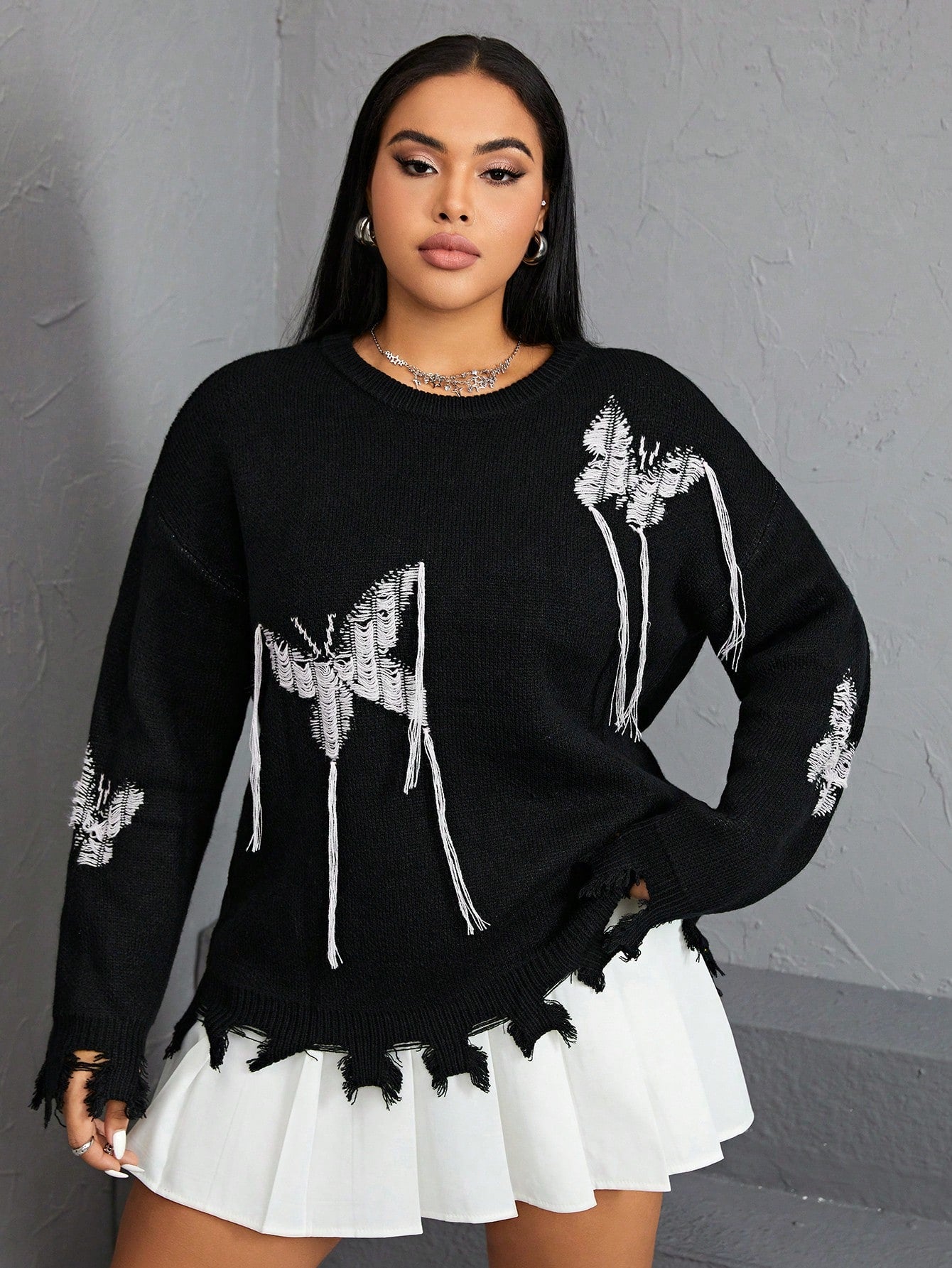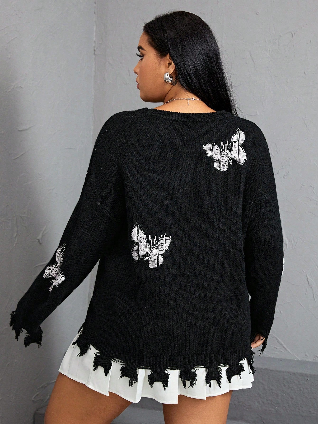 لباس علوي صوف ممزق جرافيك الفراشة منخفض الاكتاف