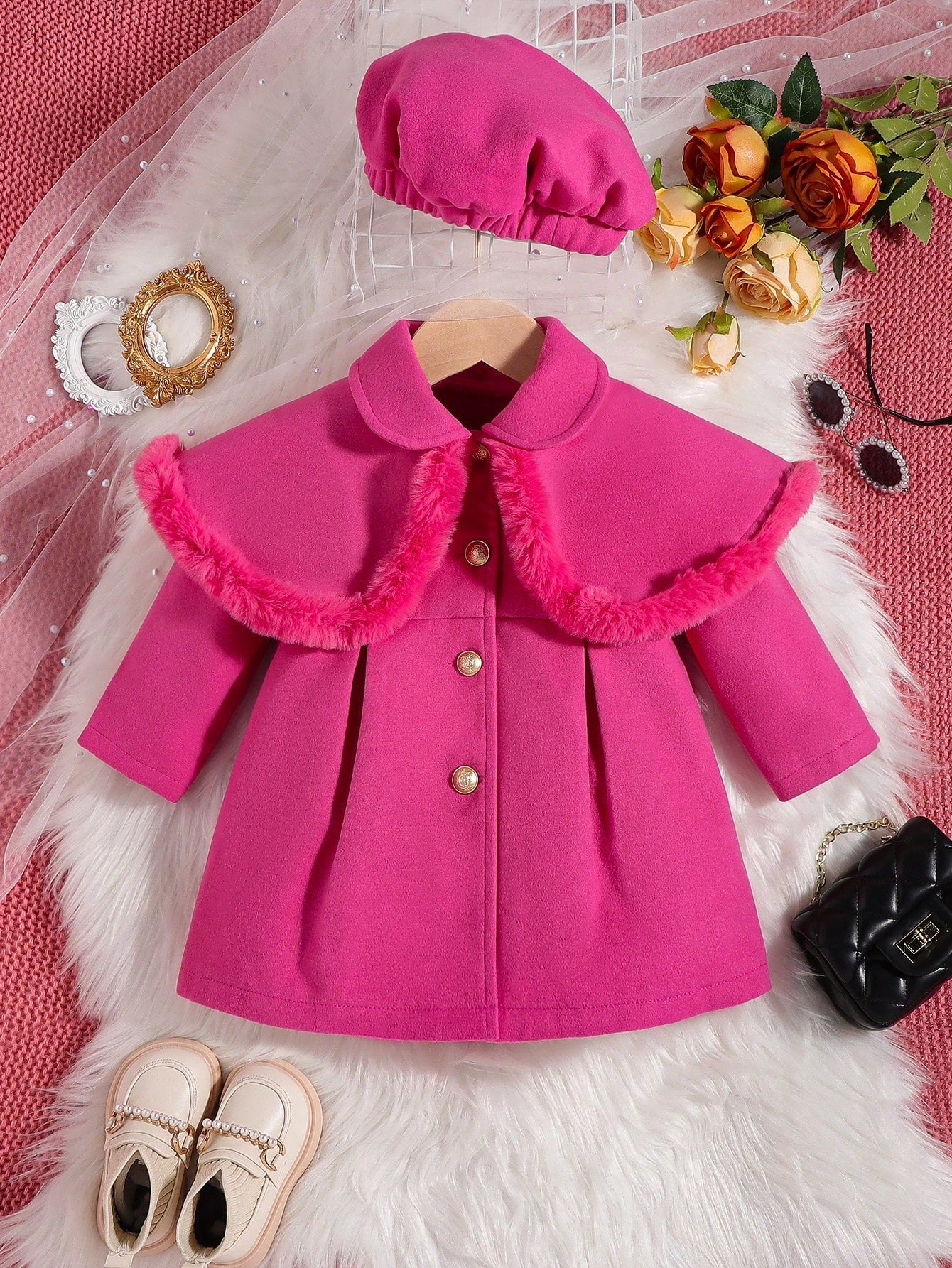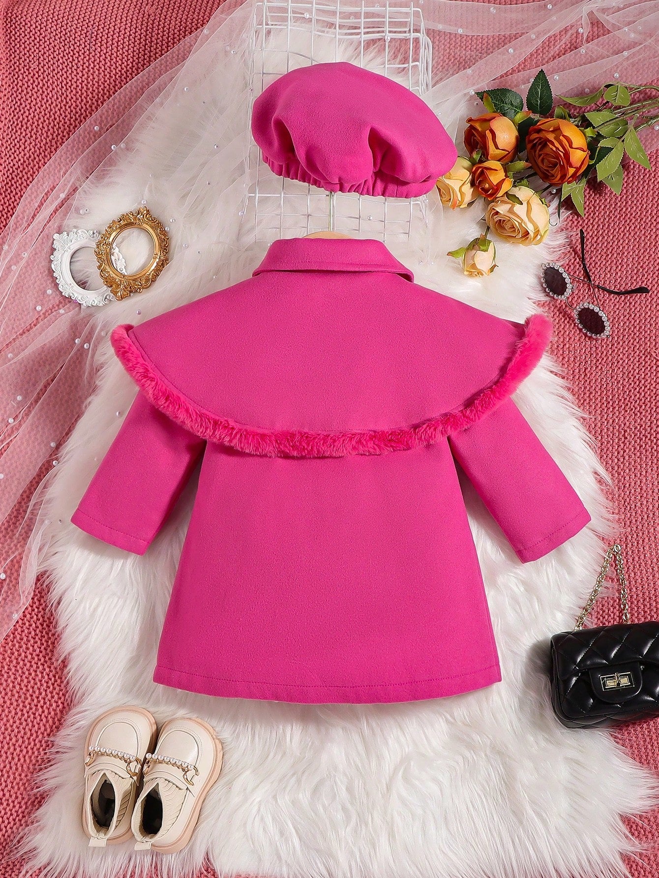 للبنات الاطفال مقلم زغبي تجاعيد مطوية معطف & قبعة