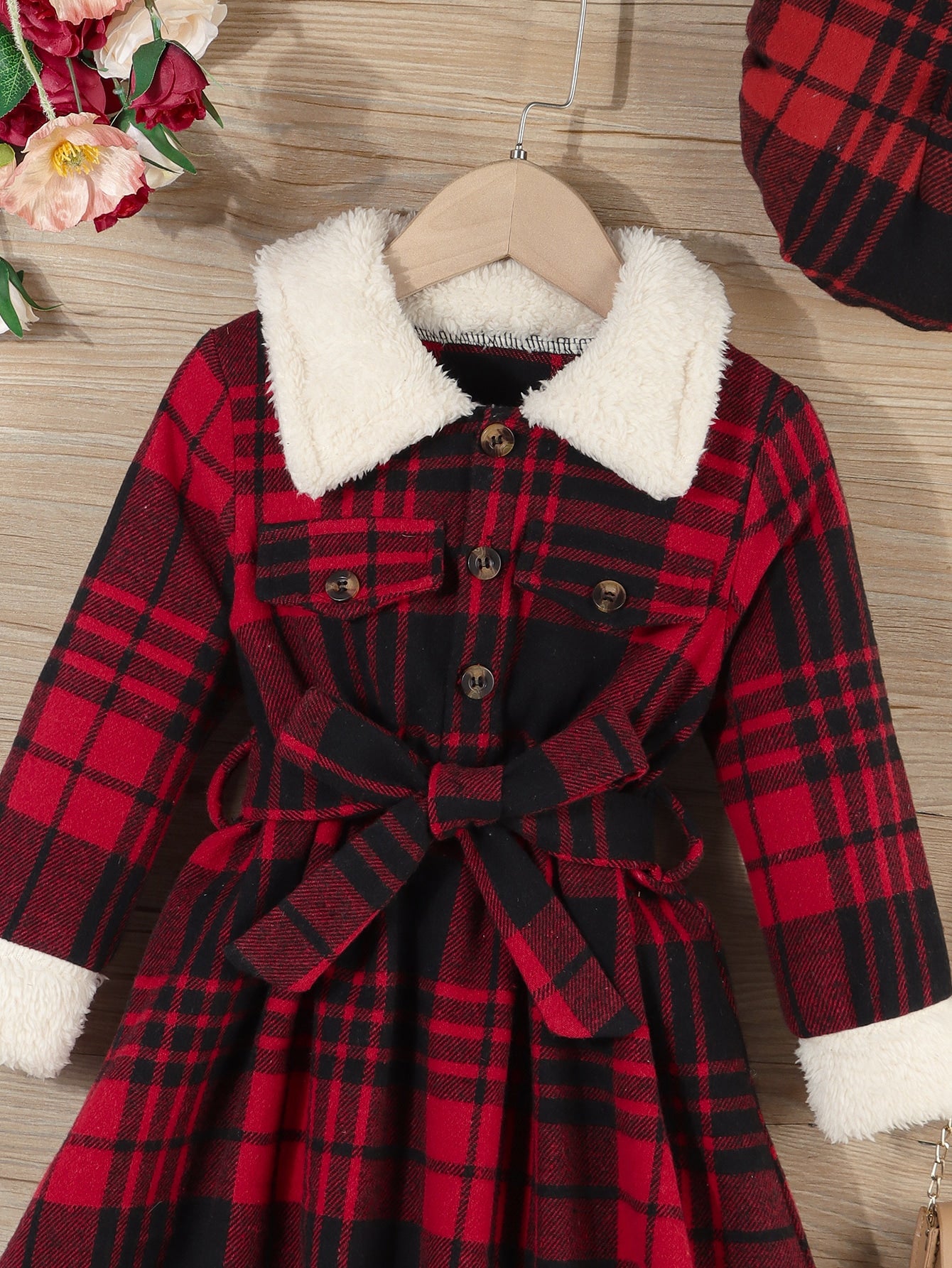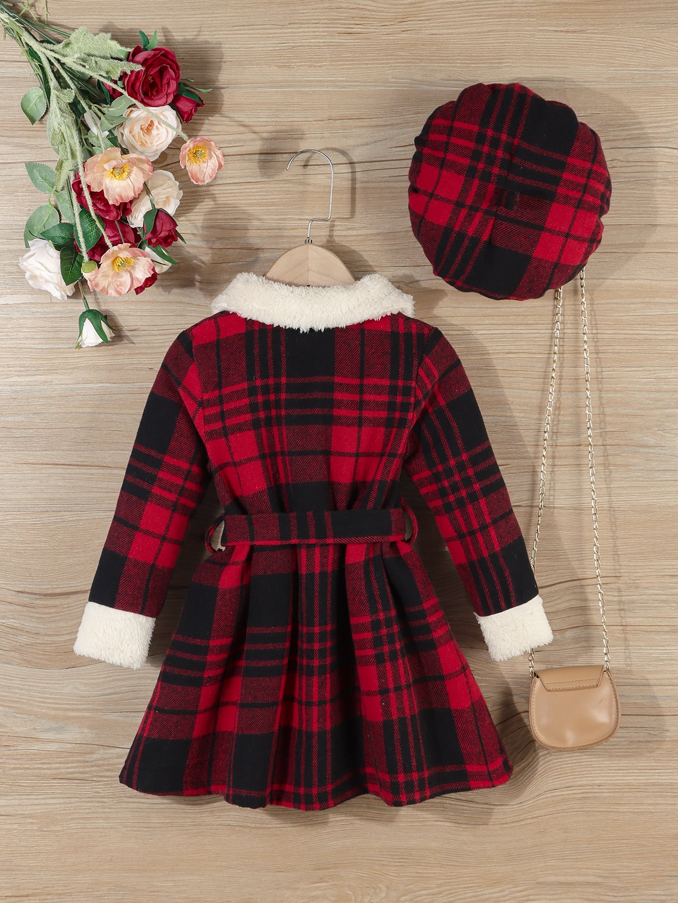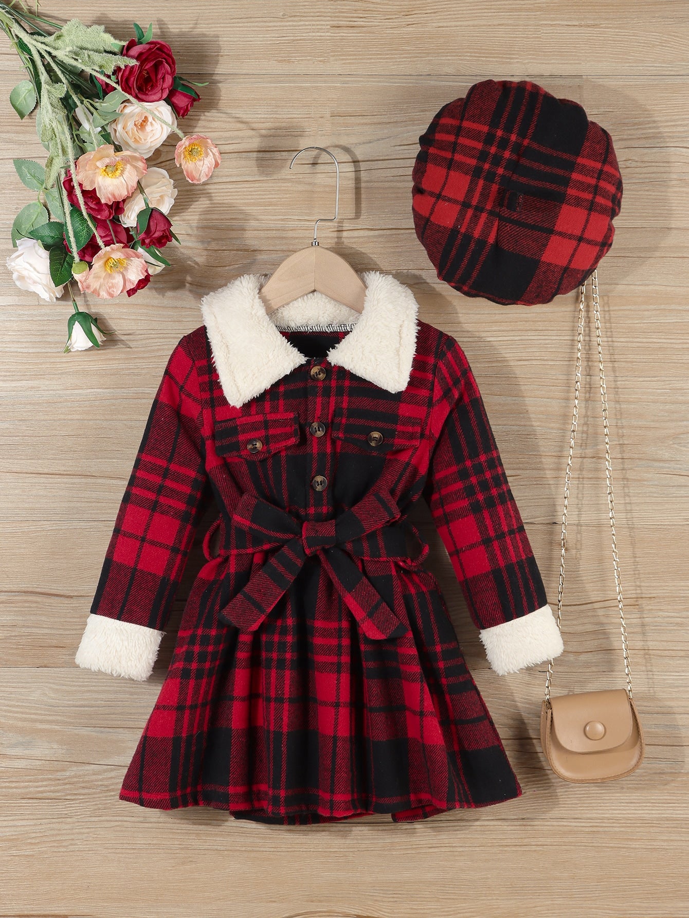 للبنات الصغار فستان بدون حزام مربعات ملونة ياقة بورغ و قبعة