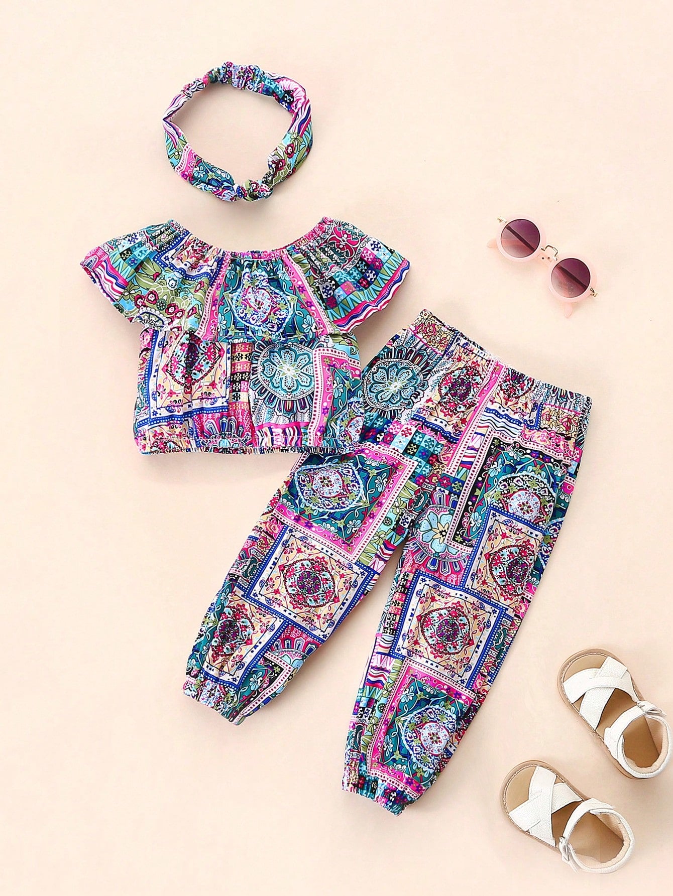 مجموعة الفتاة الرضيعة المكونة من القمة والبنطلون وعقال الملحقات مع طباعة الوشاح وشريط التمويه