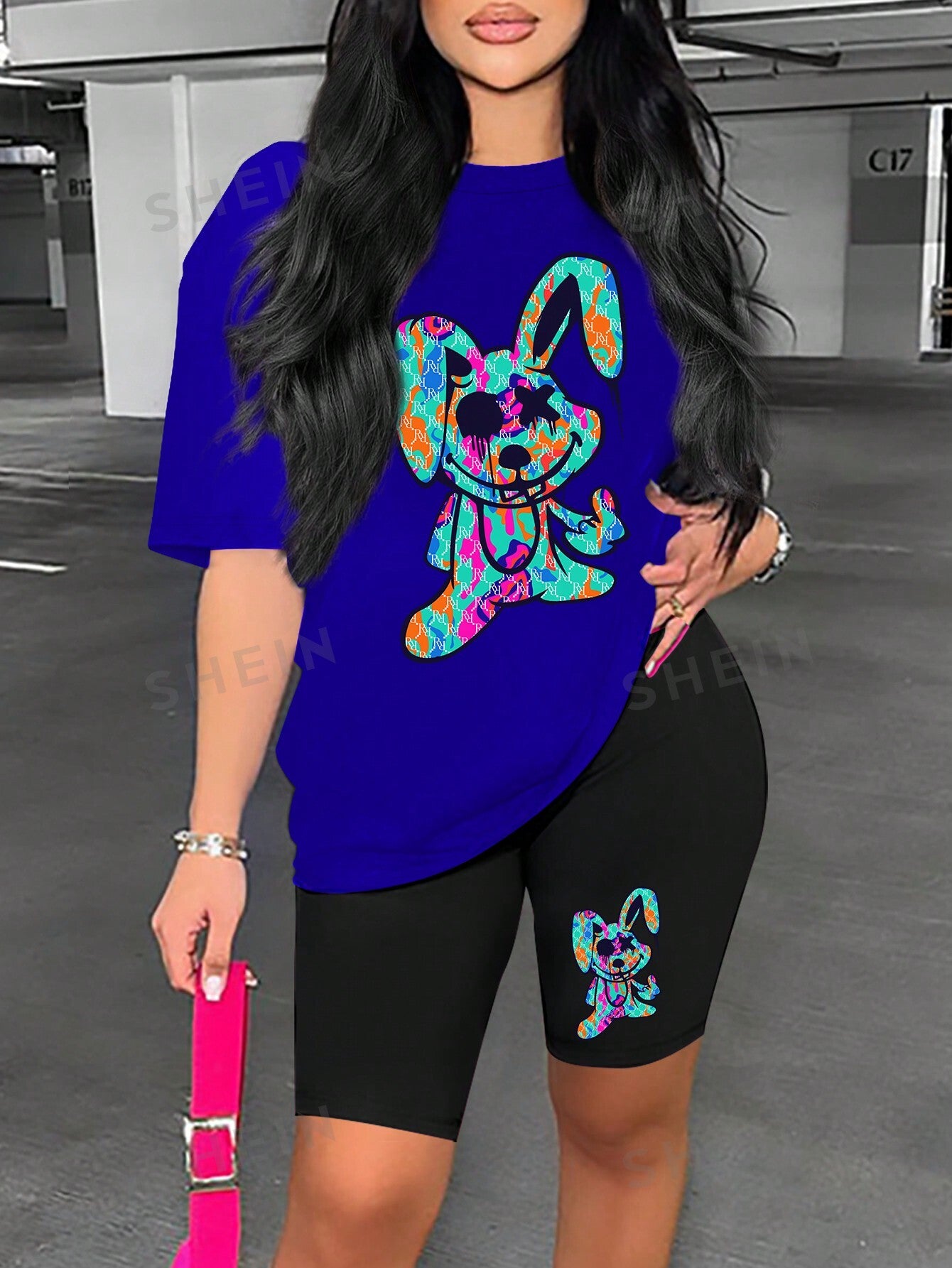 مجموعة القميص القصير ذو الياقة المستديرة بطبعة الأرنب الكرتوني للنساء في الصيف مع السراويل القصيرة