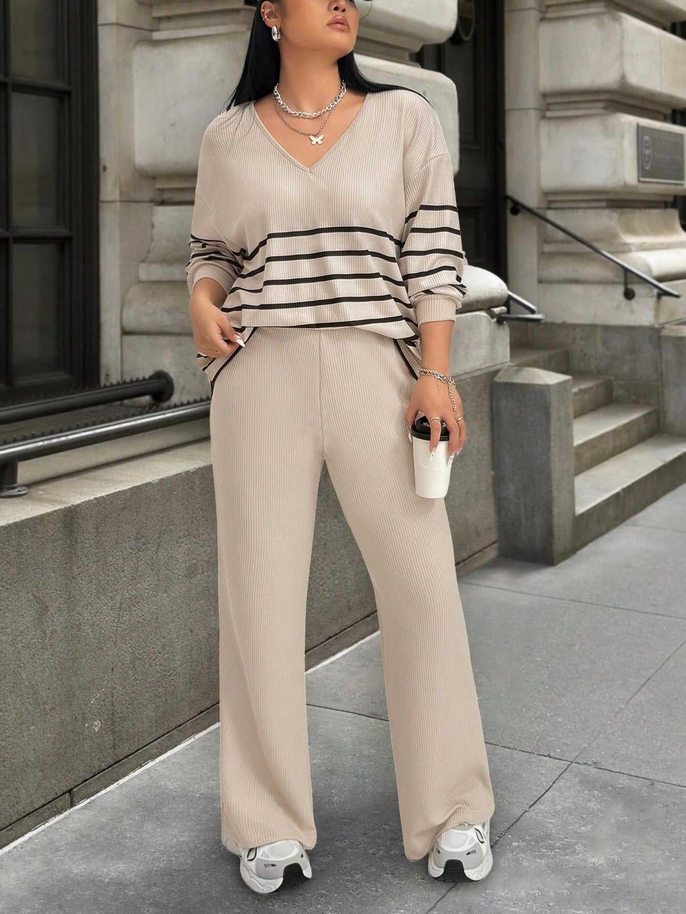 مجموعة بلوزة كم طويل وبنطلون كاجوال فضفاض بياقة V مخطط للسيدات زائدات الحجم، خريف/شتاء