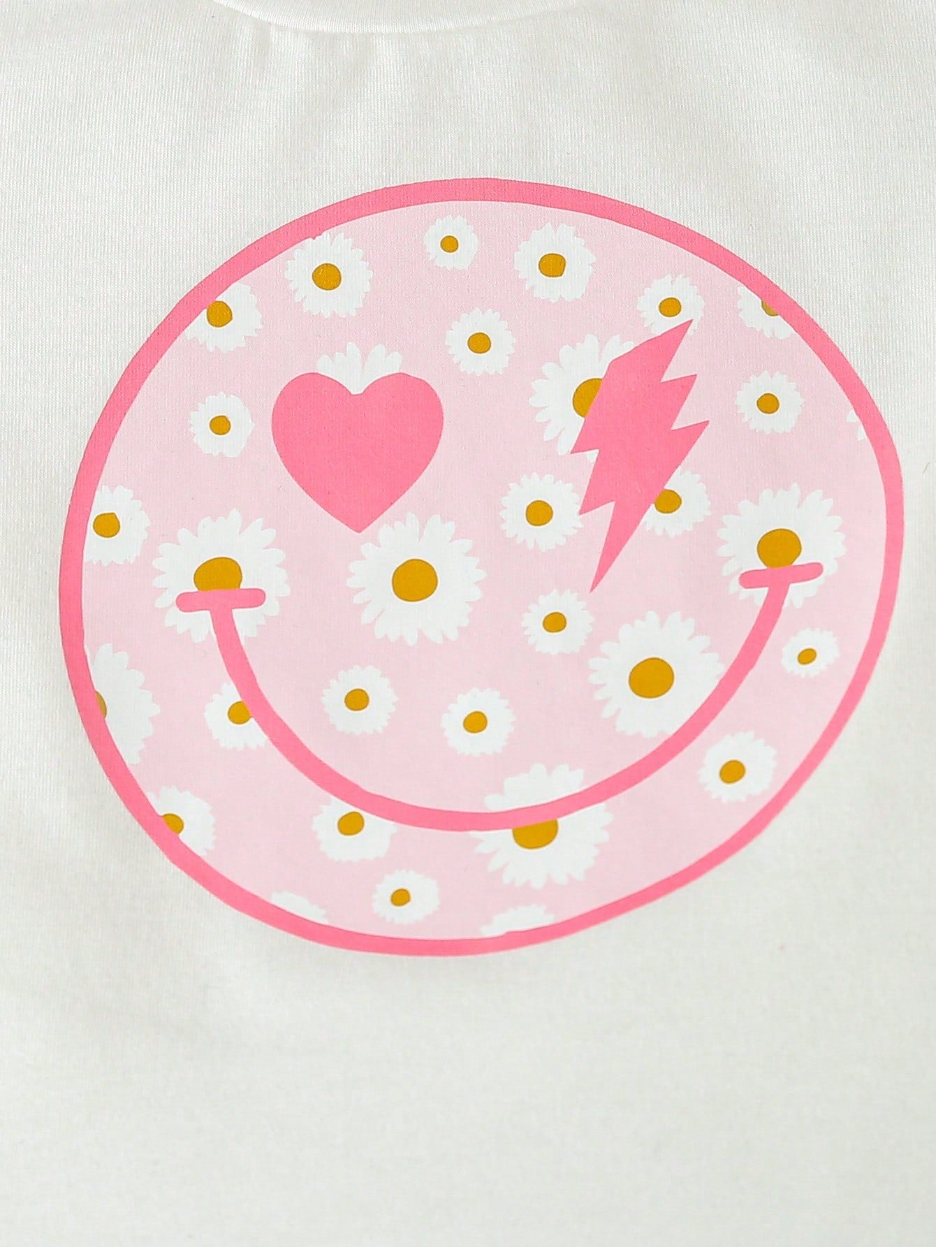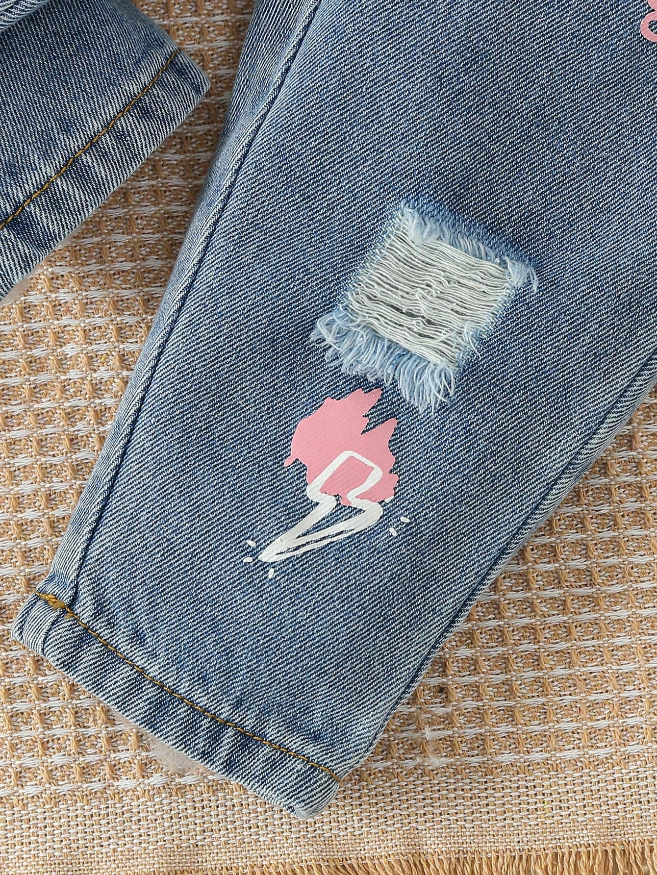 مجموعة تتكون من ملابس علوية طباعة وجه زهرة لطفلة و بنطلون جينز مطبوع بشعار