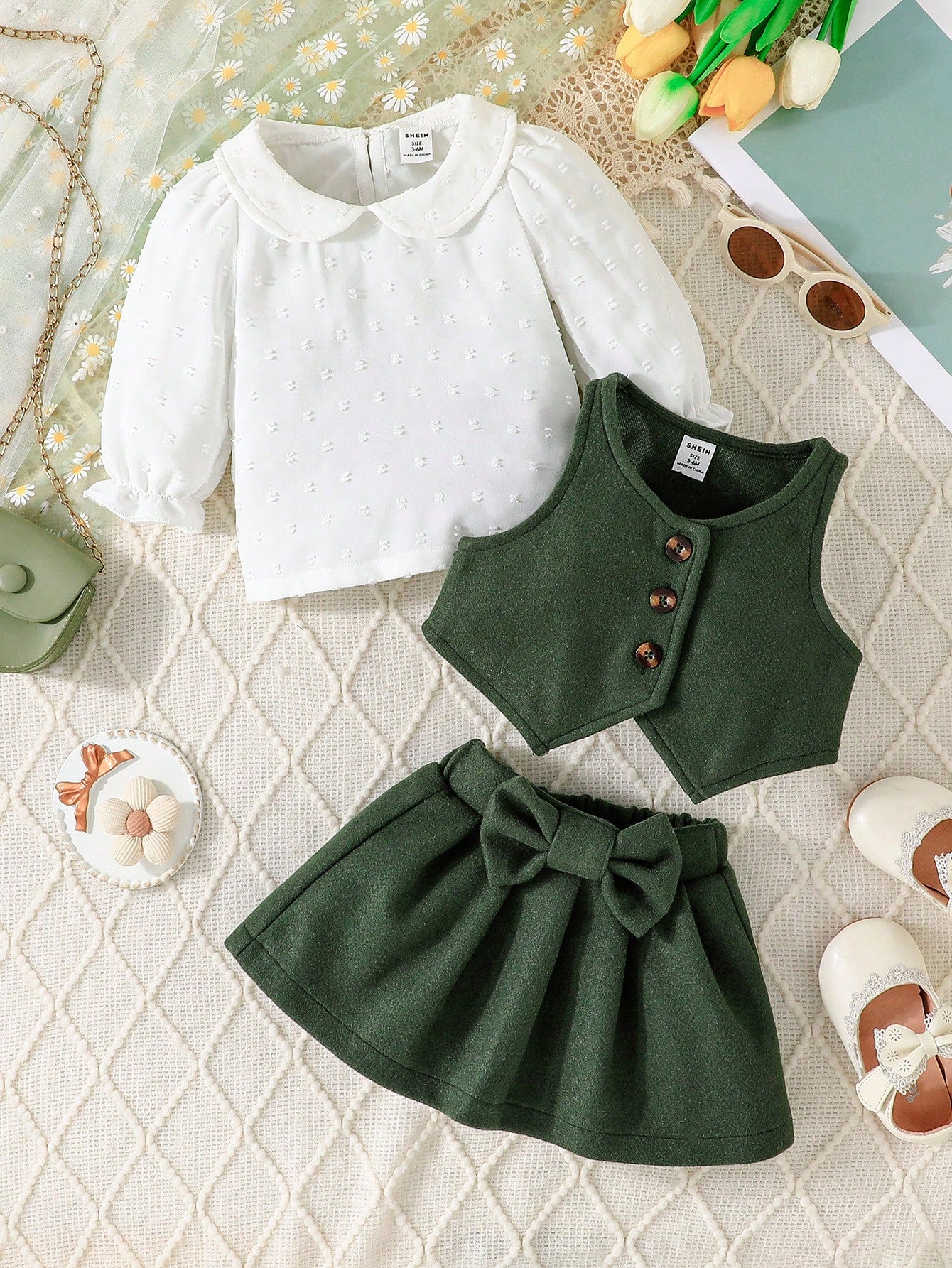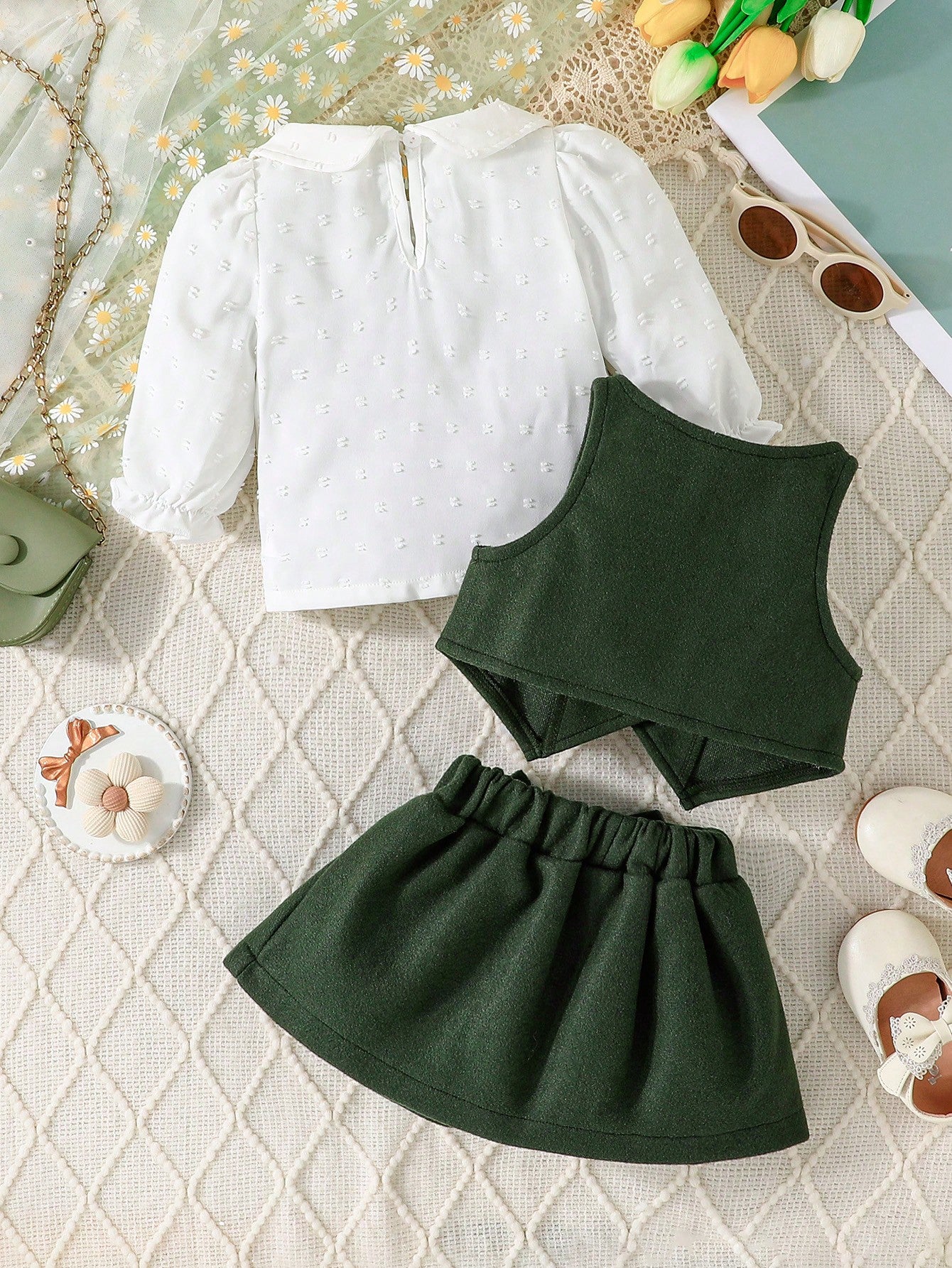 مجموعة تحتوي على ملابس علوية طويلة مزينةلأكمام جاكيت بأزرار بلا أكمام في الأمام، وتنورة