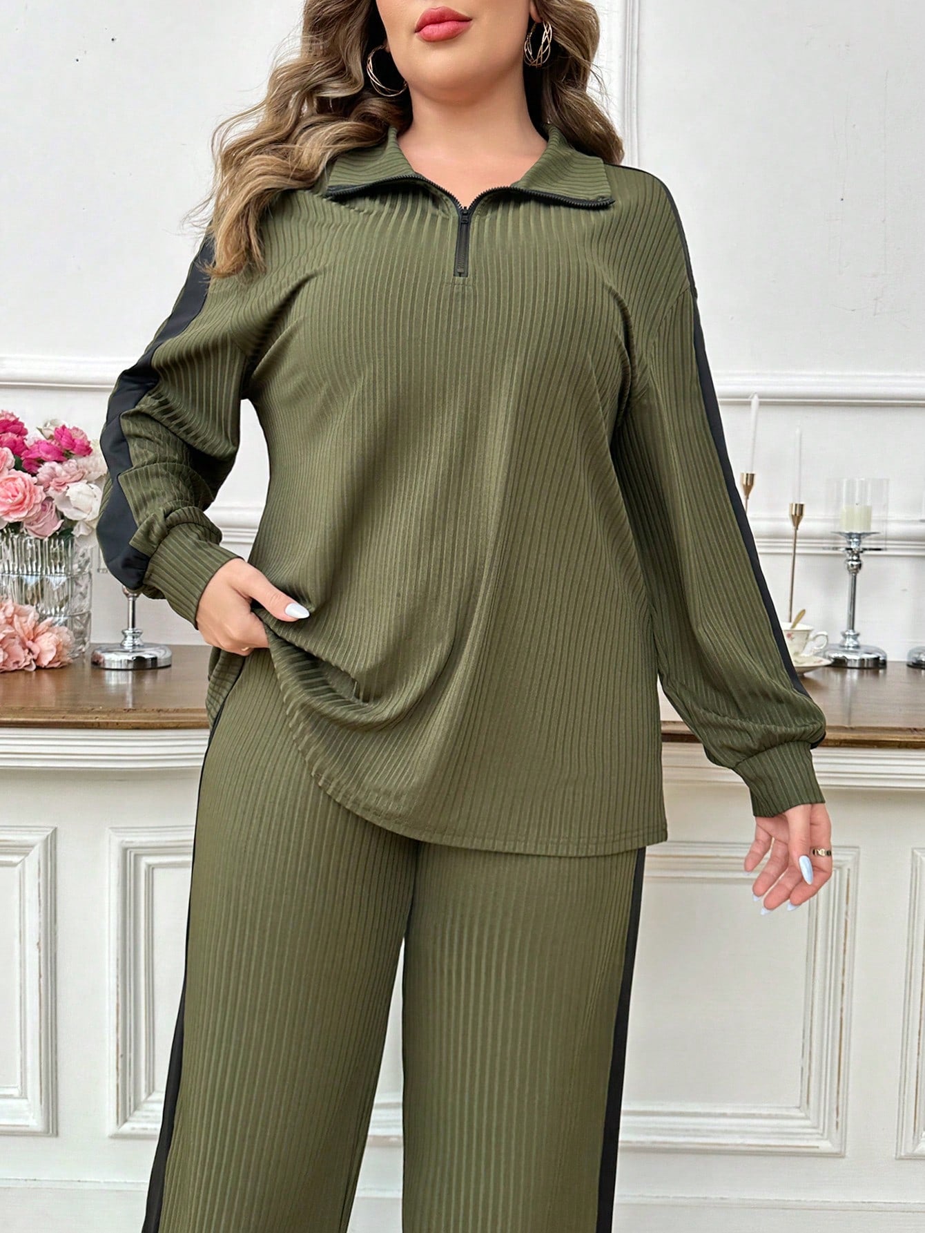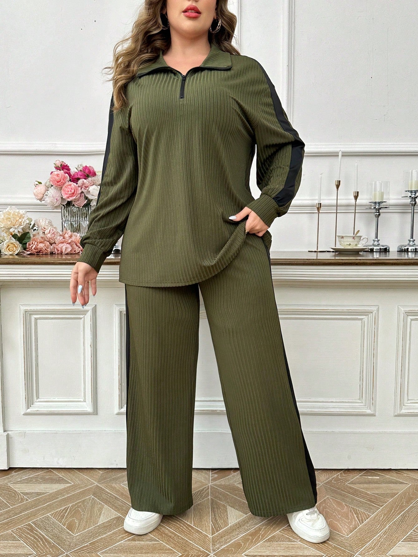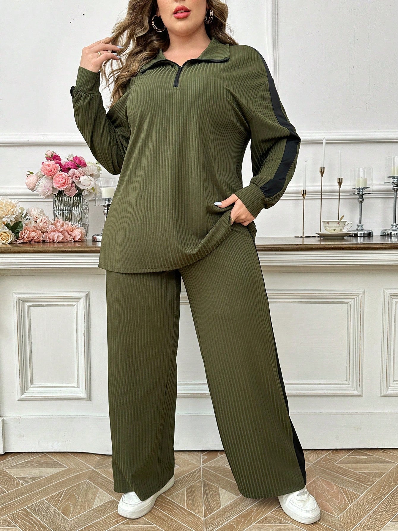 مجموعة قياس زائد قطعتين، ملابس علوية ذات أكمام طويلة سحاب باللونين وبنطال رجل مستقيم فضفاض للاستخدام اليومي