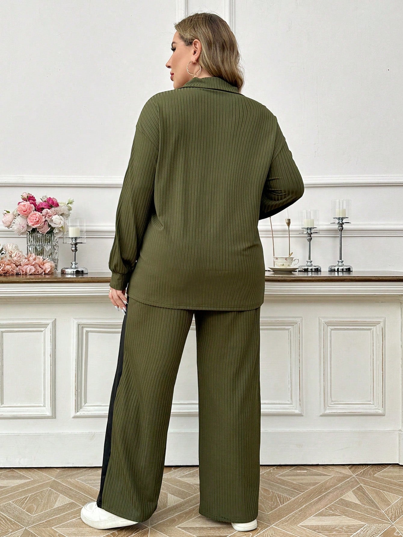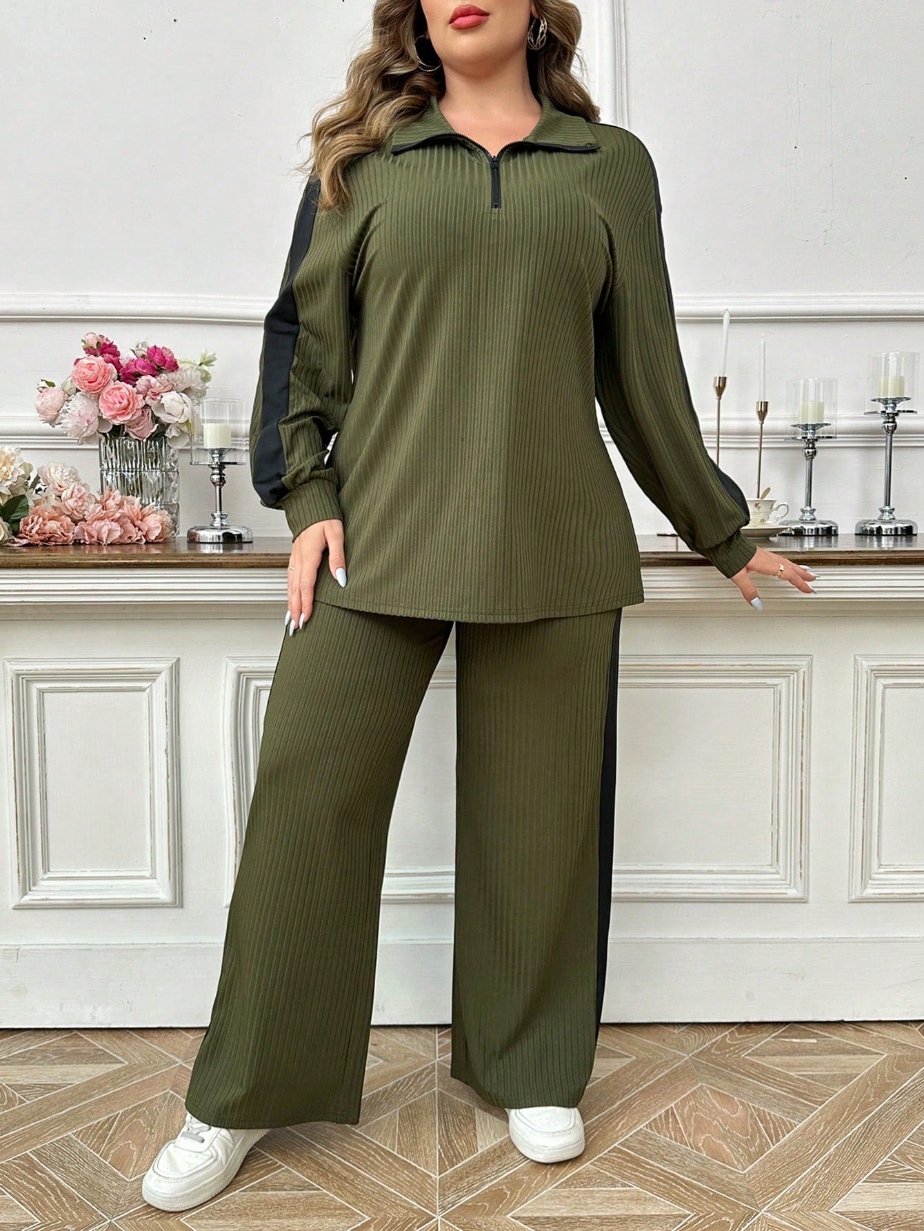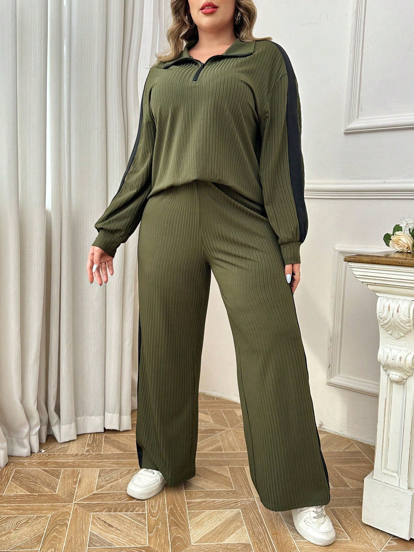 مجموعة قياس زائد قطعتين، ملابس علوية ذات أكمام طويلة سحاب باللونين وبنطال رجل مستقيم فضفاض للاستخدام اليومي