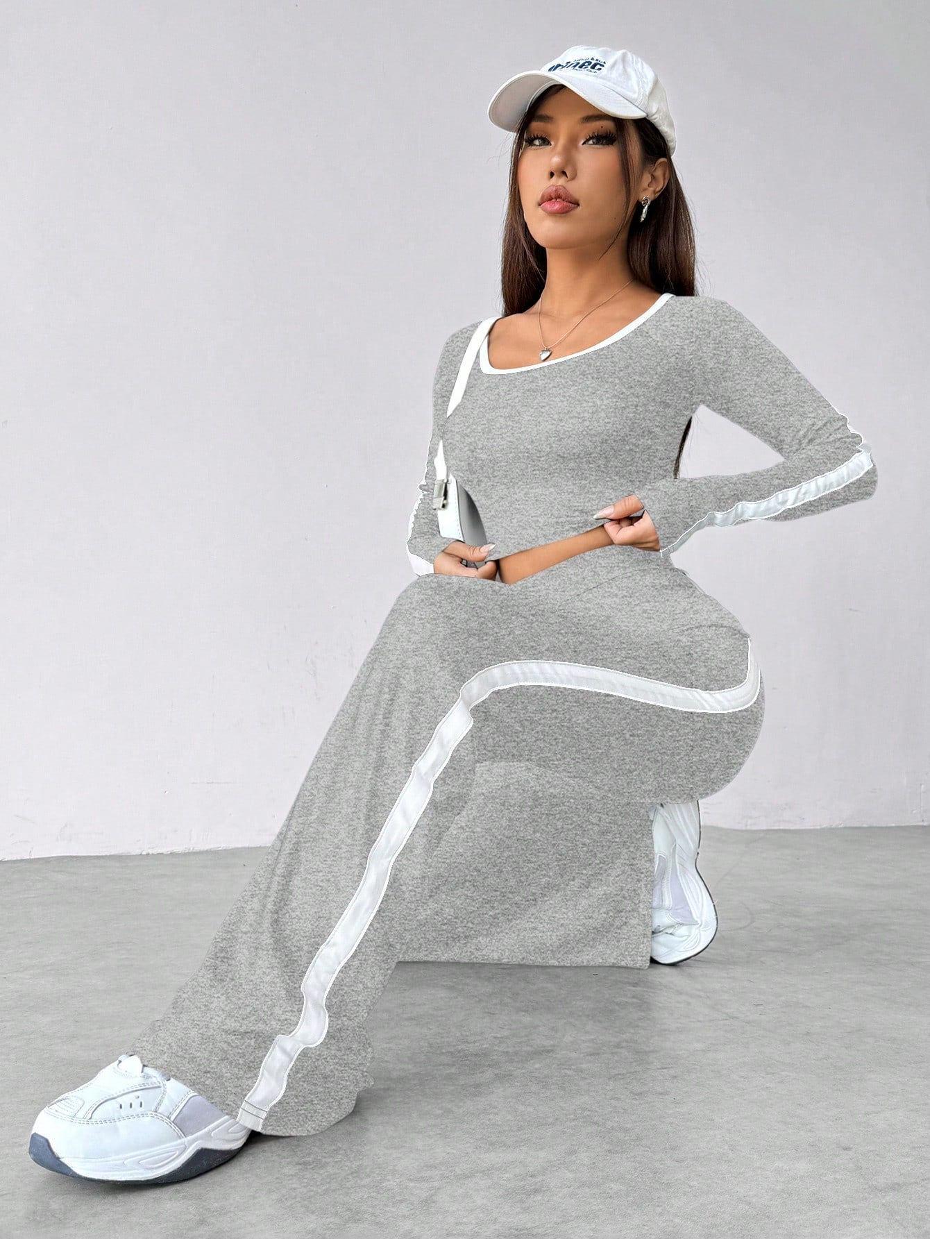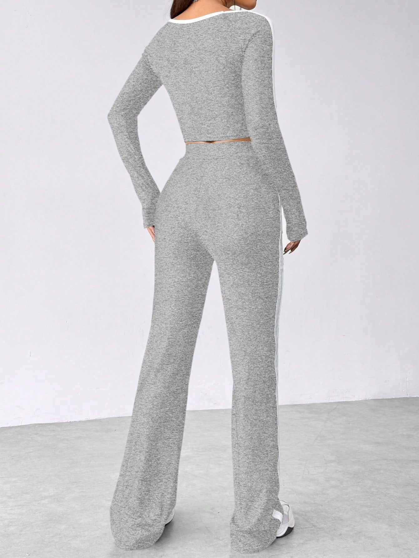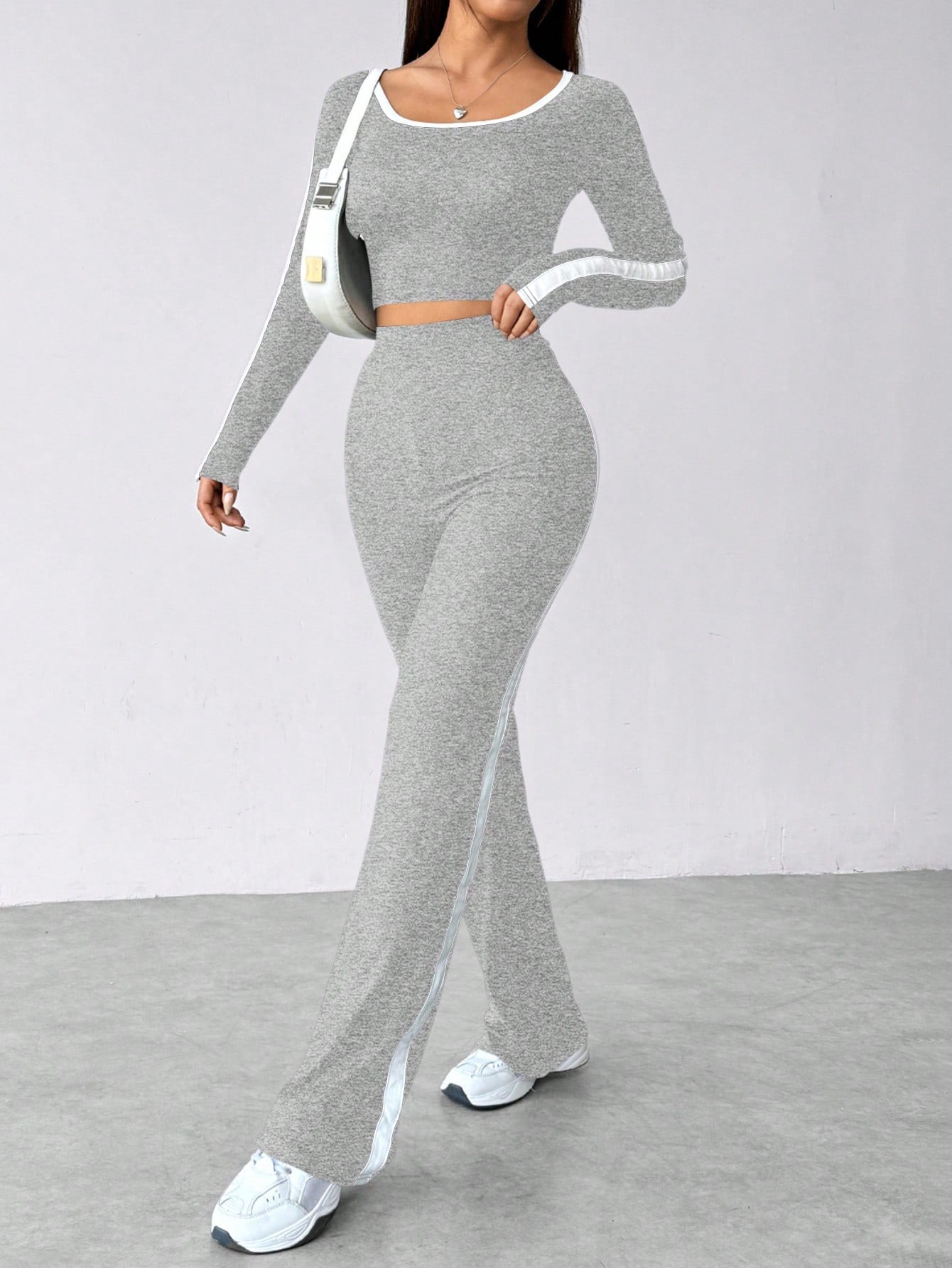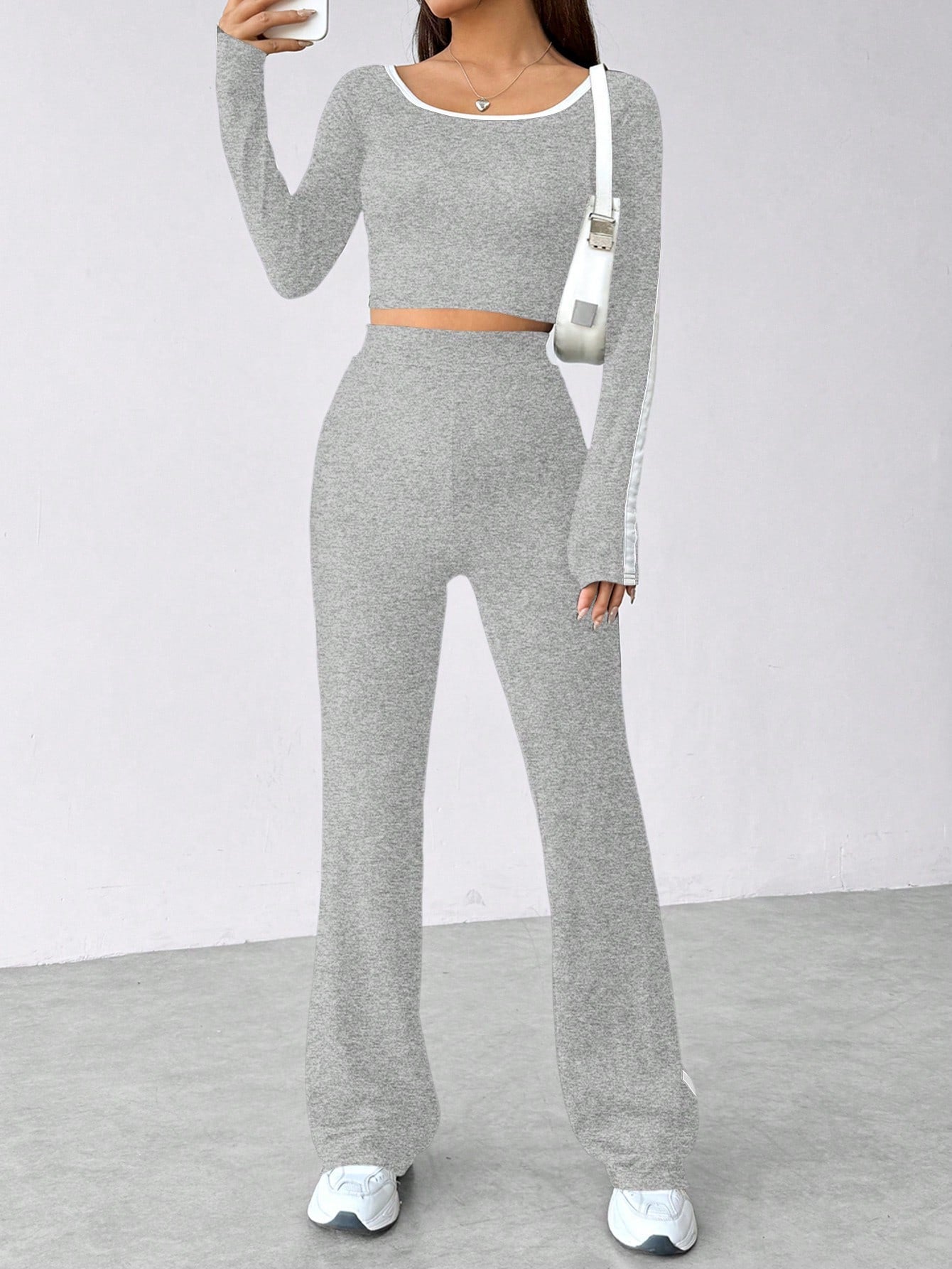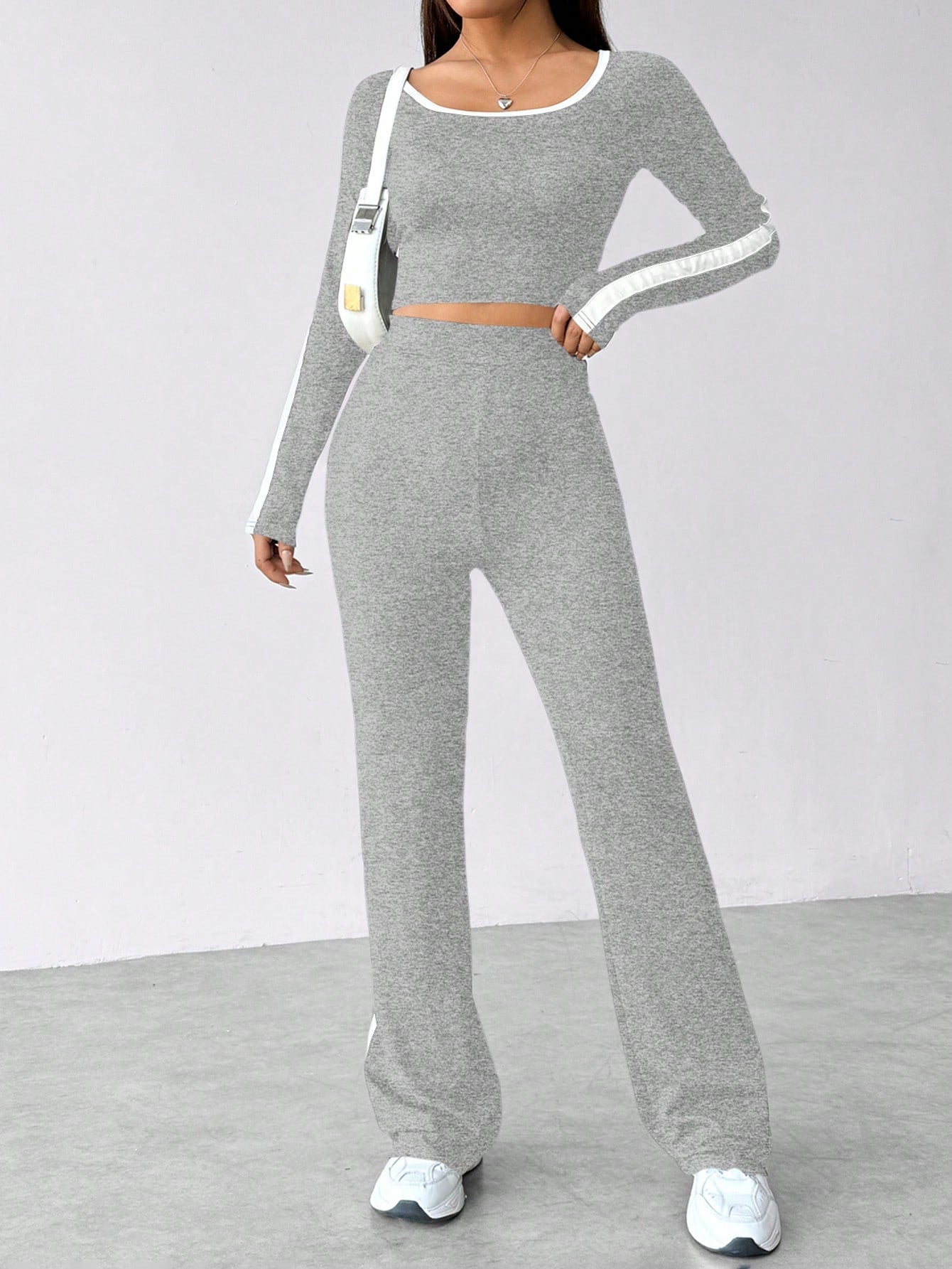 مجموعة كاجوال للنساء بياقة دائرية مع أكمام طويلة وسروال مع حواف بلونين مختلفين
