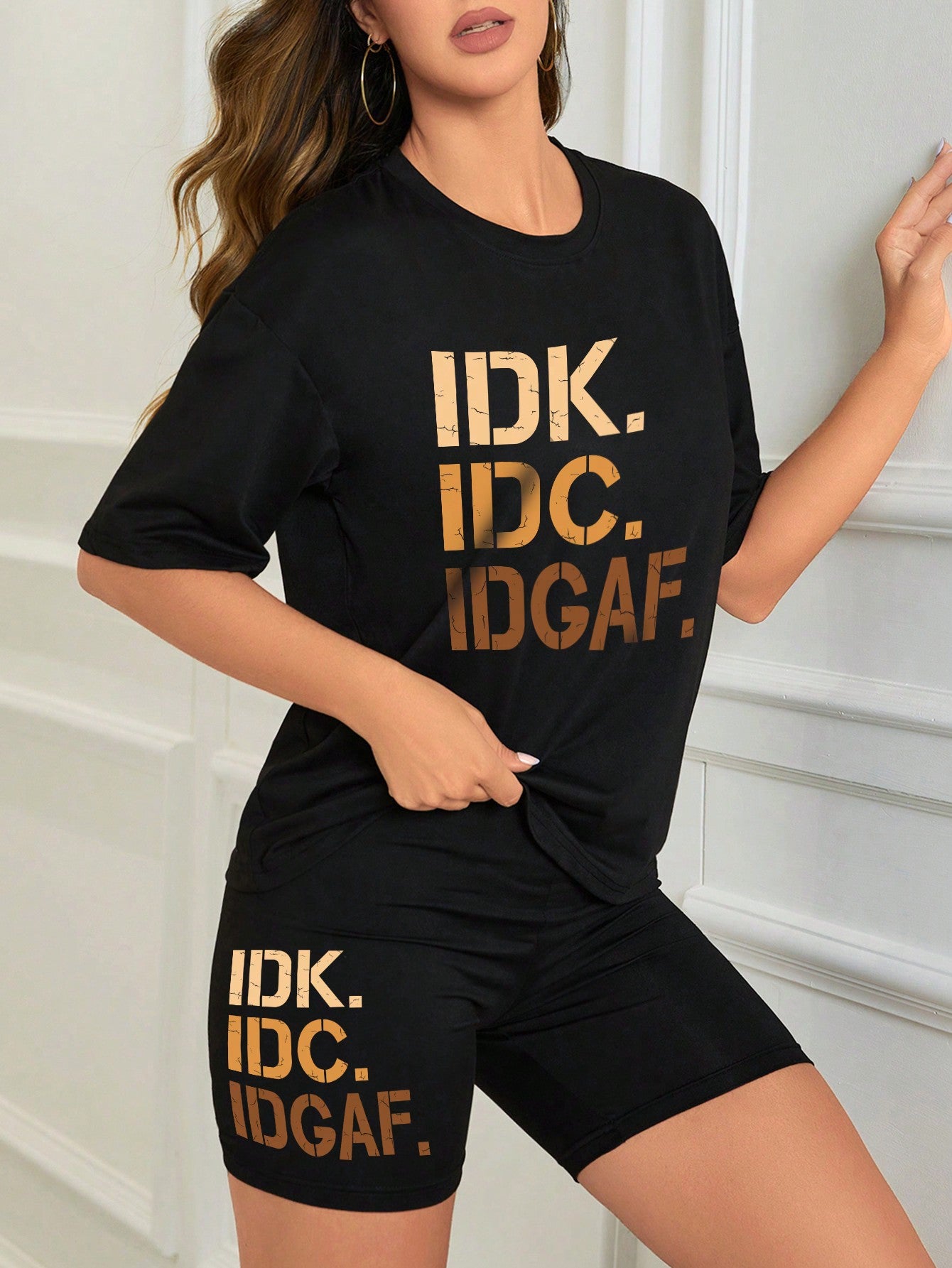 مجموعة مكونة من تي شيرت بأكمام قصيرة وسروال قصير مطبوع عليهم رسالة للسيدات المواكبات للموضة