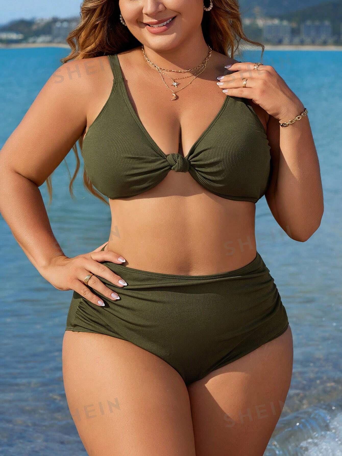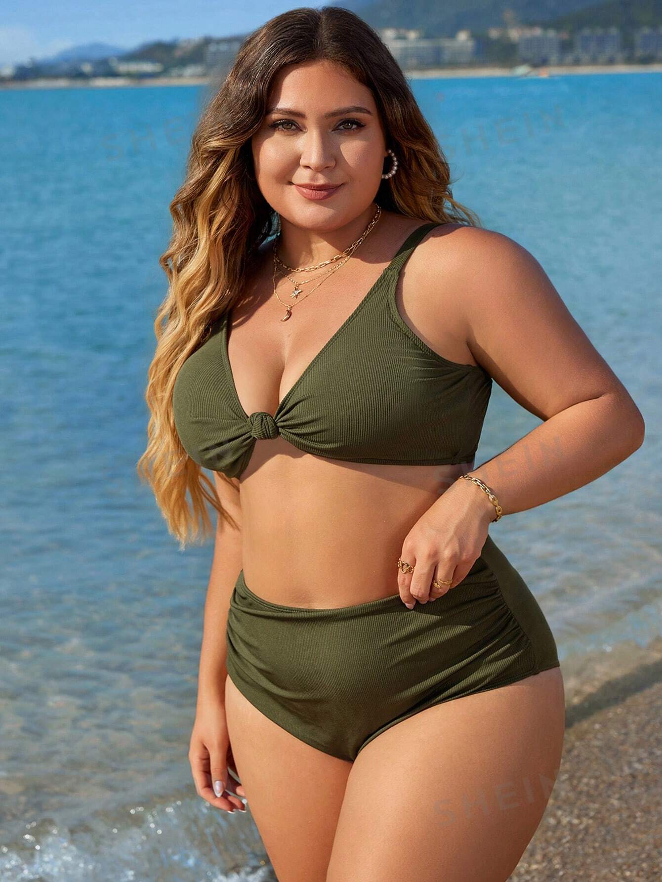 مجموعة ملابس سباحة مكونة من قطعتين للشاطئ بألوان صلبة ومضلعة مقاس كبير للصدر و قيعان البيكيني