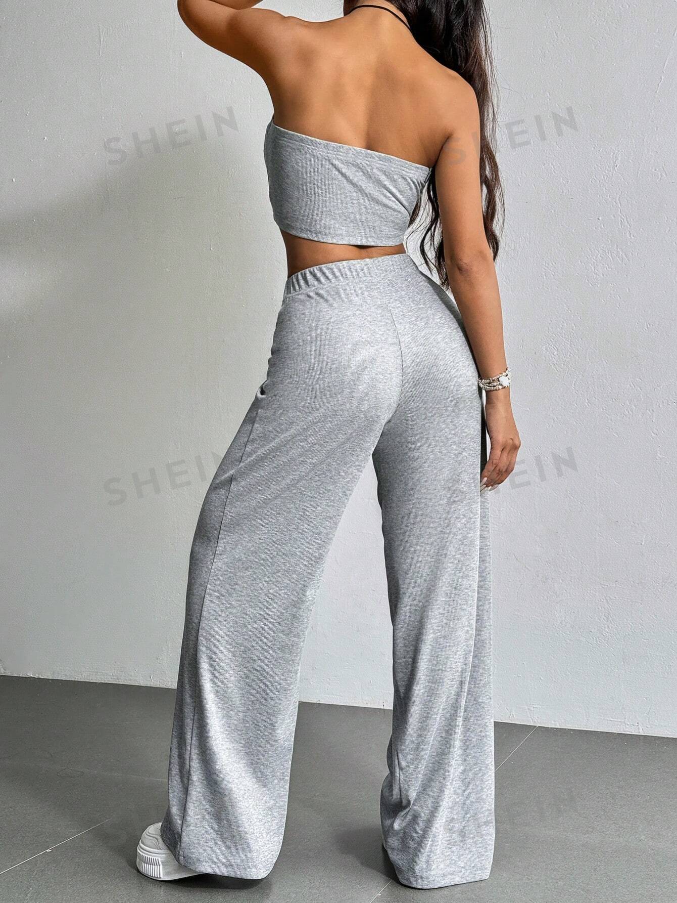 مجموعة نسائية مكونة من ملابس علوية صيفي بدون أكمام لون رمادي فاتح وبنطلون مريح محبوك